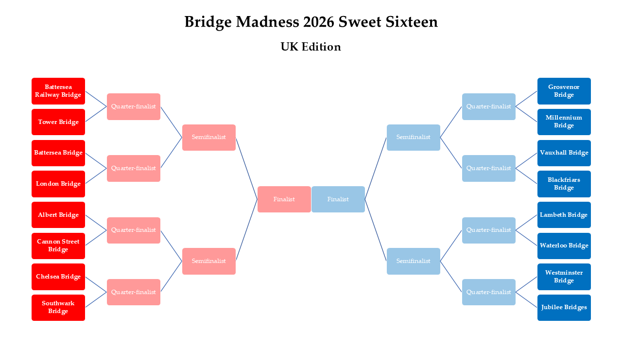 In the 2026 Bridge Madness Tournament, 16 London bridges go pier-to-pier in a reader’s choice tournament to pick the best one. I engaged with approximately 18 bridges across the River Thames on my last trip to London. Because the Blackfriars Station Railway Bridge was under construction when I was there, it is not included in this tournament. The Jubilee-Hungerford Bridges are either 1 or 3 bridges depending on how you count them. For the purposes of this tournament, we are counting them as 1 bridge to stay with our usual 16 tournament bridges.