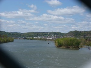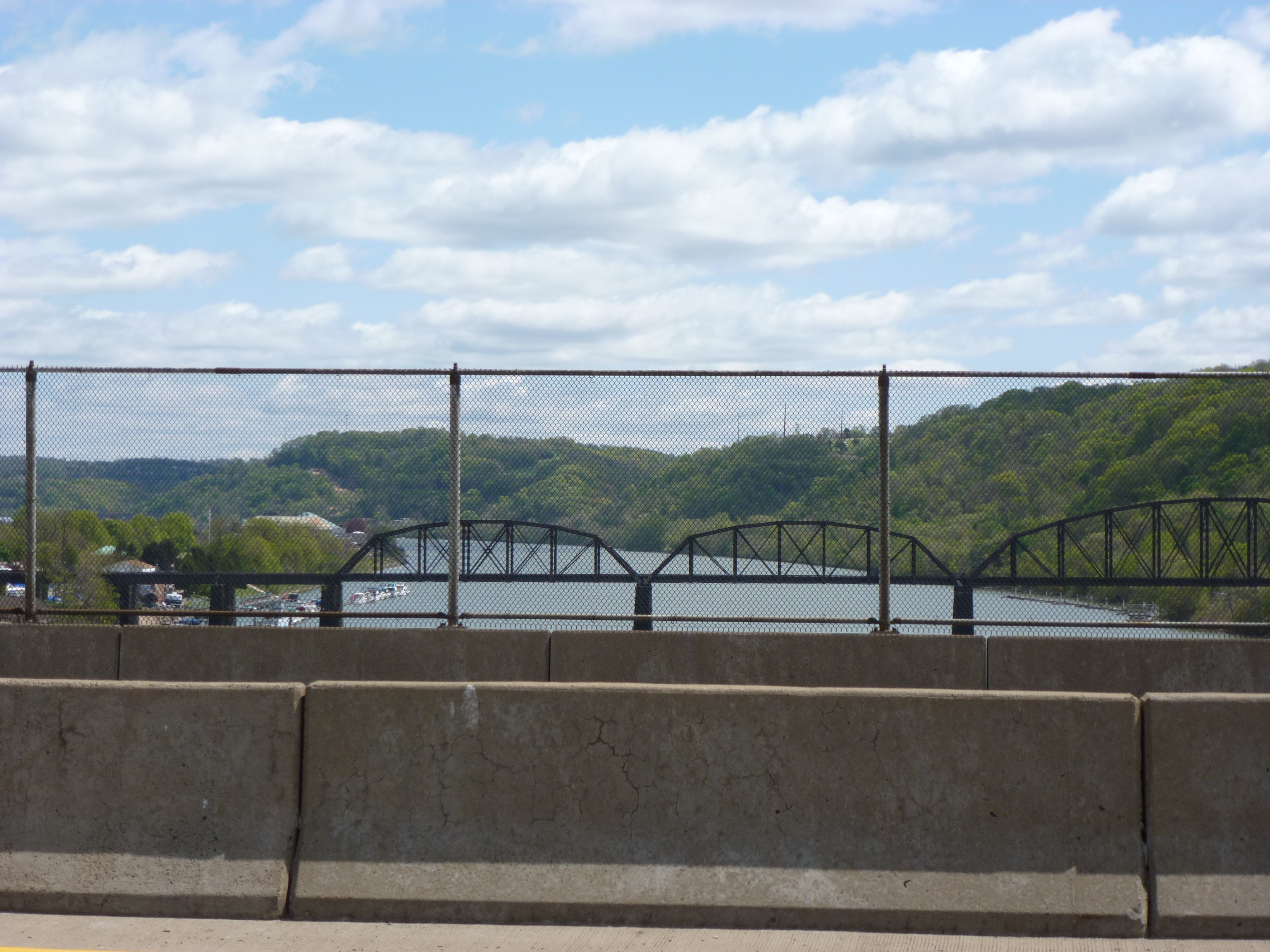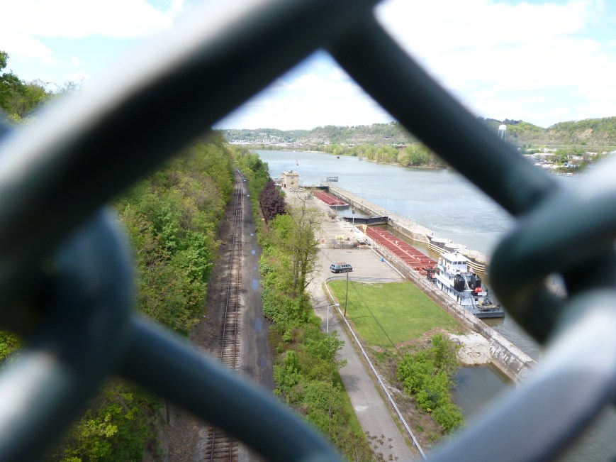 There a couple of sights of interest from the bridge. First is the lock. Quite serendipitously the day I brought my camera to document my crossing of the Highland Park Bridge was the only time I’ve crossed when the lock was in use. The one thing I couldn’t figure out is how they would get the first barge out of the lock when the tug boat is on the higher level water with the second barge.