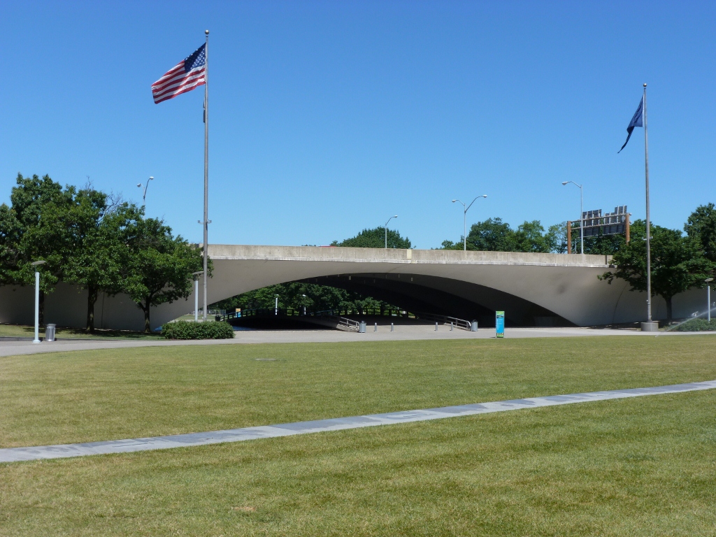 This pedestrian bridge is located in downtown Pittsburgh. As best as I can tell, this bridge was built in the early 1960s. The upper bridge is called the Portal Bridge, carries one of the interstates over the Point, and does not have pedestrian access so I will not be walking it or posting about it. The pedestrian bridge does not have its own name and is not included in PGHbridges.com’s list of bridges in Pittsburgh. It crosses over a reflecting pool to connect the two parts of Point State Park which are divided by the highway. It is the only access point from downtown to the park.
