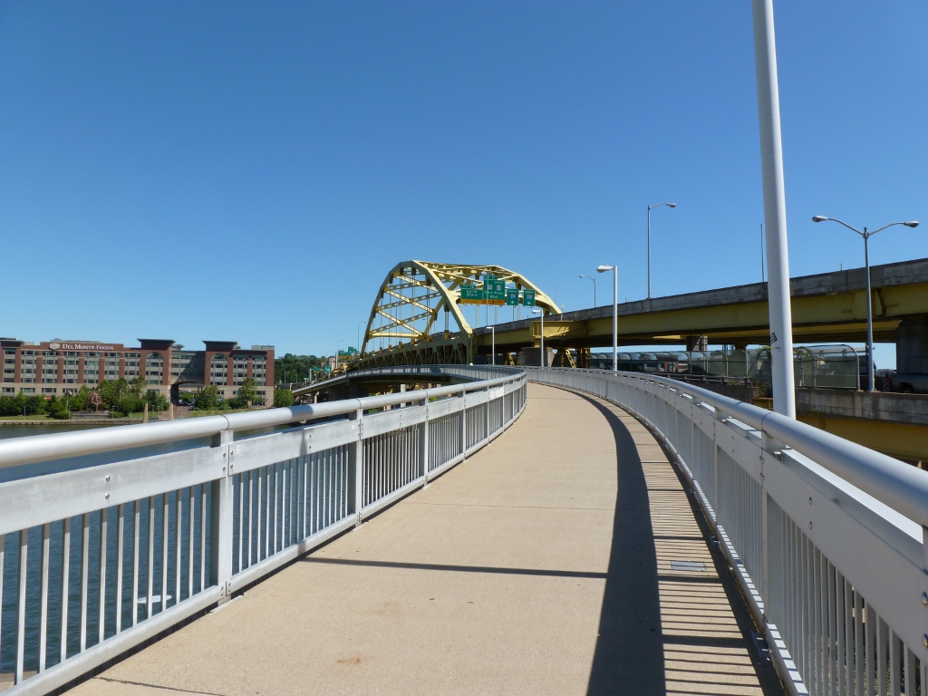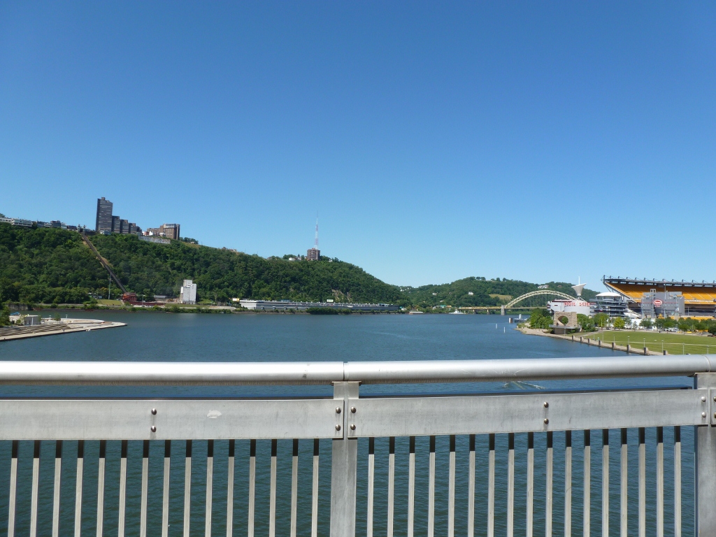 I was surprised by how new and clean this bridge appeared. Before crossing, I had my doubts as to whether there was a pedestrian path across the Allegheny at this point as Fort Duquesne Bridge carries one of the interstates and pedestrians and interstates do not usually go together. At first I thought the newness of this pedestrian bridge accounted for the presence of the pedestrian access, but then I saw the sidewalk to nowhere on the Fort Duquesne Bridge itself.