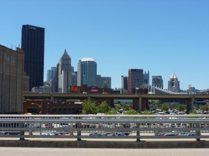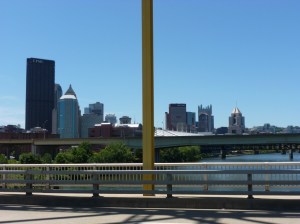 The view on the left of downtown fascinated me. It looks like there are two clumps of tall buildings (the yellow post doesn’t block any tall buildings). However, the view on the right supports something I heard in one of my classes which I sort of scoffed at at the time. I don’t remember exactly how it went, but it was something like the US Steel building (now labeled UPMC) was the center point of a triangle of downtown buildings and as such had to be the tallest. I think part of the reason I had an issue with it was because the building is located in the middle of a side of the triangle and so the term “apex” or “center point” or whatever the teacher used didn’t fit my sense of geometry. Actually, regardless of the term used, having the center of the base of a triangle as the focal point doesn’t match my sense of geometry. However, in the view from the 16th Street Bridge, I can accept the US Steel building as the tallest and therefore a focal point because from this view, the buildings gradually increase in height until reaching it.