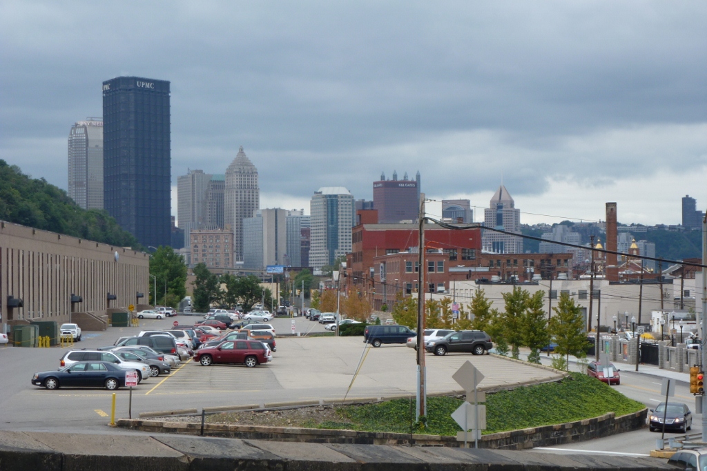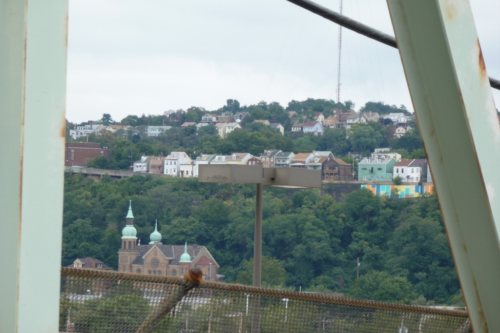 Across the river in Troy Hill, another site of contention within the city is visible. The former St. Nicholas Church pictured above is the sister to the St. Nicholas Church I saw from the 40th Street Bridge (see post), has been vacant since 2004, and has been locked in a battle between preservationists and the parish for over a year. The parish wants to demolish the building that it cannot afford to maintain and many people have called an eyesore, while the preservationists want to preserve the building. This summer a county judge ruled in favor of the parish (see article), but the city has threatened to appeal this decision (see article). The building is certainly architecturally interesting, however it is in a horrible location, smack up against route 28, which I believe provides the only access to the building.