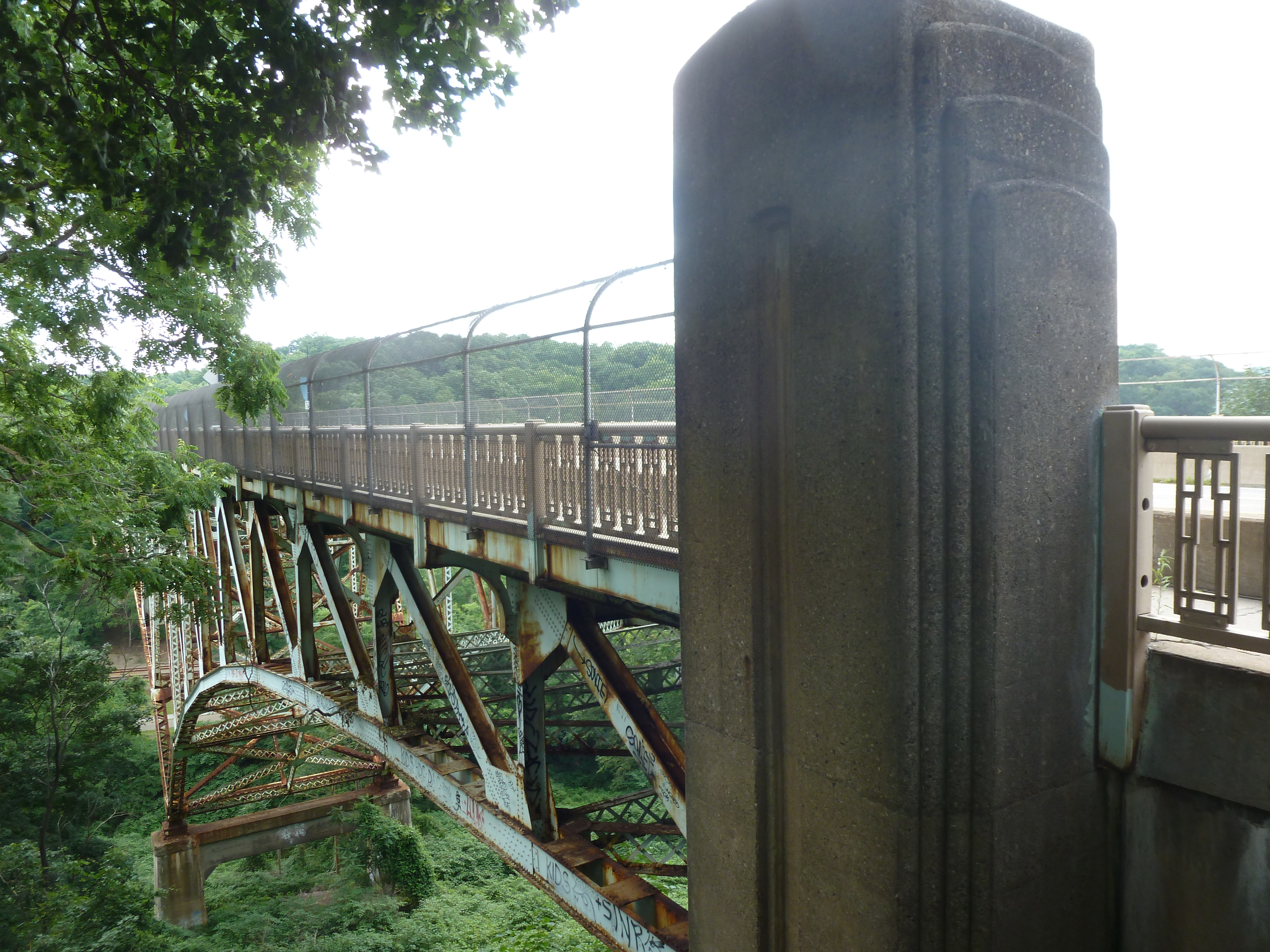 The next two bridges are related as one is over the pedestrian route and one over the vehicular route to the recreational facilities of Schenley Park. These facilities include a pool, ice skating rink, disc golf course, tennis courts, and a track. The bridge over the pedestrian route is a small affair to cross over the pedestrian tunnel. The other is a slightly longer overpass over the two-lane segment connecting Panther Hollow Road and Overlook Drive. Neither the tunnel-bridge nor the overpass are open to pedestrians – except during the annual Pittsburgh Vintage Grand Prix, which I once took advantage of for some photographs.