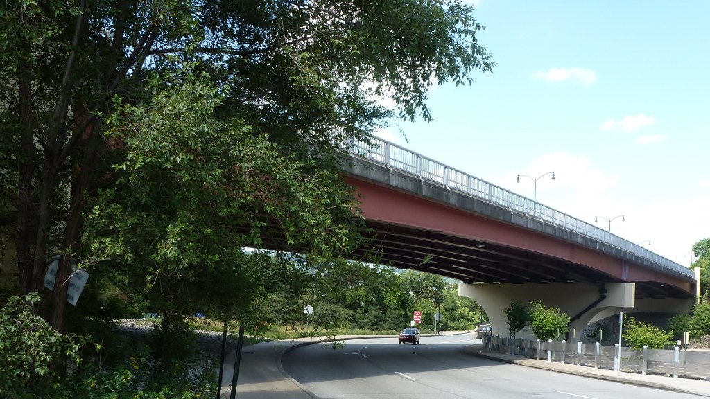 The road makes a flying leap into Oakland on the Boulevard of the Allies Bridge. On the South Oakland side, the Blvd enters a commercial corridor that begrudgingly gives pedestrians a place on a narrow sidewalk that abruptly begins (or ends) at the edge of the bridge. On the other side of the bridge, the Blvd is a mess of highway interchanges, so pedestrians are not welcome to utilize this bridge to go anywhere.
