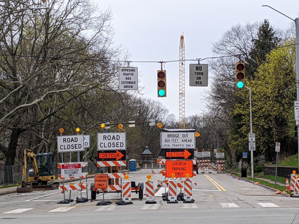 - The repairs to the Centre Avenue Bridge and Meadow Avenue Bridge continue with cones marking a narrow road across the Centre Avenue Bridge and the sidewalk on one side closed on the Meadow Avenue Bridge.