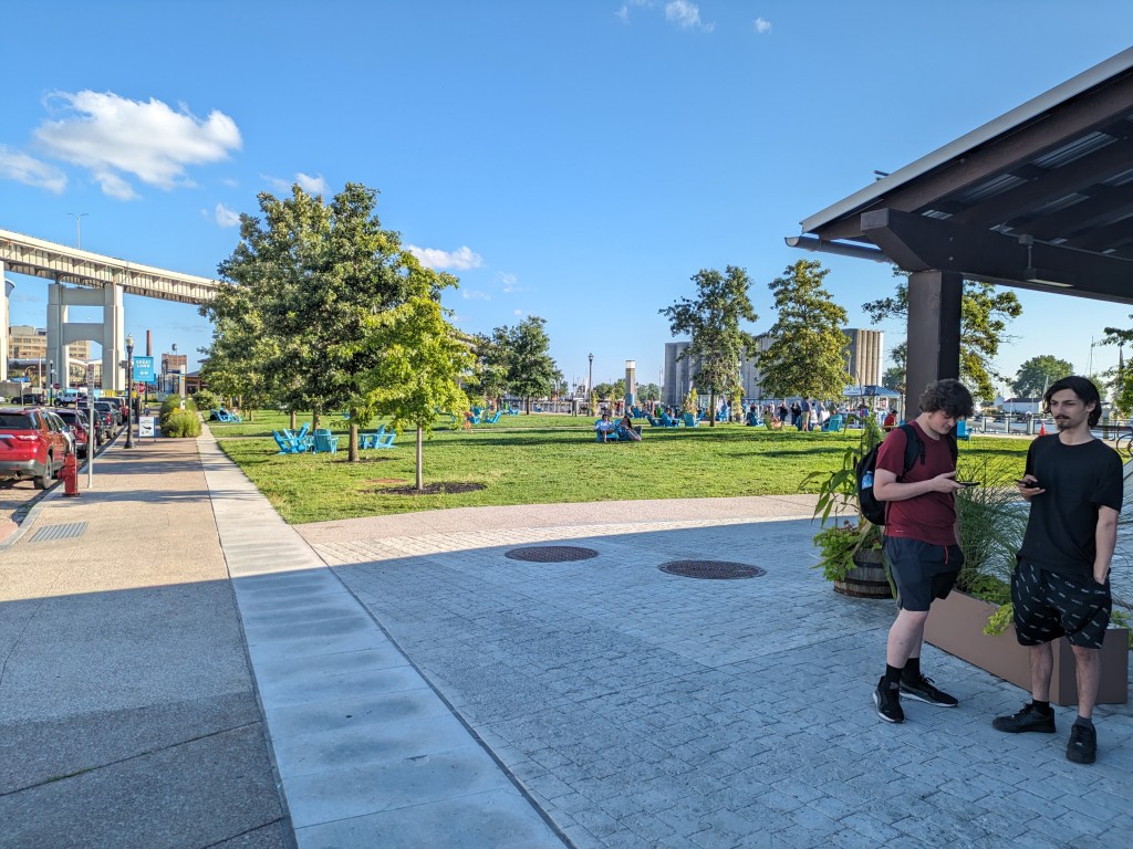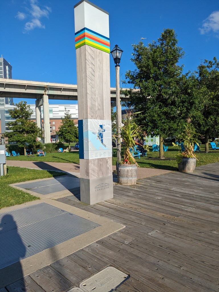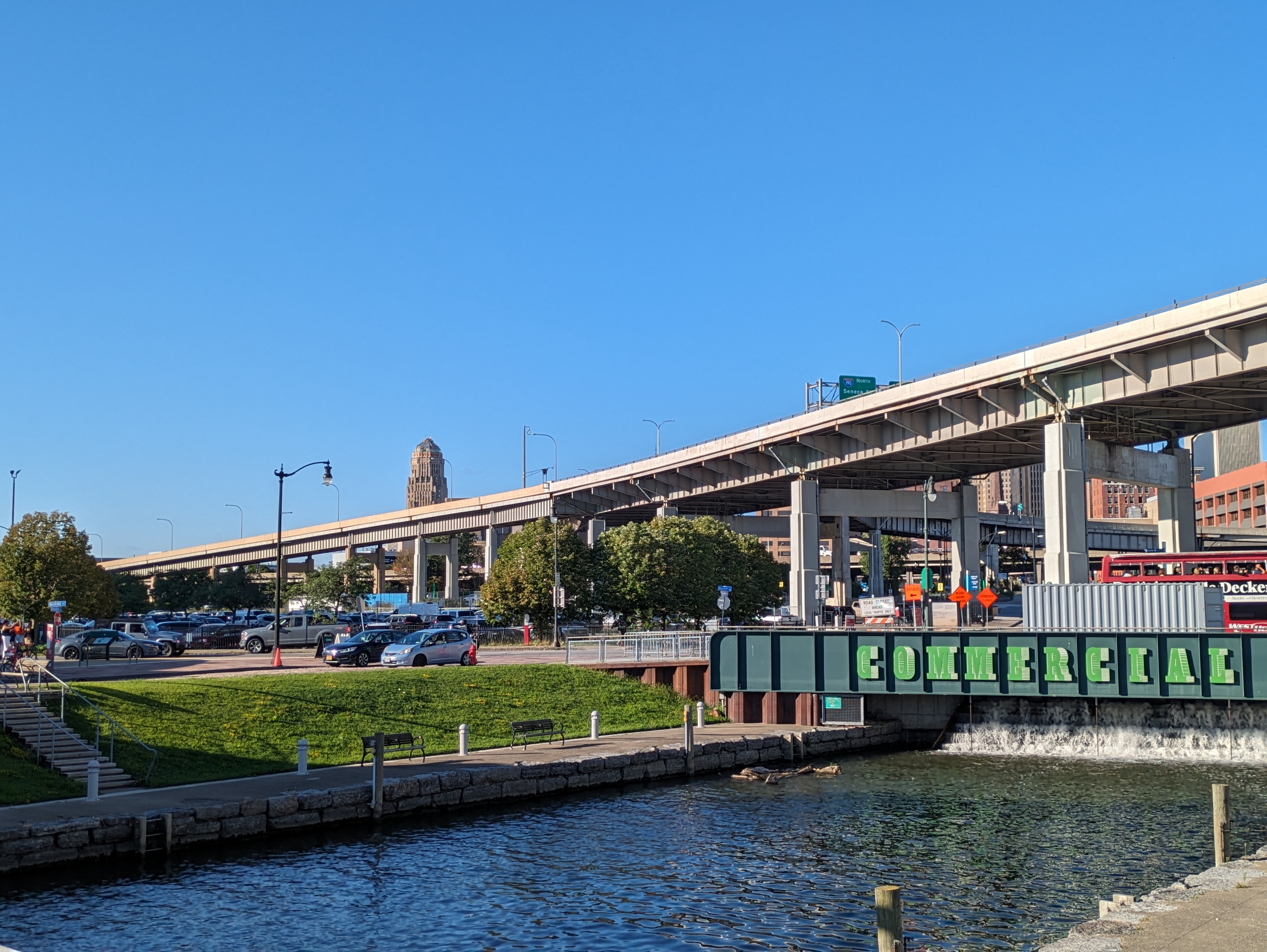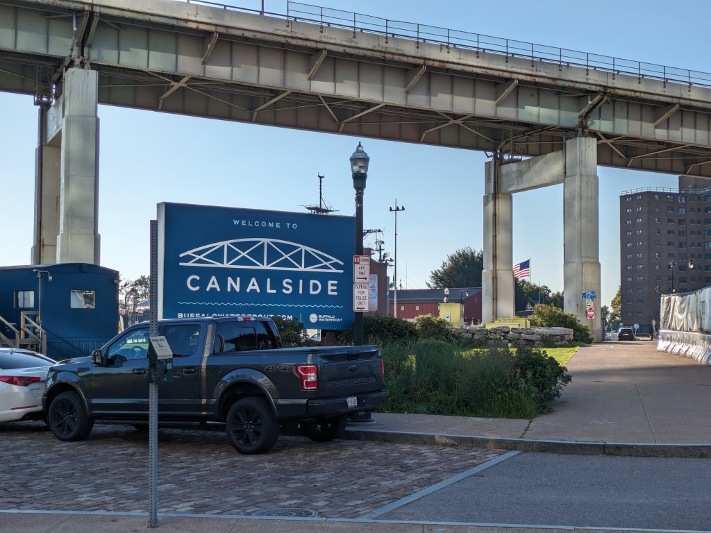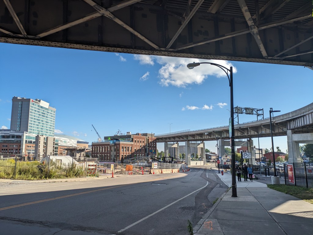 Route 5 and I-190 meet at the southwestern corner of downtown Buffalo creating a knot of an interchange and on/off ramps that block access between downtown and the waterfront. But, beyond that point of intersection, both roads are elevated leaving open multiple pathways underneath for pedestrians, cars, and transit. They still create a psychological barrier – it never feels welcoming to pass underneath overpasses like these – but the physical connection is there. And once you pass through the barrier, there is much to see and do at Canalside.