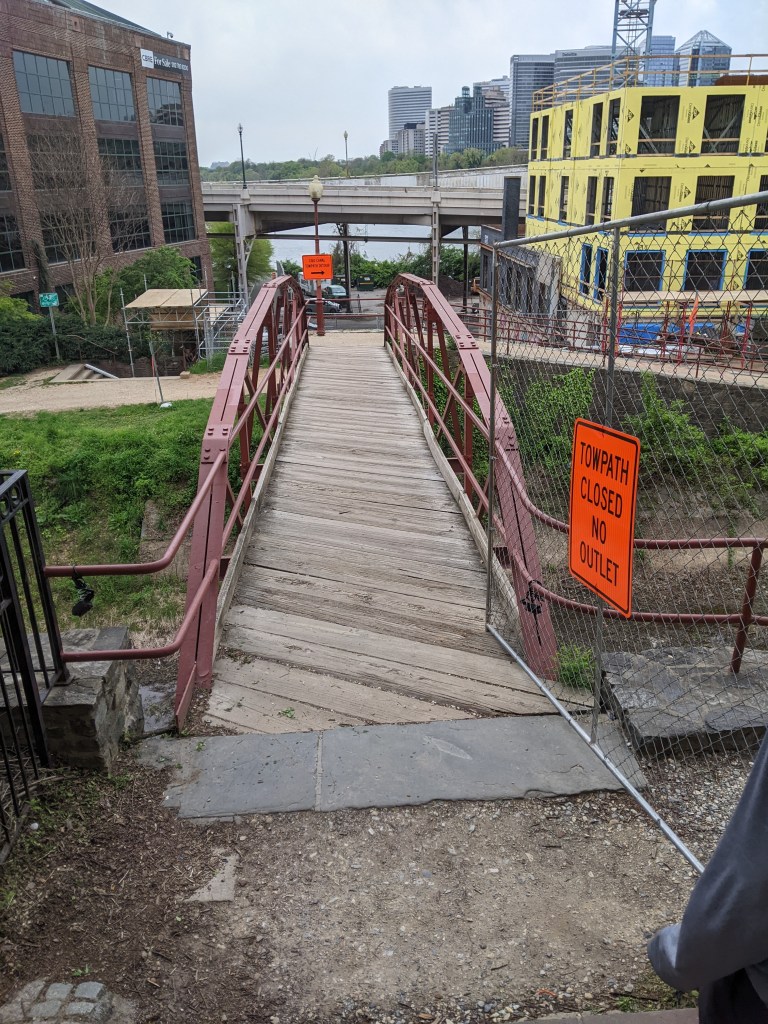After walking the downward slope across this bridge and its ramp to the towpath level, we had to walk down a set of stairs to reach the level of the Georgetown Waterfront Park. As the sidewalk on Francis Scott Key Memorial Bridge is more than 60 ft above the water, the hike from the bridge to the waterfront park across the C&O Canal bridge is similar to climbing down and then up the stairs in a 6-7 story building.