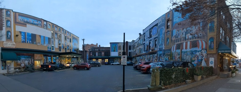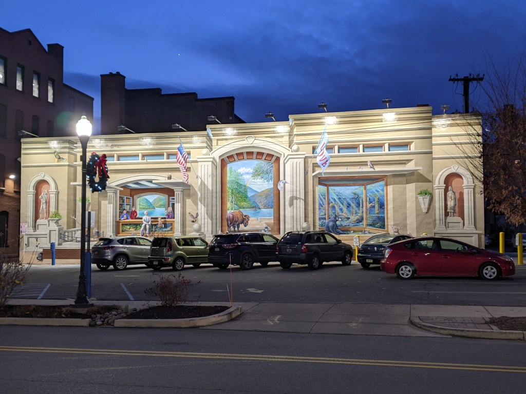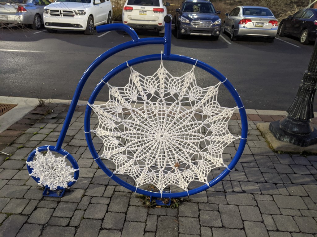 I enjoy my layovers in Williamsport, PA, even though I introduced the town on my blog with my least favorite experience there so far – walking its bridges. I am always on the tail end of a trip when I’m visit, which may explain why I have a tendency to not take as many photographs as I otherwise would. For example, the Little League Museum is in Williamsport and at one intersection the public art reflects this with a statue at each corner of little leagues players one each at home plate and the three bases. When I stumbled across that intersection I was too tired to hit all four corners and so I didn’t even take photographs of the statues at the two corners I did pass. However, the crochet-filled penny-farthing bike rack and a couple murals filling in the normally blank walls along parking lots were inspiring enough for me to stop for a minute to take photos, despite being so tired.