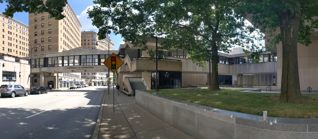 The Oakland neighborhoods in Pittsburgh’s East End are the home to a number of institutions. Among them are Carlow College, the University of Pittsburgh (Pitt), Carnegie Mellon University (CMU), multiple UPMC hospitals, the Phipps Conservatory (Phipps), the Western Pennsylvania School for Blind Children, and the Carnegie Institute complex (housing the Carnegie Museums of Art and Natural History, the main Carnegie Library, and the Carnegie Music Hall). Institutions seem to have a predilection for pedestrian bridges and the ones in Oakland are no exception.