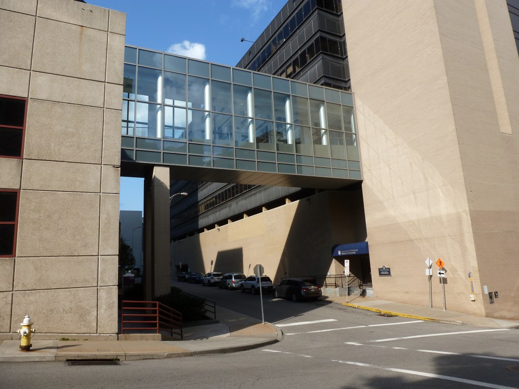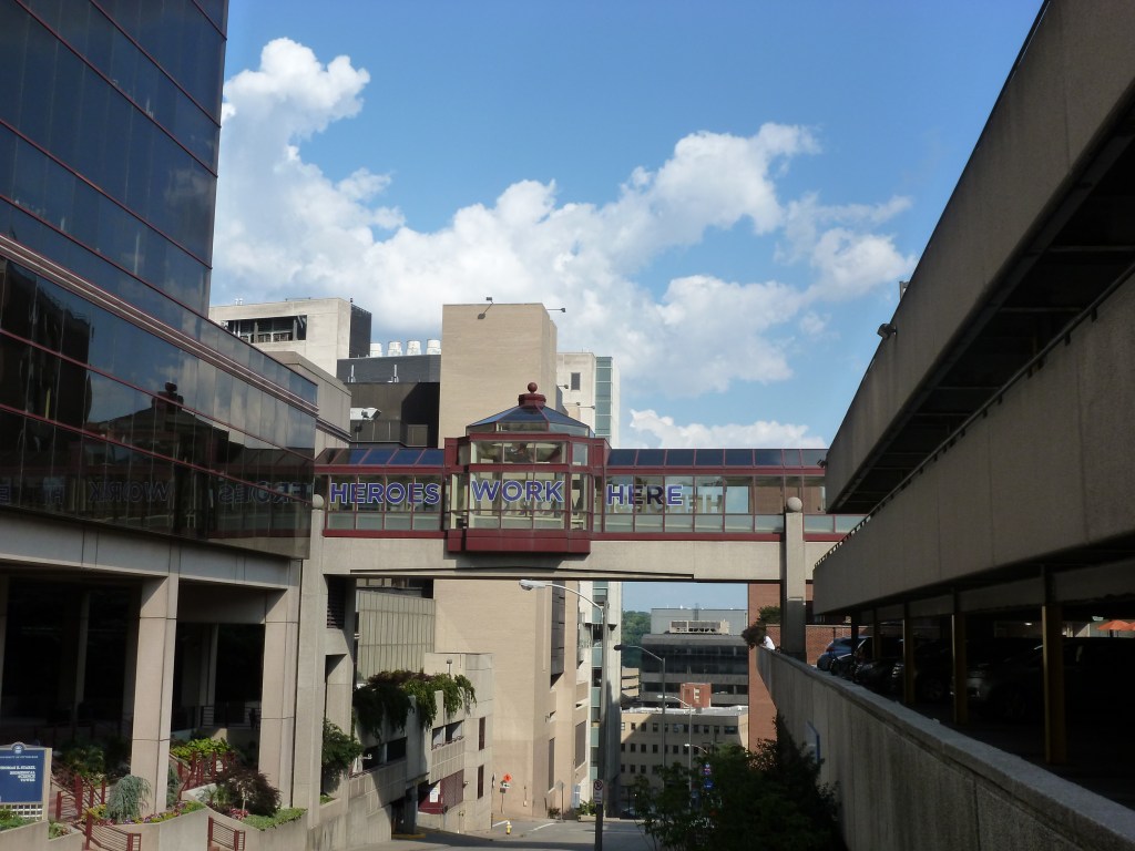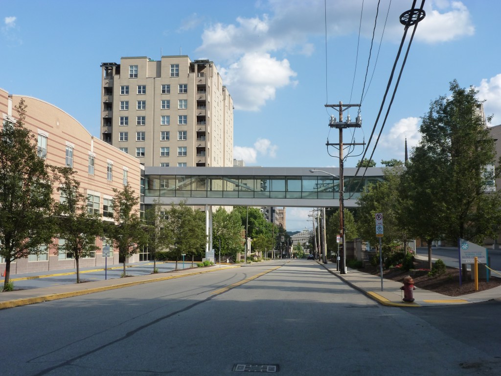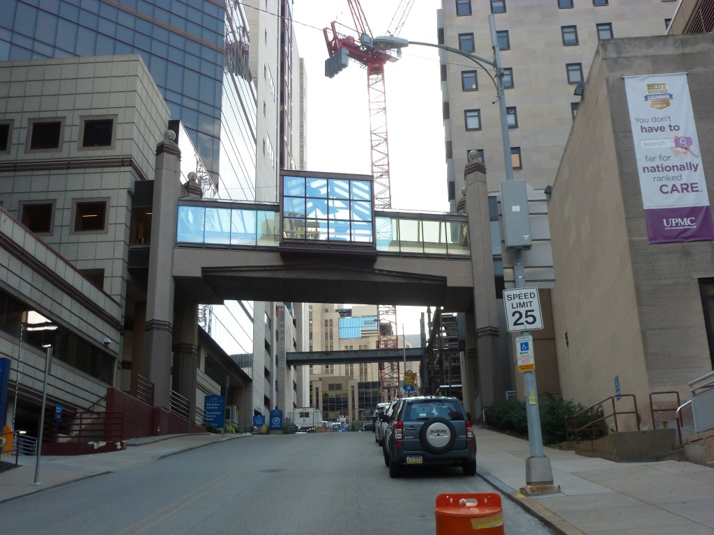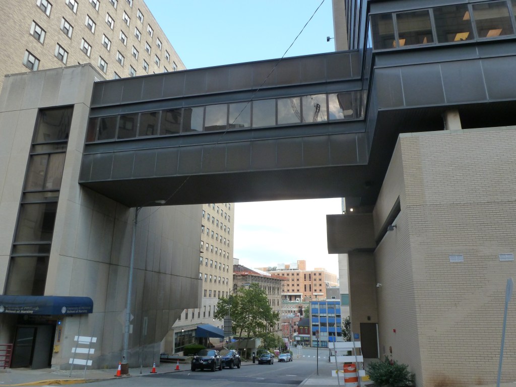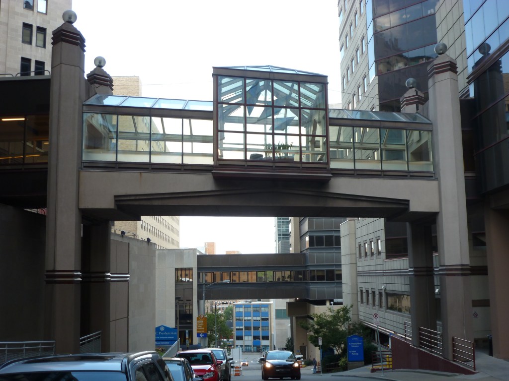 My first encounter with an elevated, enclosed pedestrian bridge was one of the ones in the UPMC hospital complex. The summer I turned six, my grandfather was admitted to the hospital and our trip to Pittsburgh to visit him included many impressionable firsts for me: