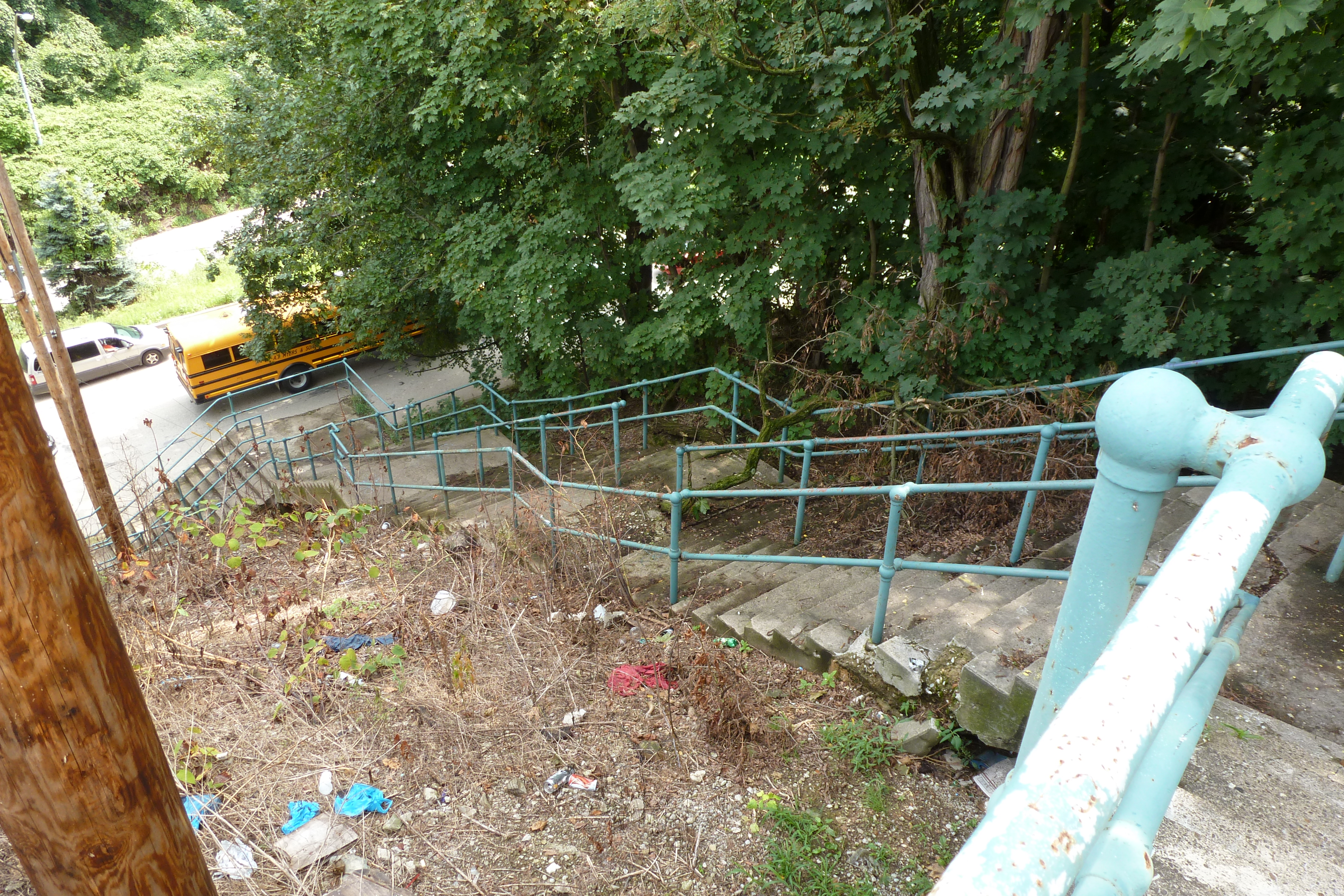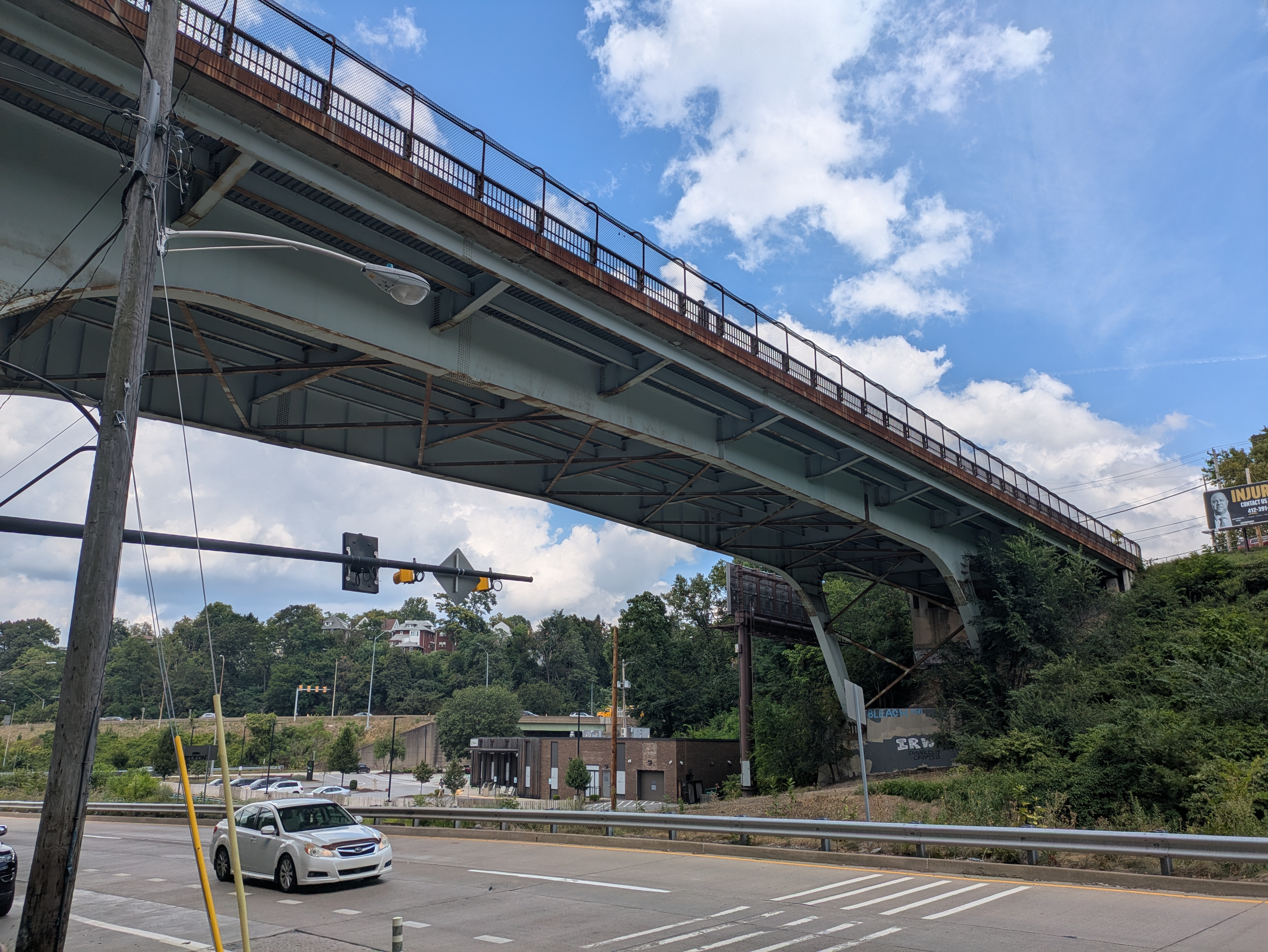 Ironically, a few days after my catch-up post about the Murray Avenue Bridge in Squirrel Hill went live, I unexpectedly found myself walking that bridge for the first time since 2012. The bridge looks mostly the same, slightly rusted but presumable functional as it hasn’t collapsed or been closed following a regular inspection. The stairs have been replaced though. I didn’t have a reason to go down them in 2012 and didn’t feel comfortable testing them out for the heck of it then. In 2025, the Urban Hike walk I was on came at the bridge from the street below and we climbed up the newish, solid-looking steps; a few of us (me included) pausing “for the view” on our way up.