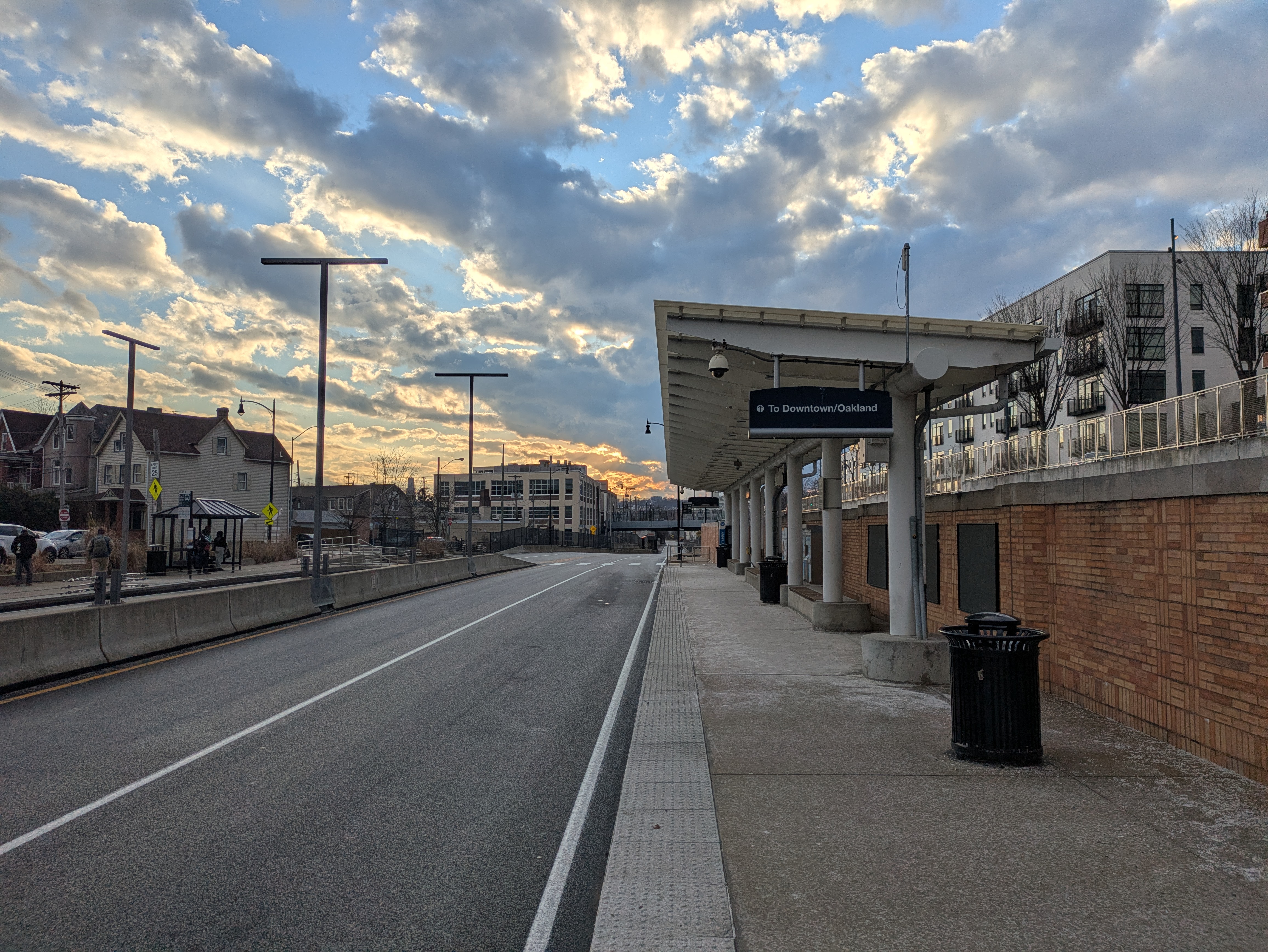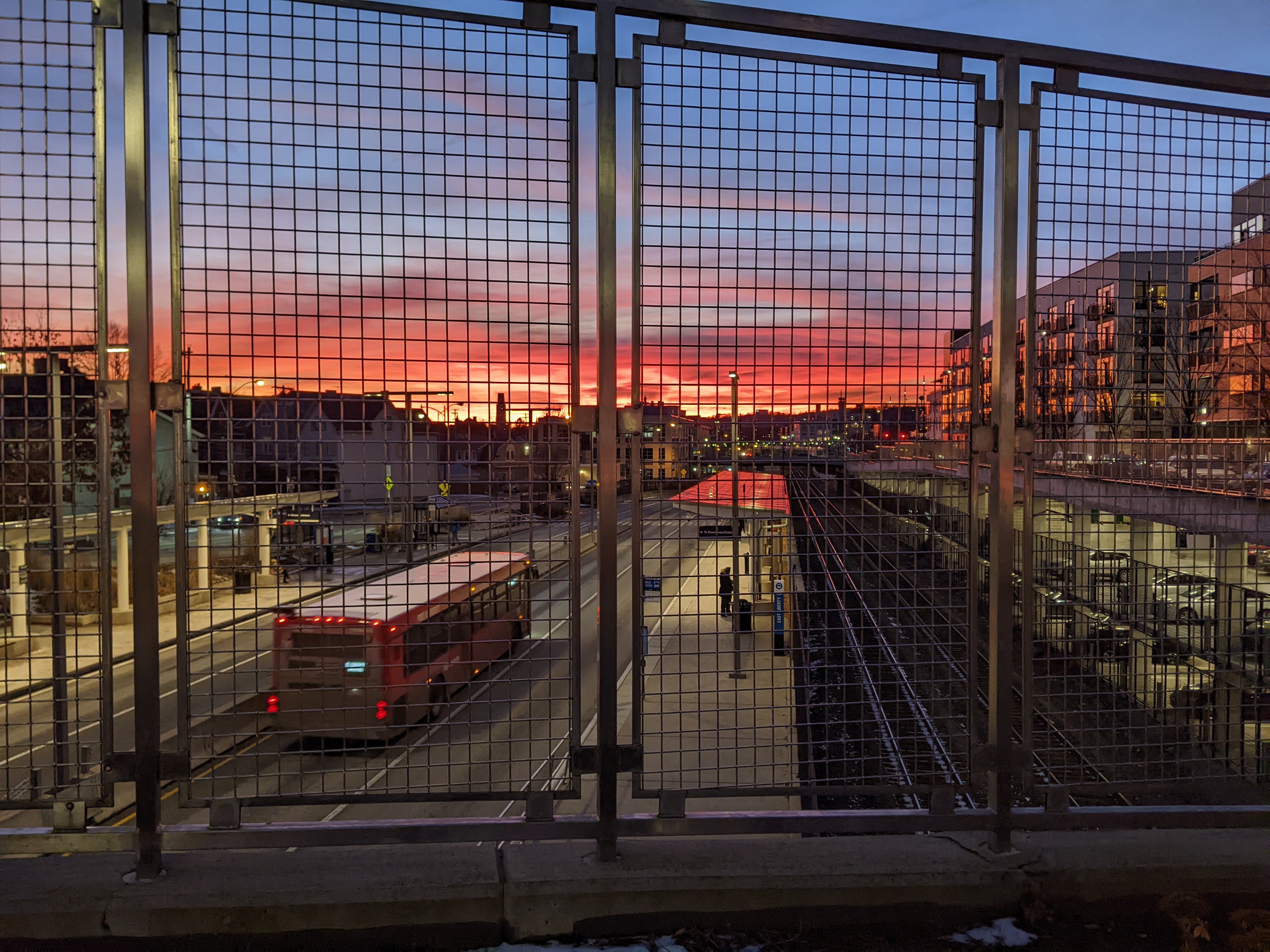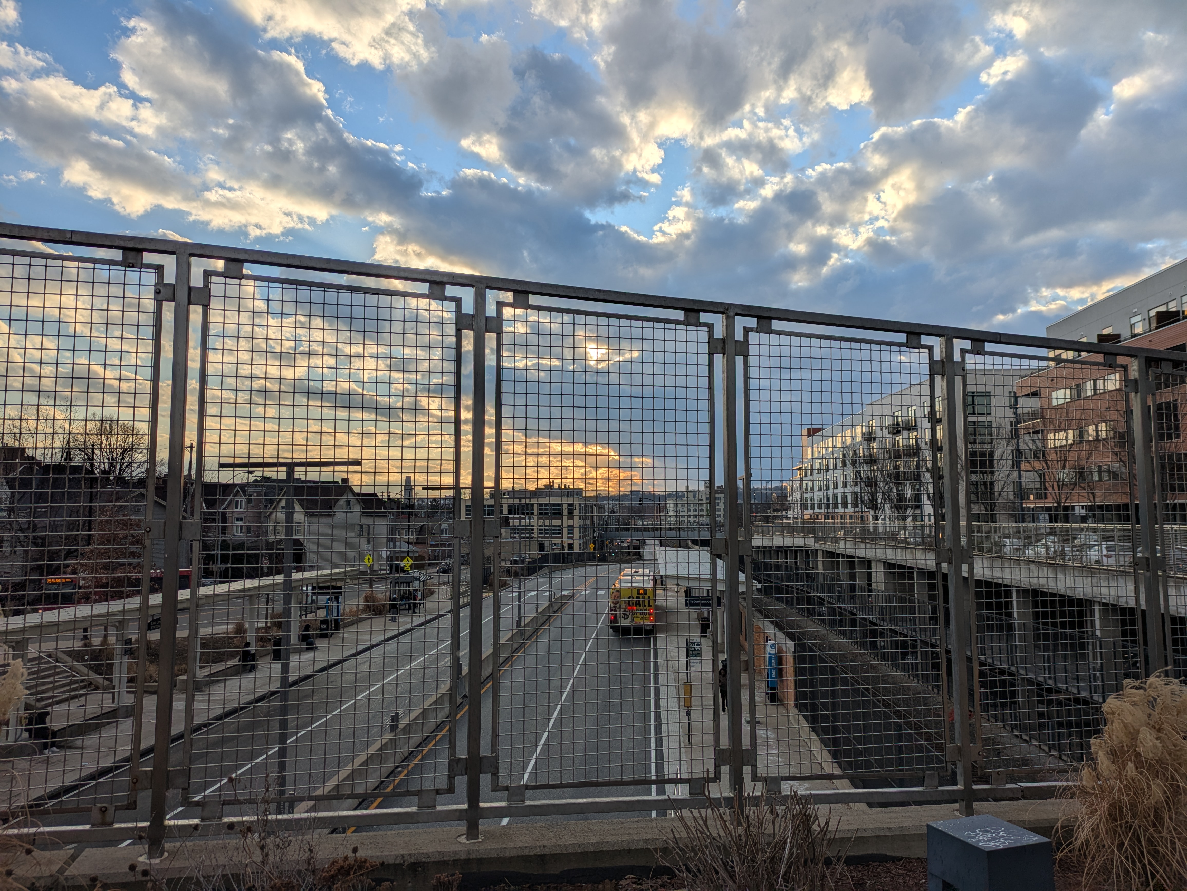 Two days after I told this story to my aunt, I walked across part of the East Liberty Station Pedestrian Bridge (Bridge Madness Champion 2024) at sunset. This is not the first time I’ve been on this bridge going about my daily business when I needed to stop to take photos of the view of sunset. In this instance, I then immediately walked down the steps to the busway station below. My experience of the sunset changed completely with the change in perspective. From the bridge, it seemed spectacular, but at the sidewalk below I no longer recognized it as something worthy of notice.
