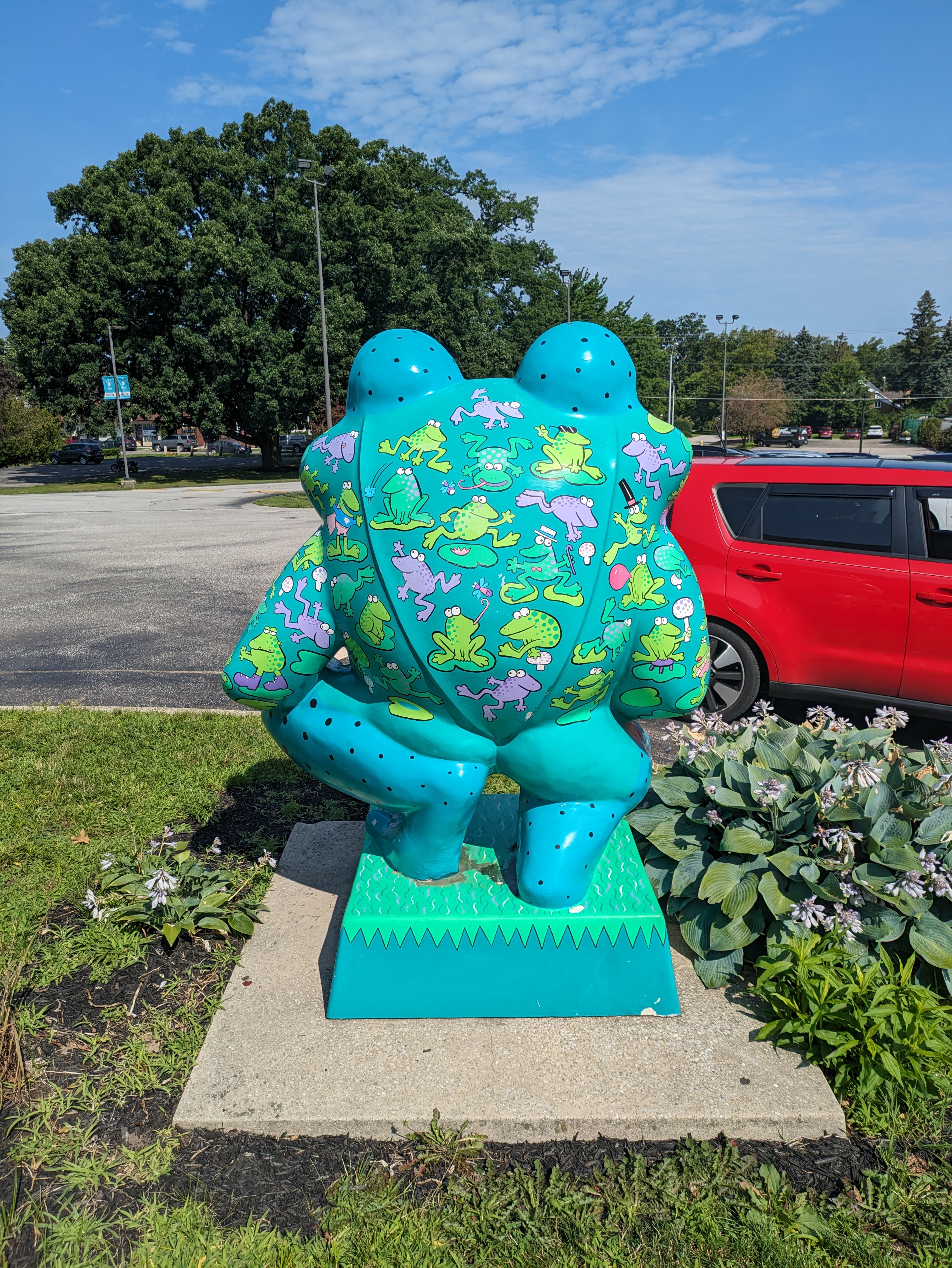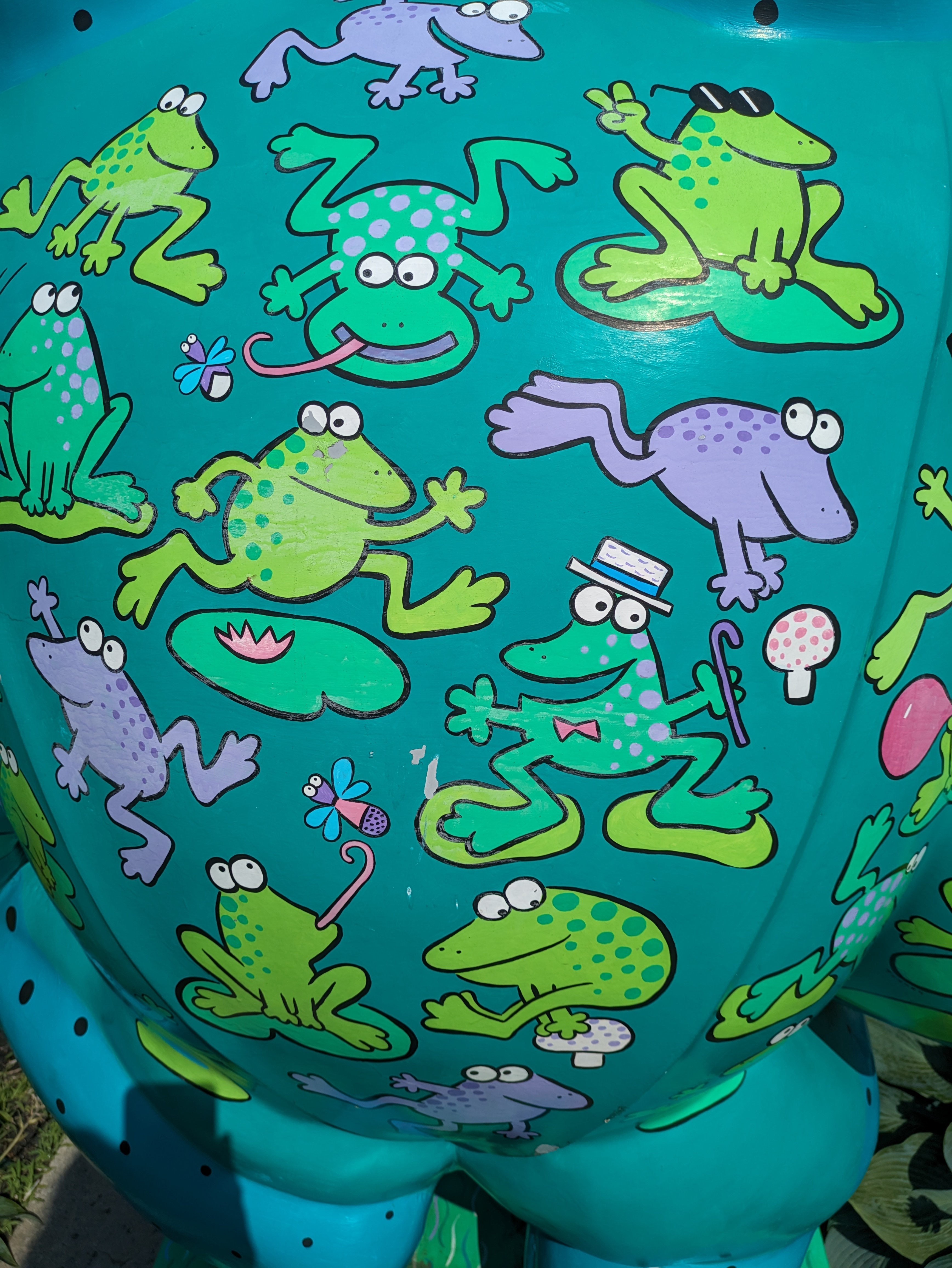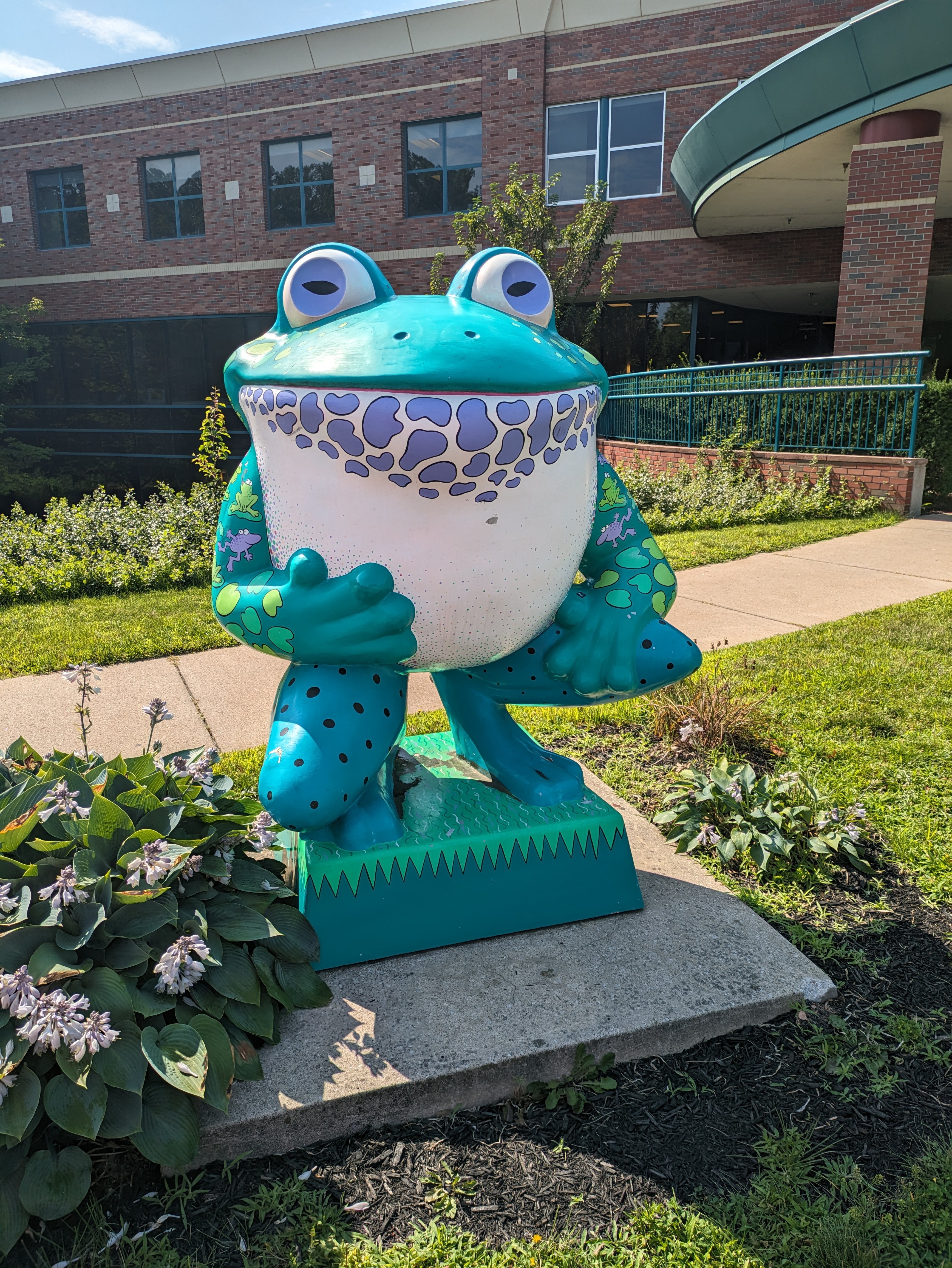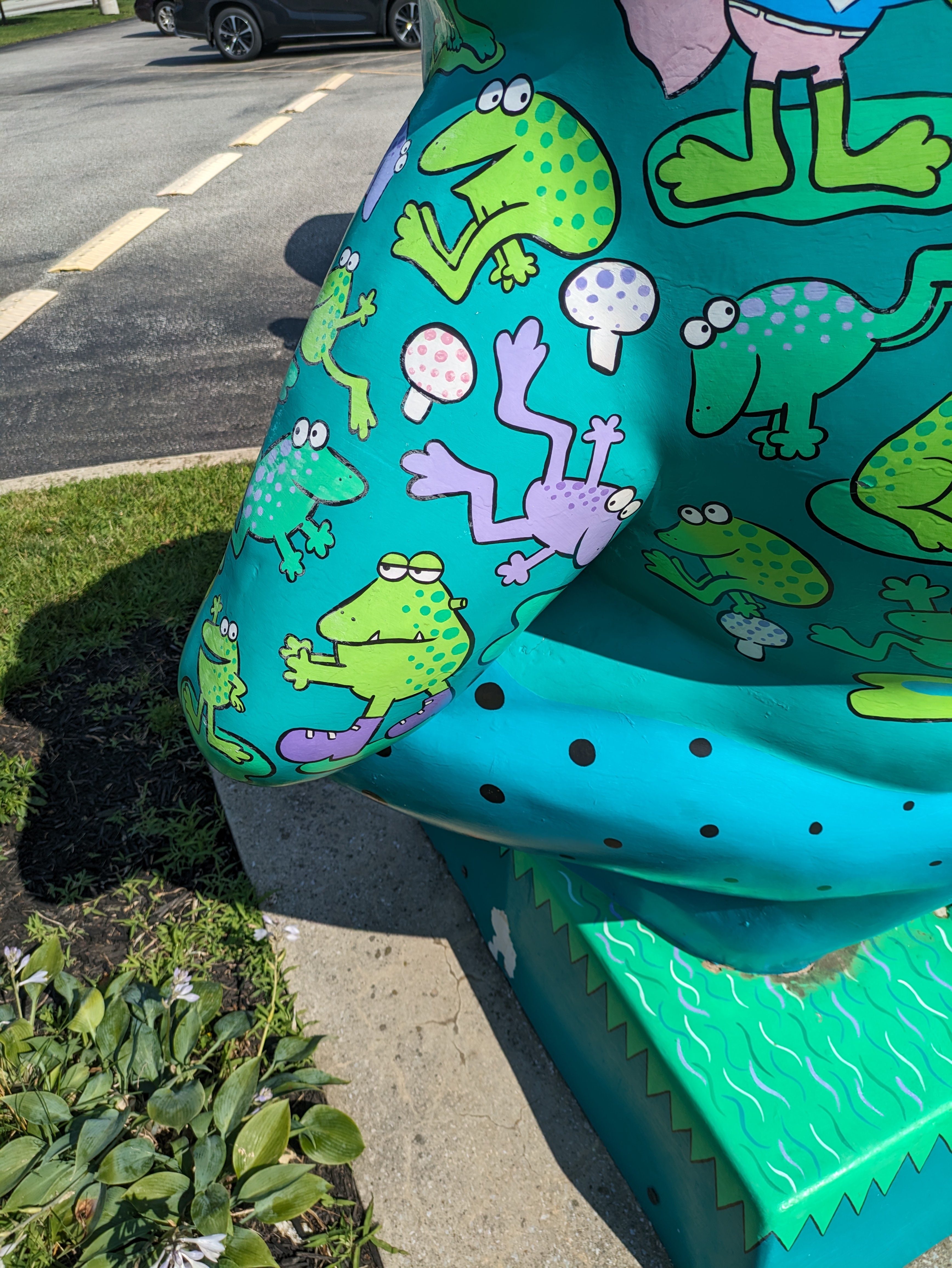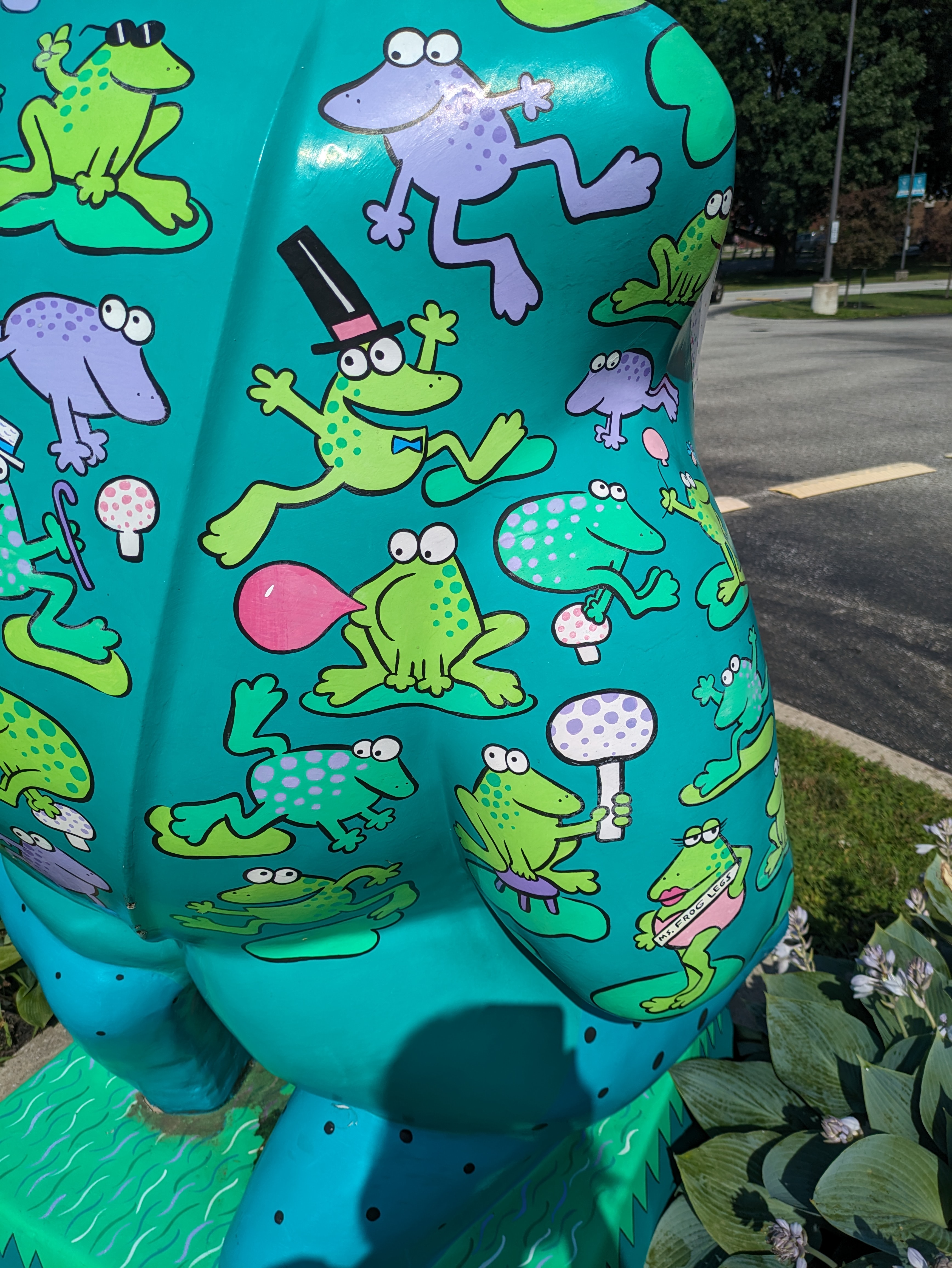 LeapFrog! was a fundraiser in Erie, PA, in 2004. The “Prints of Hopper-Tunity” was crowned in 2005, so it may not have been part of the original fundraiser. We stumbled upon the “Prints” while looking for another frog Amy H.’s map said was in the vicinity, but that one we didn’t find. The “Prints” did not change into a “Prince” when Shelly kissed him.