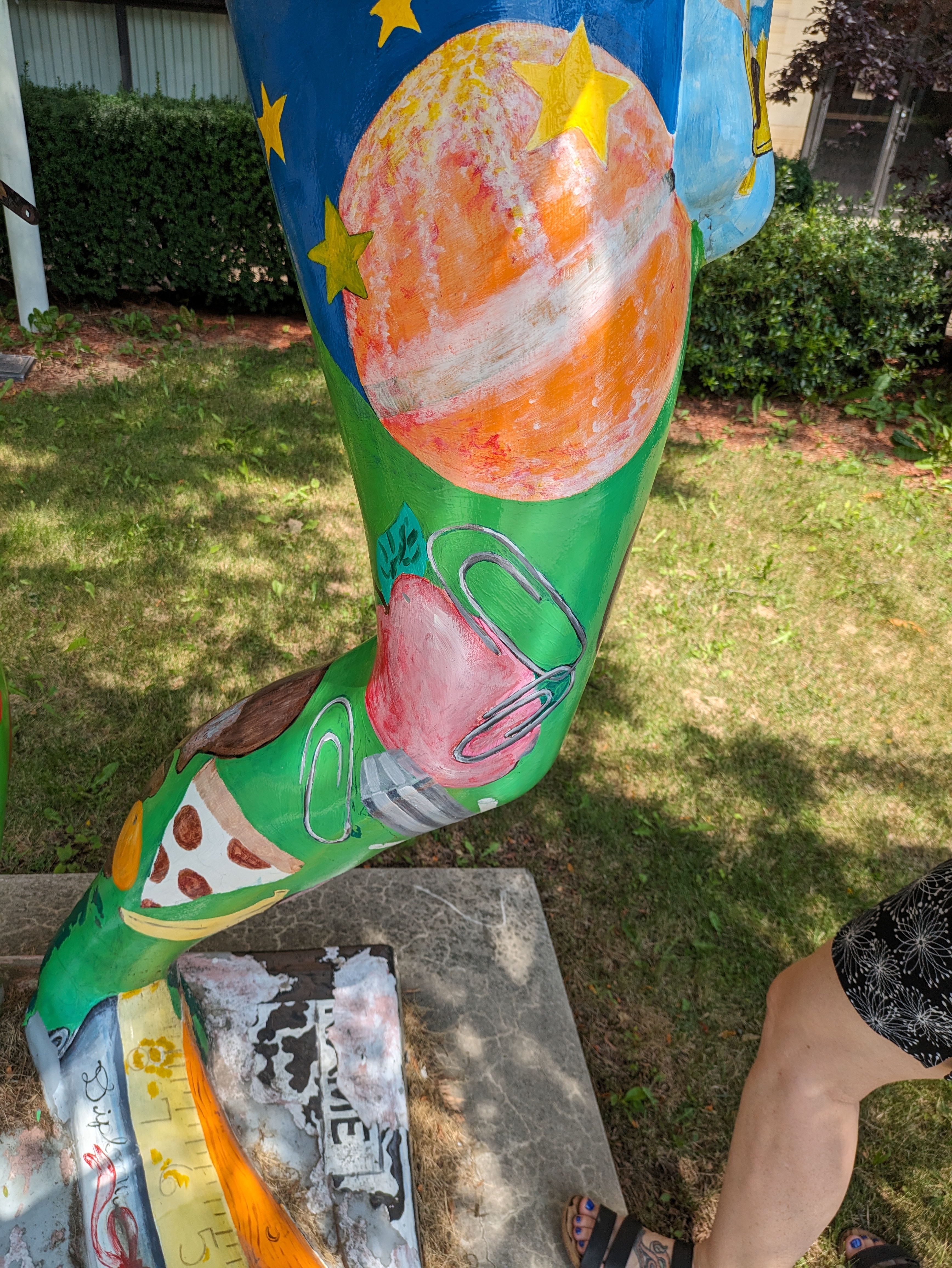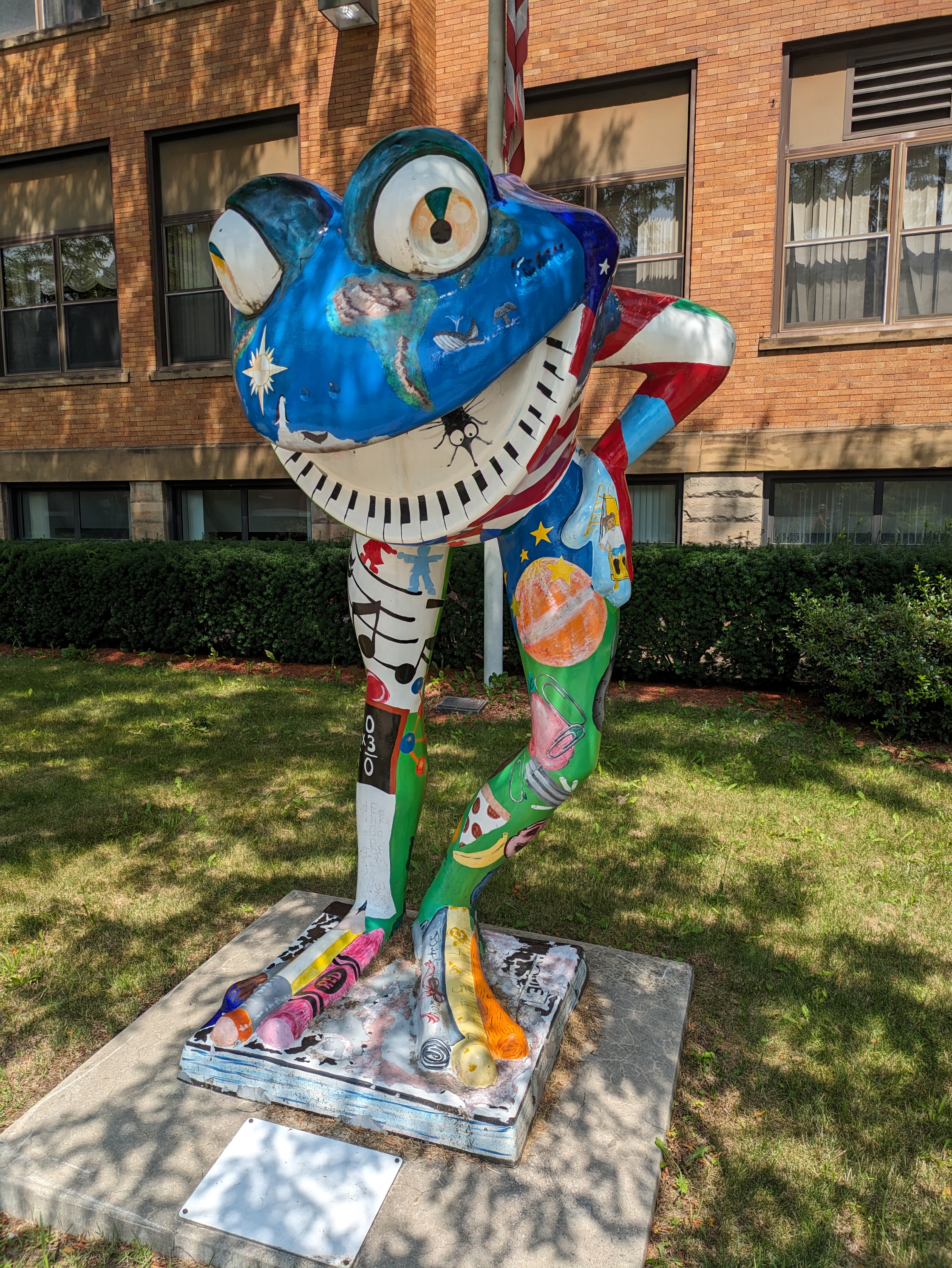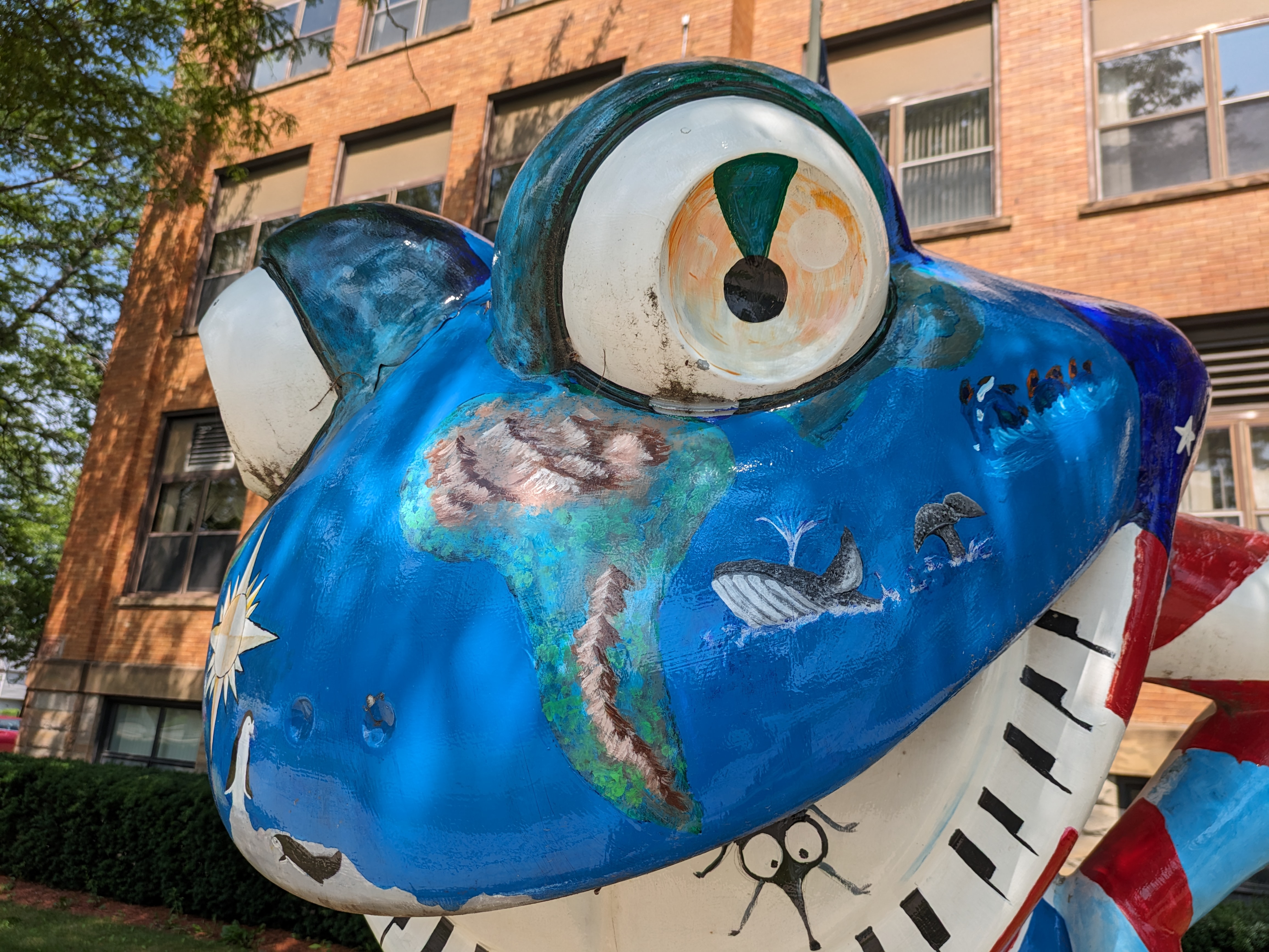 GoFish! was a fundraiser in Erie, PA, in 2001. “Fish Tales” by Jodi Staniunas Hopper & Toni Kelly must have had lasik surgery sometime between 2001 and 2023 as it no longer wears the glasses it had in 2001. Amy H.’s FourSquare map helped us find this one in the lobby of the Erie Maritime Museum, one of the original patrons of the fish. As FourSquare isn’t available anymore, I have created my own maps for where I encounter the fish and other statues: https://urbantraipsing.com/public-art-maps/