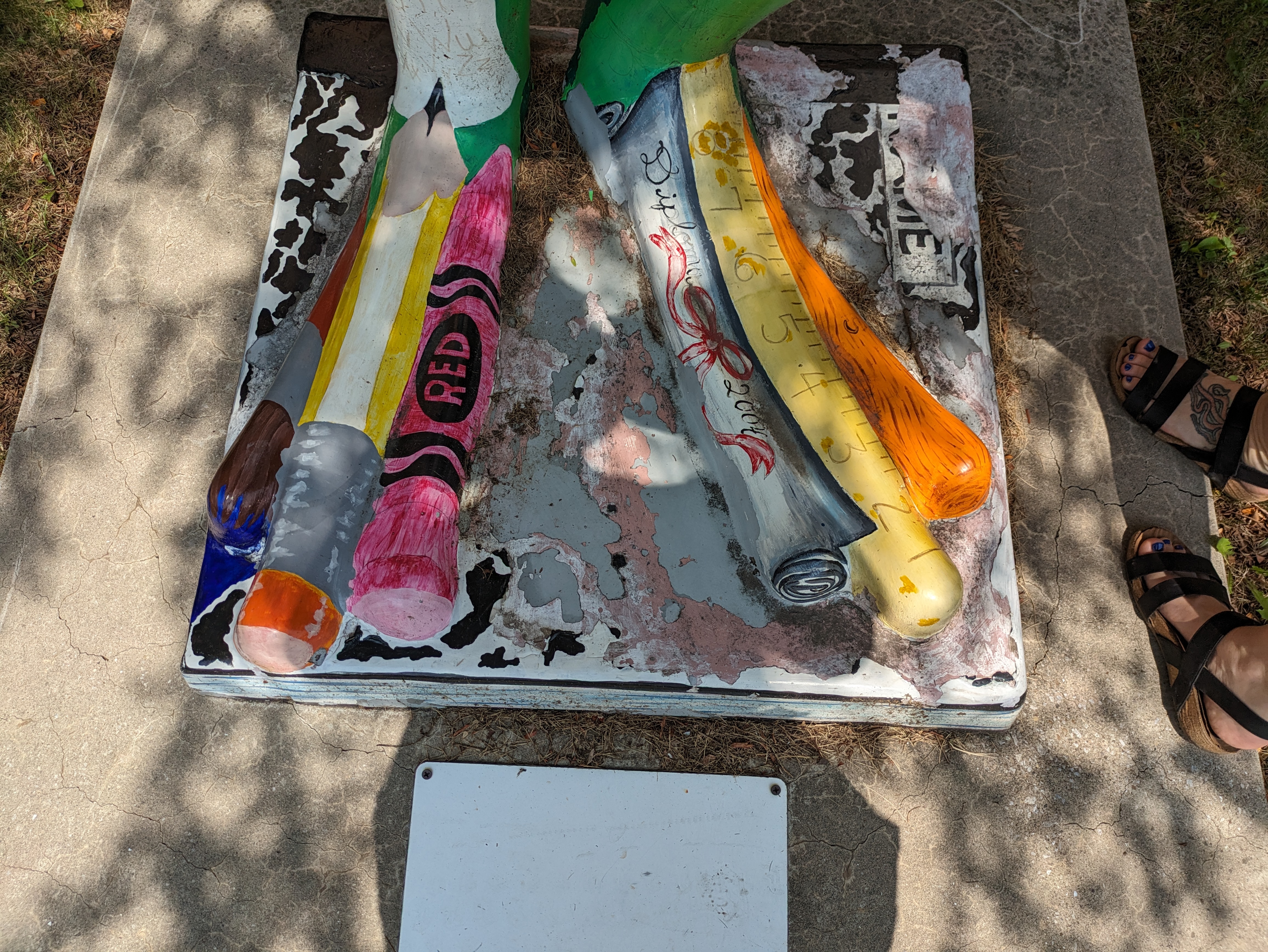 GoFish! was a fundraiser in Erie, PA, in 2001. Amy H.’s FourSquare map helped us identify the building where “‘The Teaching Fish’ Minds to Learn, Fins to Serve” by MC Gensheimer now lives (2023), but we had to ask for help multiple times once we were inside before one of the staff showed us where this fish was in the cafeteria.