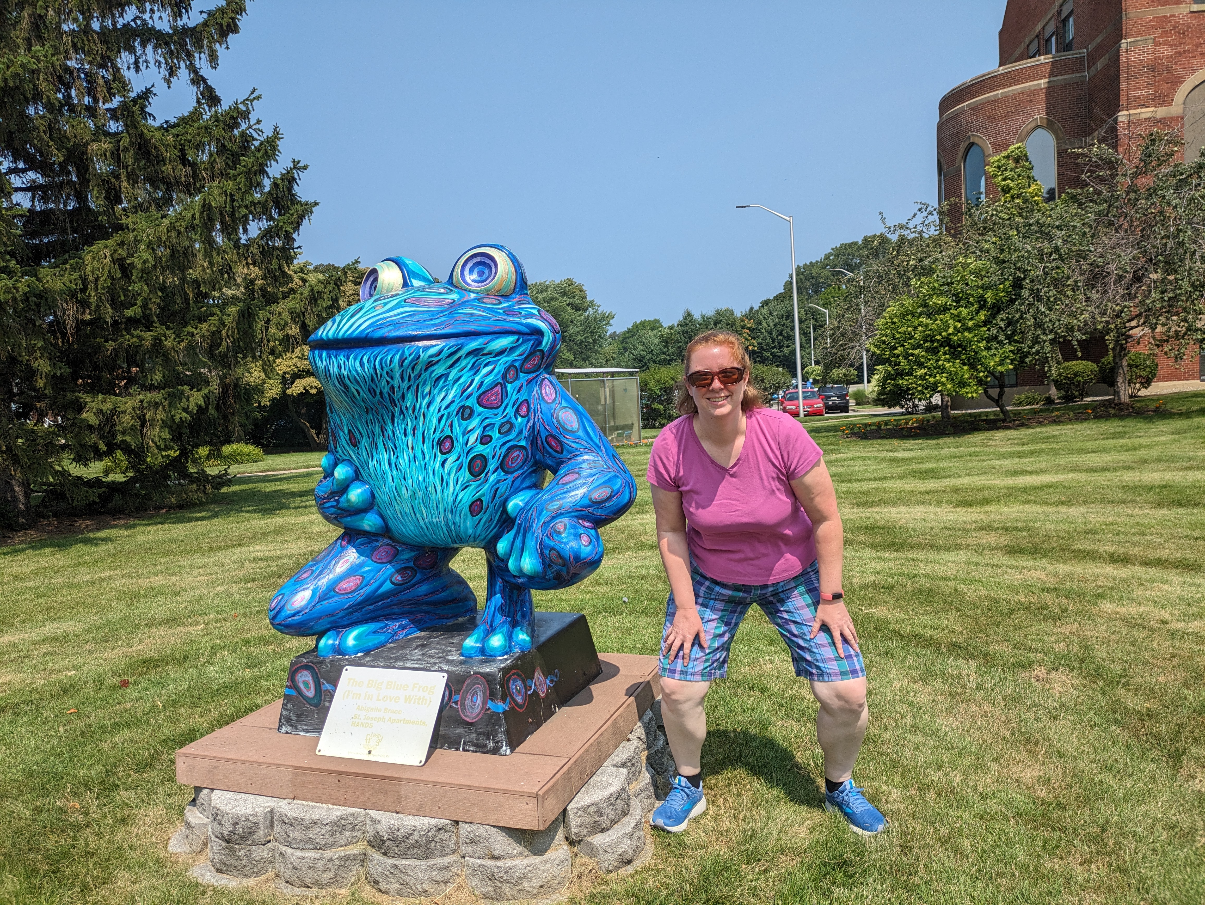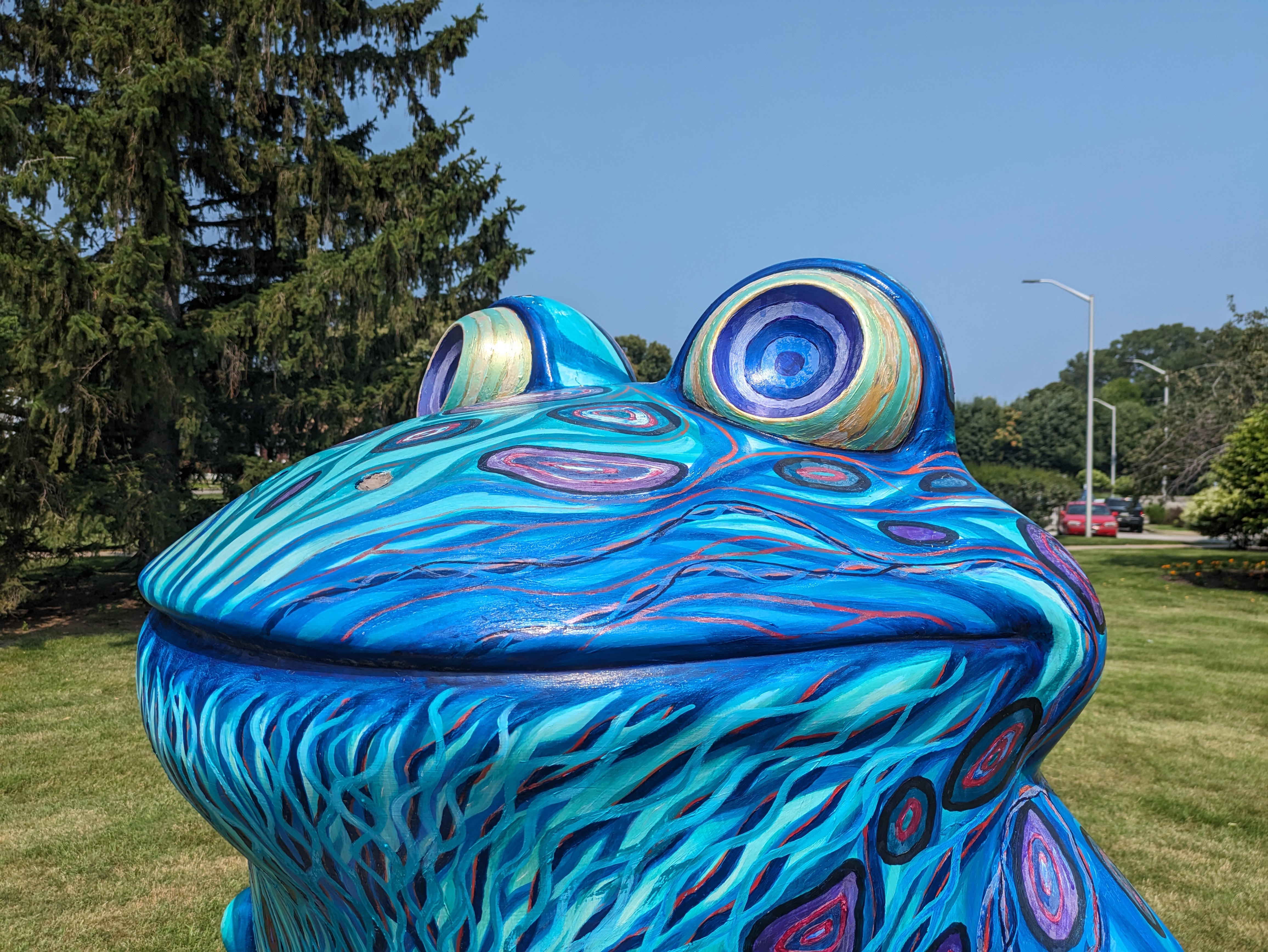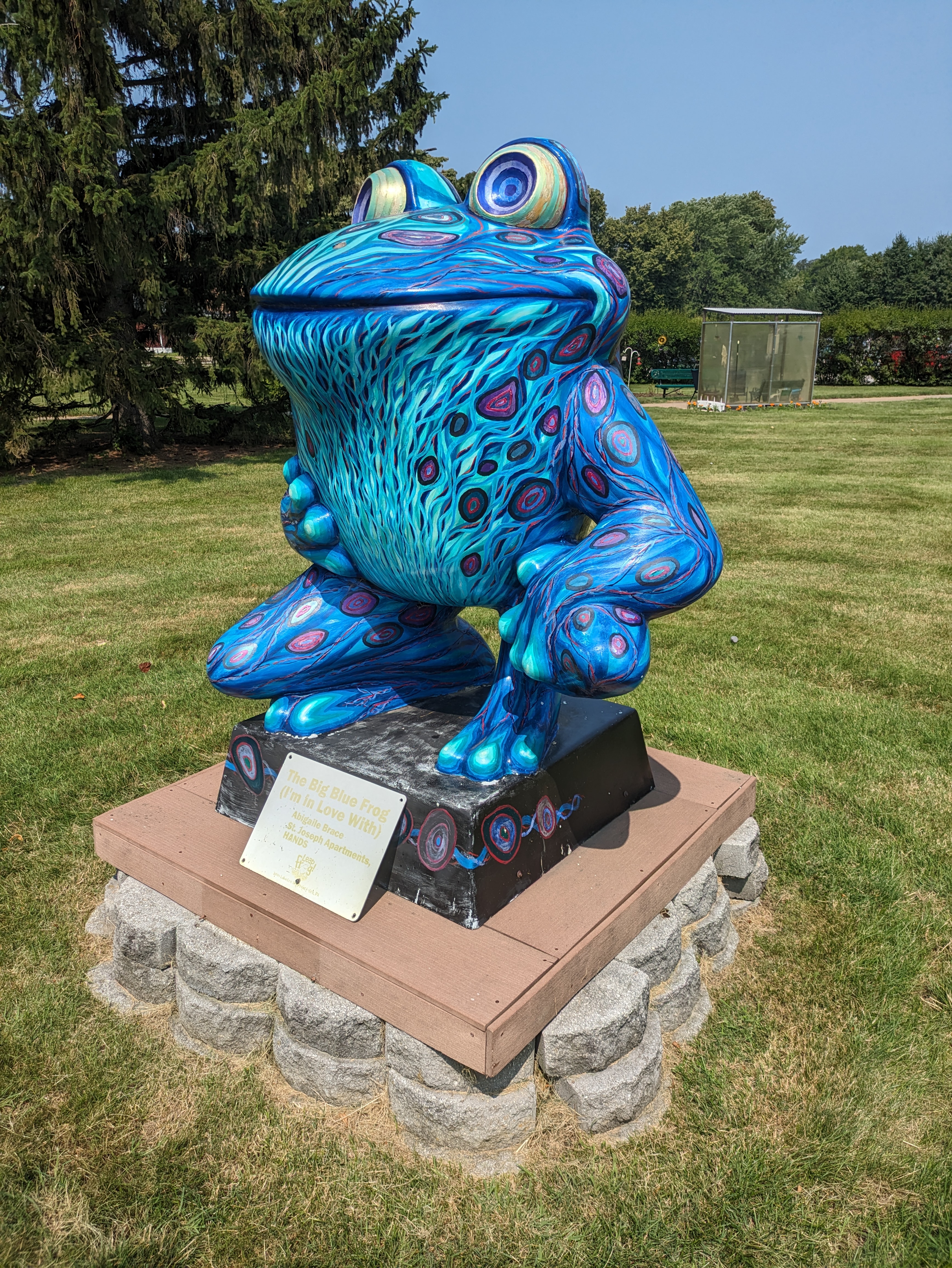 LeapFrog! was a fundraiser in Erie, PA, in 2004. While in 2023, I was prepared to use Amy H.’s map to find more of Erie’s frogs, I found this one in a classic case of driving along to a specific destination and suddenly spotting a frog. “The Big Blue Frog (I’m in Love With)” by Abigaile Brace was sponsored by St. Joseph Apartments, HANDS, and it still sits on their lawn.