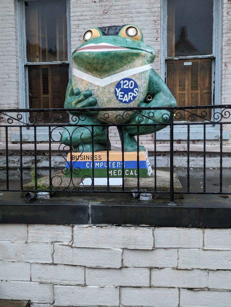 LeapFrog! was a fundraiser in Erie, PA, in 2004. After searching for several frogs hidden inside buildings in 2023, it was refreshing to spot “One Hopper” by Ben Gibson as we rounded the corner at E 10th and French. Amy H.’s map of Erie’s frogs led us to this location.