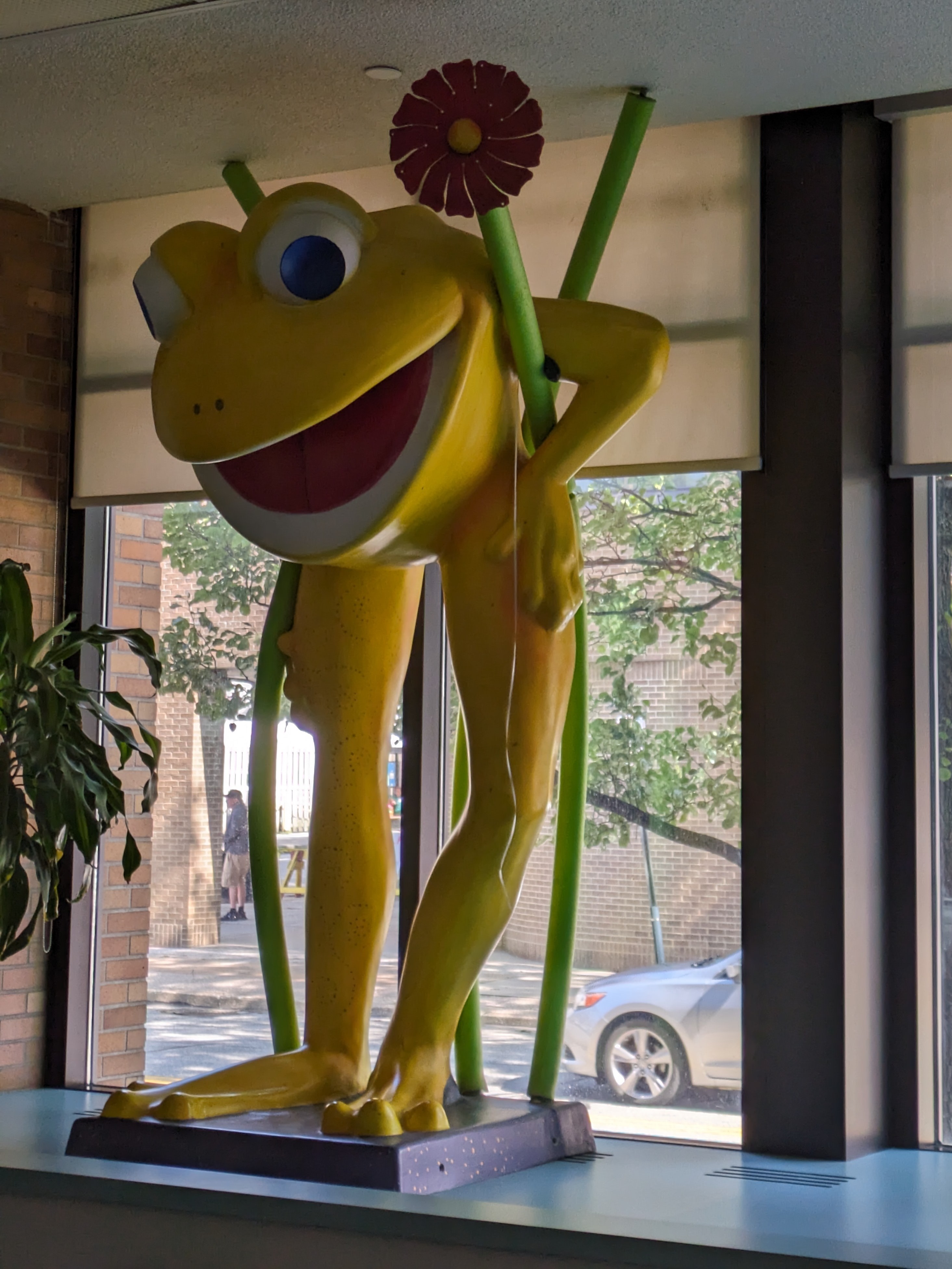 LeapFrog! was a fundraiser in Erie, PA, in 2004. Amy H.’s map pinpointed the building where “Victorian Flower Frog” by MC Gensheimer now resides, but we had to ask a couple people to find it in the cafeteria.