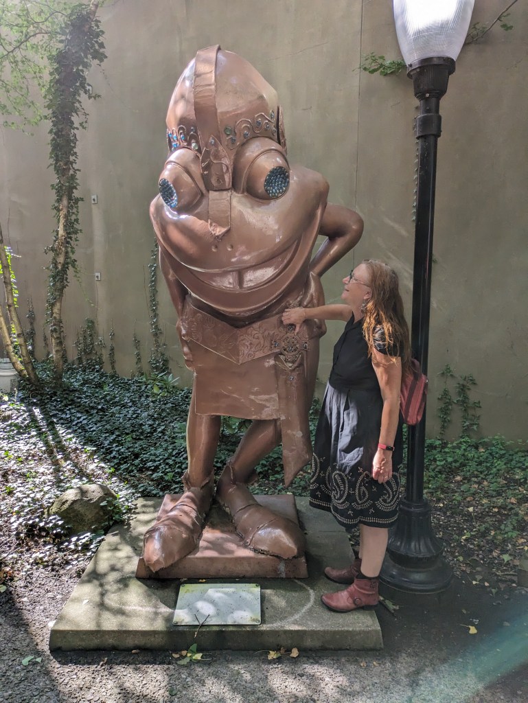 LeapFrog! was a fundraiser in Erie, PA, in 2004. Amy H.’s map helped us find this one in the interior courtyard of the Avalon Hotel in 2023. Shelly then challenged “Art-thurian King” by Jodi Staniunas Hopper to his sword.