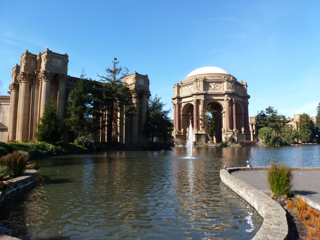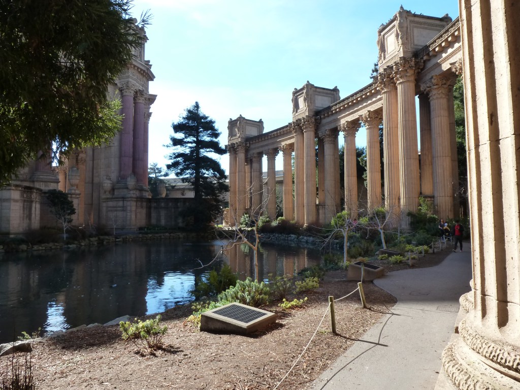 Sitting by the lagoon of the Palace of Fine Arts was very peaceful, with the small fountain splashing and birds chirping and cawing. As I sat there enjoying the scene, there was a moment when I could almost picture Laura Ingalls Wilder and other women of the 1910s in their multi-layer dresses, hats or bonnets, and gloves strolling past in a promenade and gazing with wonder at the sights around them.