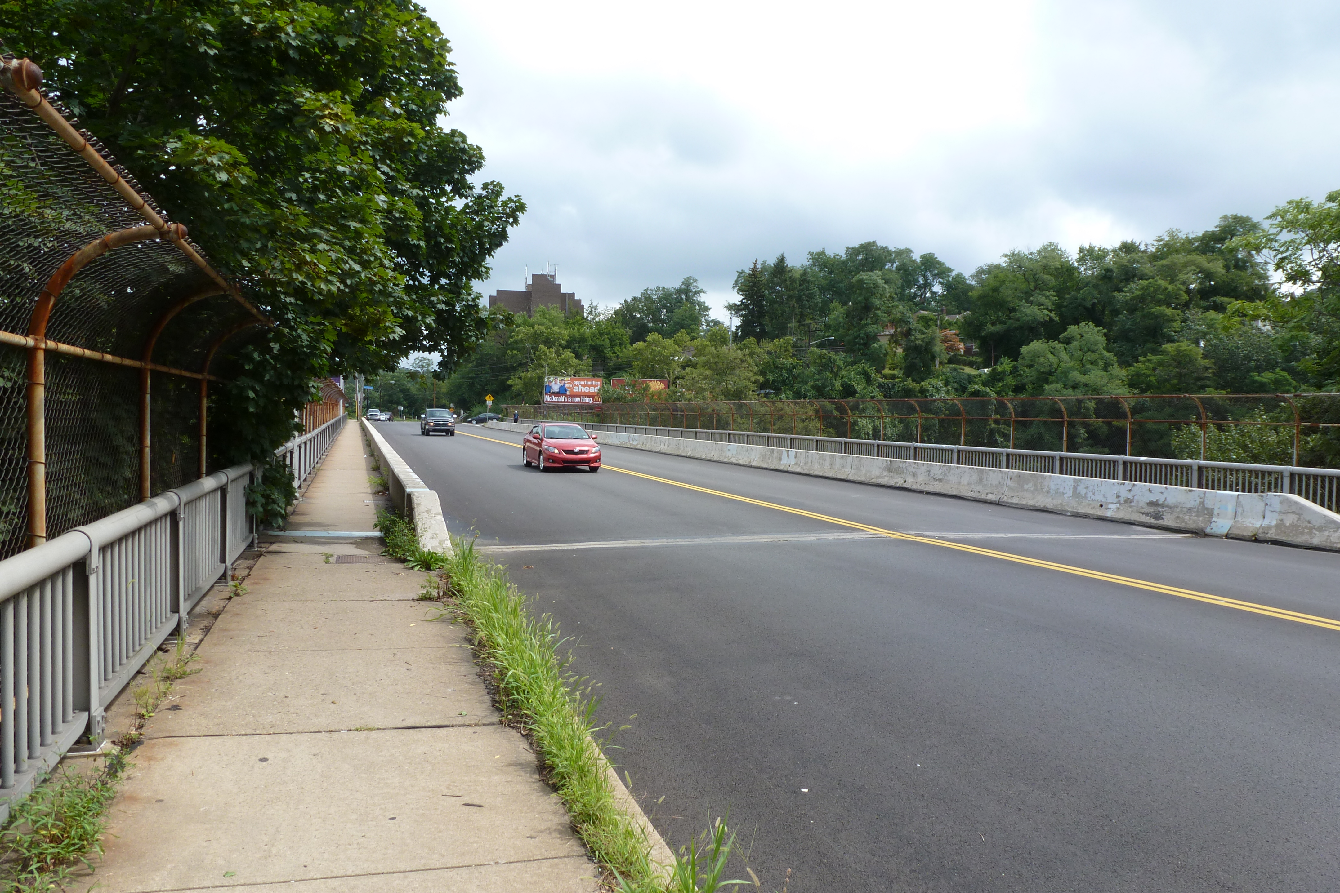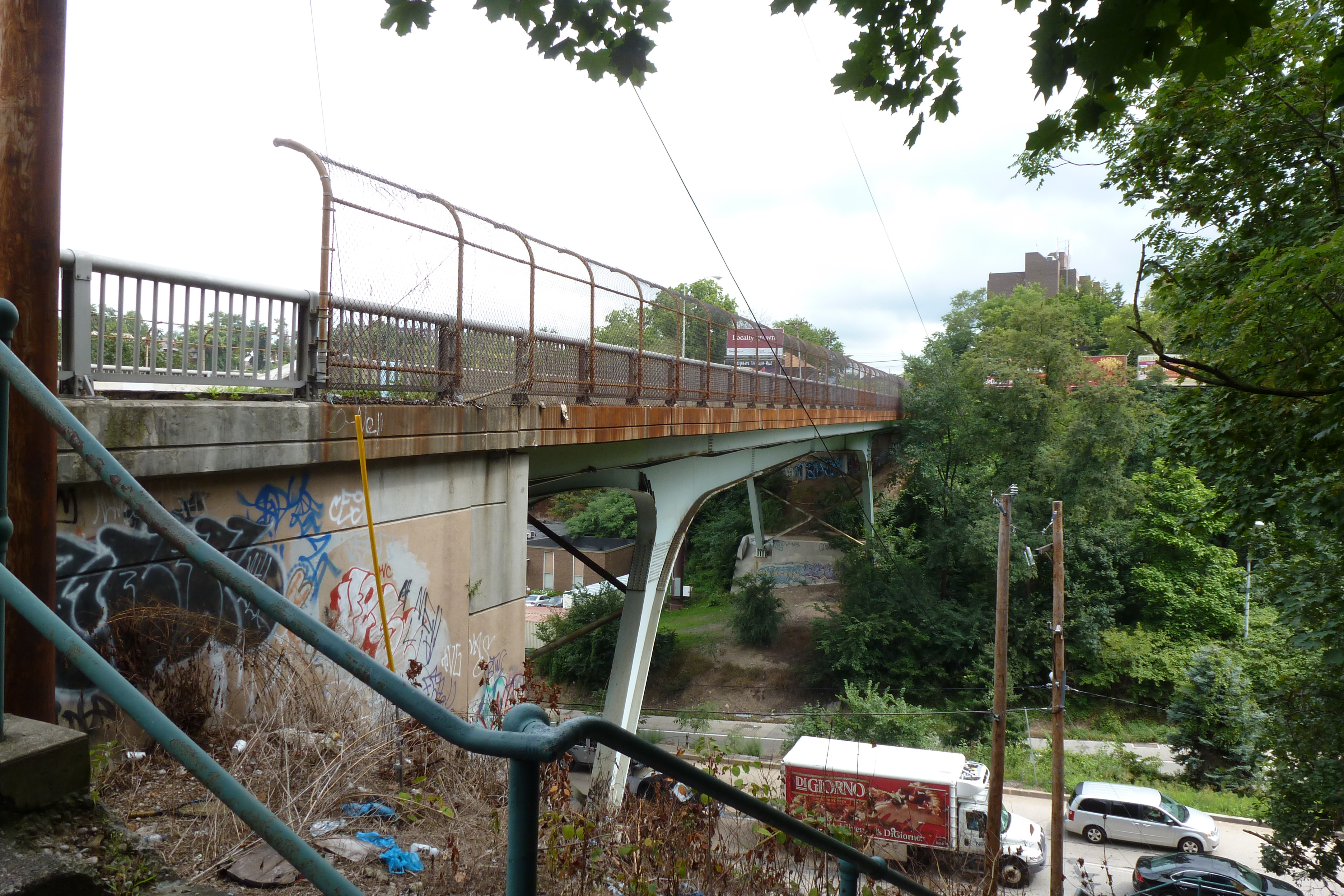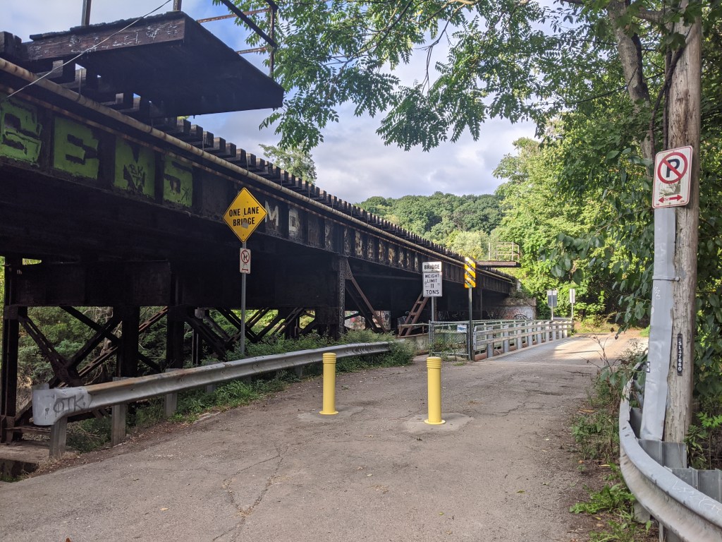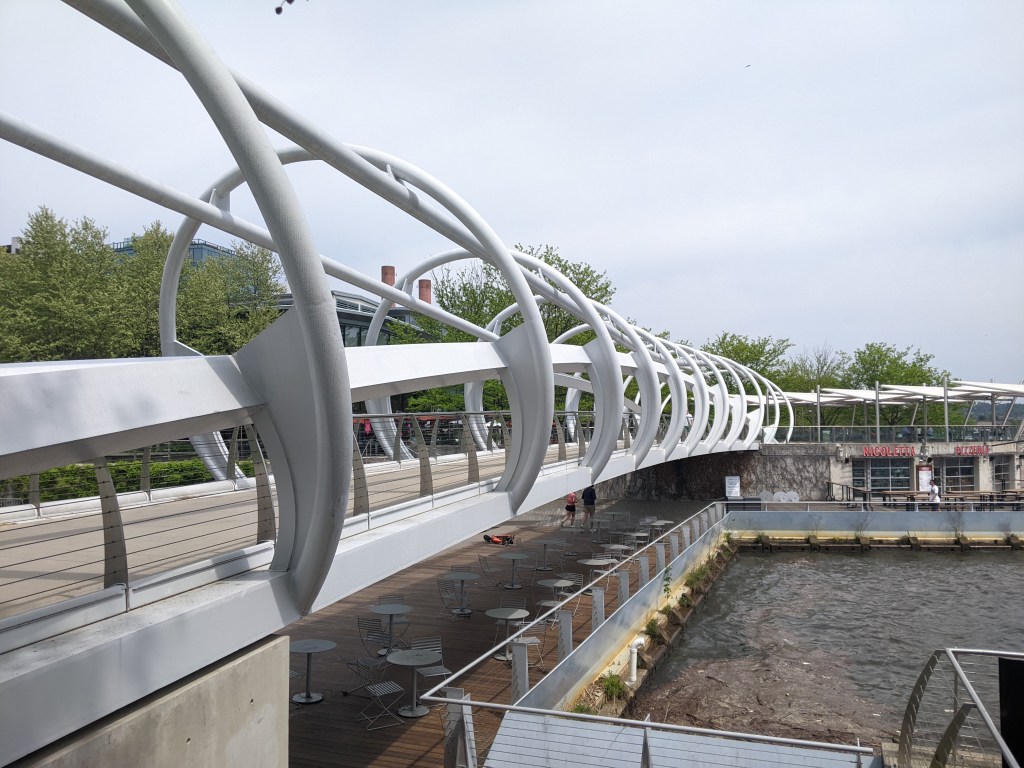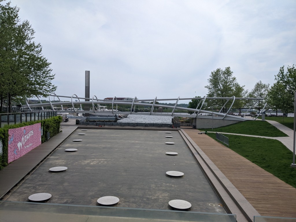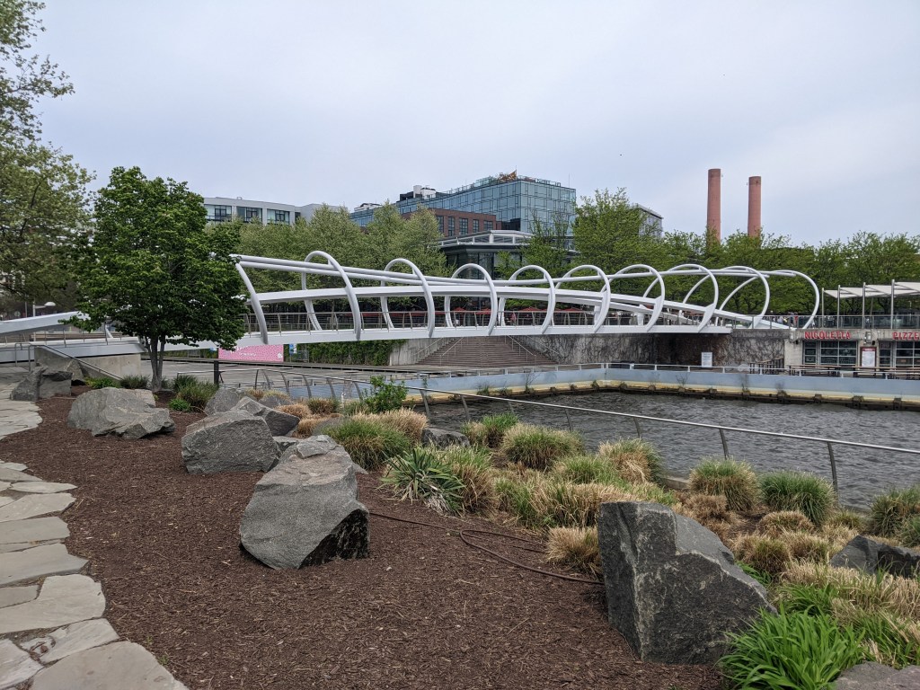 The open, through-arch Frederick Douglass Memorial Bridge was one of our expected encounters. I probably would have been ecstatic about the unexpected benches in the lookouts between the arches under previous circumstances. After all, it isn’t every day that you find a bench on a bridge. However, in the past, I probably would have just said “that’s cool,” photographed them, and moved on. Instead, I took full advantage of these seats for one of my rest and rehydration breaks. This slow down is the reason I spotted the Yard Park Bridge, a bridge I definitely needed to add to my collection.