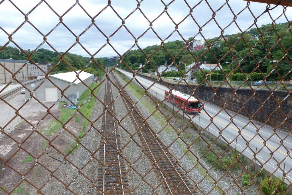 The 28th Street Bridge is one of Polish Hill’s two points of access to the lower regions between it and the Allegheny River, the second is the Herron Street Bridge (see post). This bridge is also the last pedestrian accessible bridge across the busway before downtown. Several of the views from this bridge are similar to, but better than, the ones from the Herron Street Bridge.