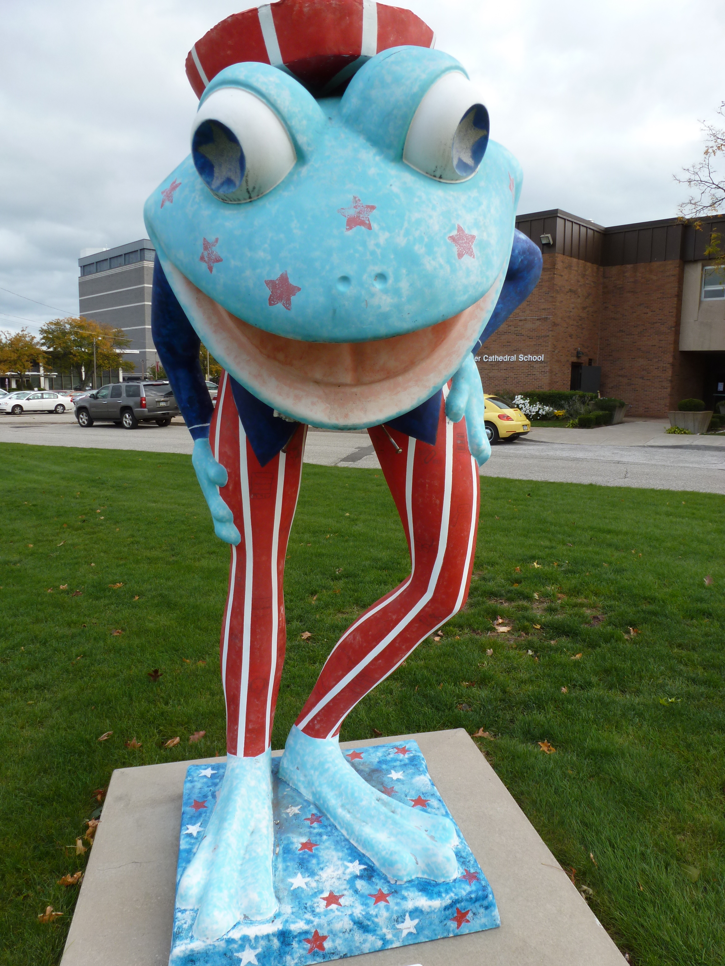 LeapFrog! was a fundraiser in Erie, PA, in 2004. “Experience America” by Cathedral Center Class of 2006 was one of the frogs I found in 2012. I think I found this one in the yard of what is now the Mother Teresa Academy near the corner of Sassafras and W 11th Street. According to Ami H.’s map, this frog moved to Splash Lagoon.