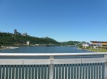 There is a nice view downriver from this bridge.  Several famous Pittsburgh sites are included in the view: the Point, the Duquesne Incline, and Heinz Field.  Other sites of interest in this view are the Carnegie Science Center, the West End Bridge, and the remnant of a former bridge across the Allegheny.  The view upriver is partially obstructed by the wire mesh fence along the interstate bridge.  I did get a couple of shots that you can mostly make out what is there.  One shows downtown Pittsburgh and the other shows the bridges upriver including the Three Sisters (see June 14th, June 21, and June 22 post) and a railroad bridge.  There is an item of interest I want to point out in this second view: just about in the middle of the frame, the domes of the Immaculate Heart of Mary Catholic Church on Polish Hill.  This is one of my favorite buildings in Pittsburgh, because of its unique green domes that are a significant landmark visible for miles up and down the Allegheny River.