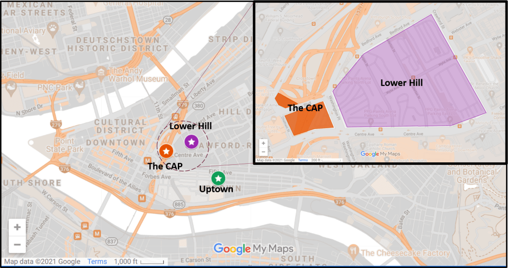 The CAP is a project in Pittsburgh “fixing the mistakes” of Urban Renewal. The Crosstown Blvd was built in the 1960s creating a freeway in a canyon dividing the Lower Hill neighborhood from downtown. The Lower Hill neighborhood, formerly predominantly poor and black, had already been demolished by this point to make way for the Civic Arena and other cultural amenities that were never built.