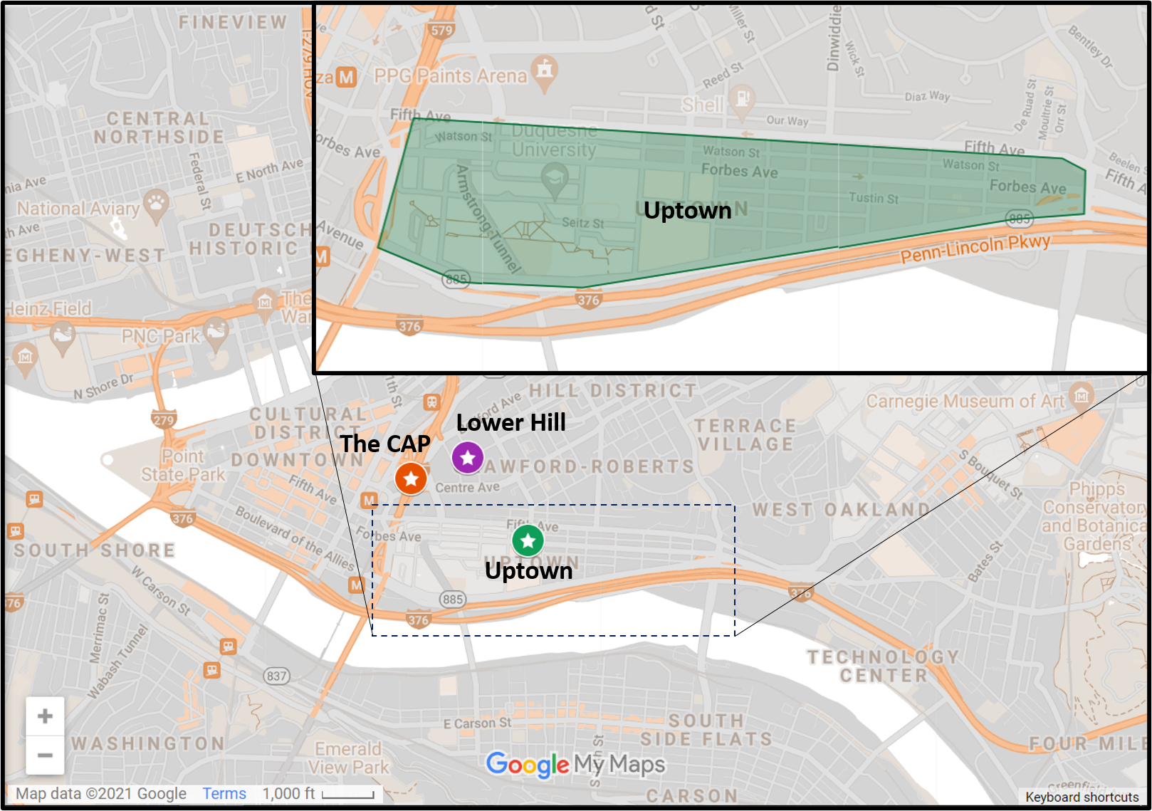 The Uptown community saw these changes coming and prepared. Between 2015 and 2017, the community organization Uptown Partners collaborated UPMC Mercy, Duquesne University, the City of Pittsburgh, and others to create the EcoInnovation District Plan and the Uptown Public Realm zoning district. The plan and new zoning district are intended to guide future development and leverage their economic investment for the greater good of the neighborhood. Ideally, this will reduce the number of those who will be left behind.