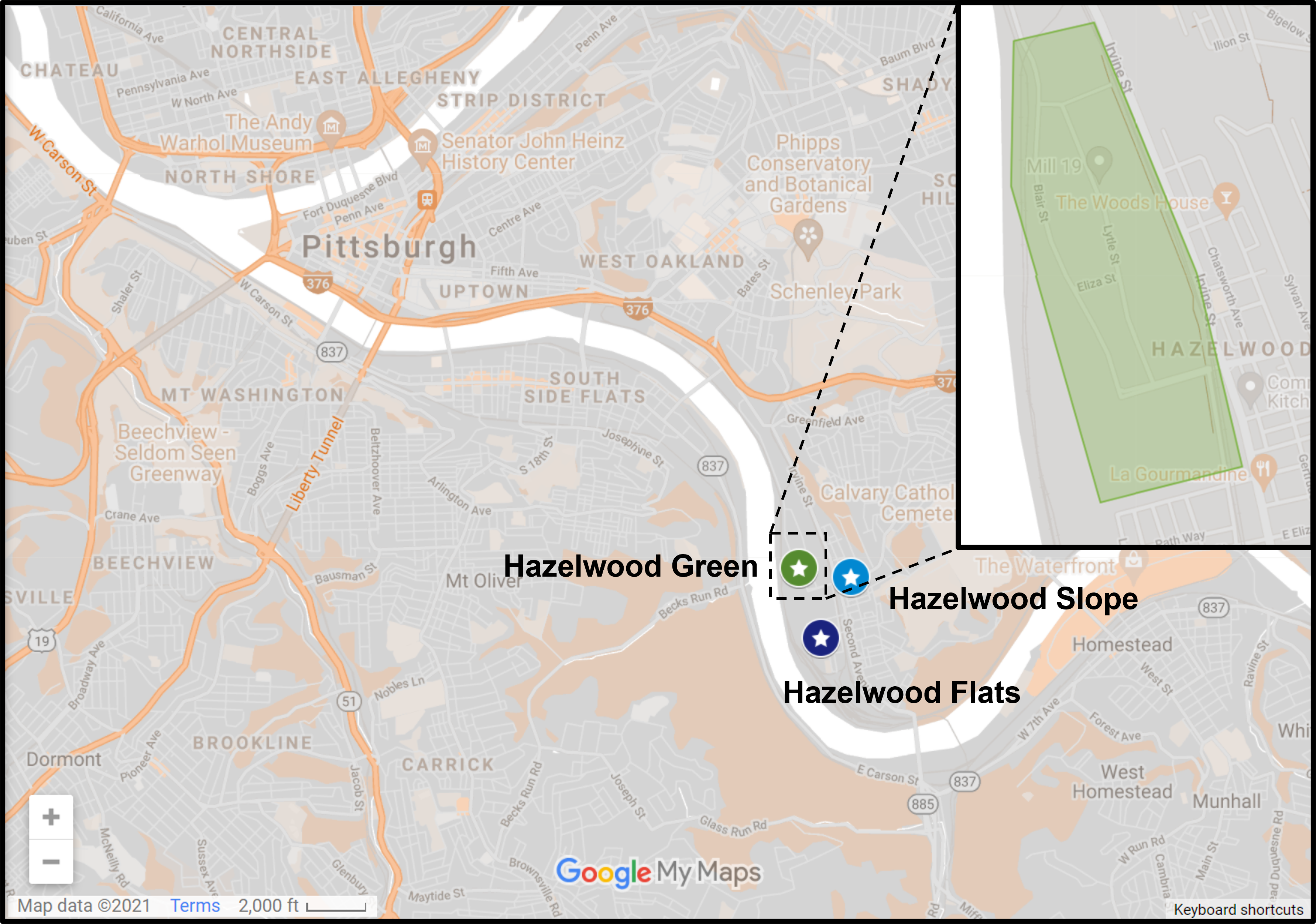 Hazelwood is a neighborhood about 4 miles down the Monongahela River from downtown Pittsburgh. It is currently experiencing significant change. Between Hazelwood’s main street (2nd Avenue) and the Monongahela River is a 178-acre site of the former Jones and Laughlin Steel Company. Most of the structures from the mill were demolished, leaving a large brownfield. In 2002, the site was purchased for redevelopment by Almono LP (at the time, an entity made up of four Pittsburgh foundations). After years of planning and a rebranding of the site as Hazelwood Green, a series of public streets and the first building opened for use in 2019. Construction is underway for more buildings and a public plaza.