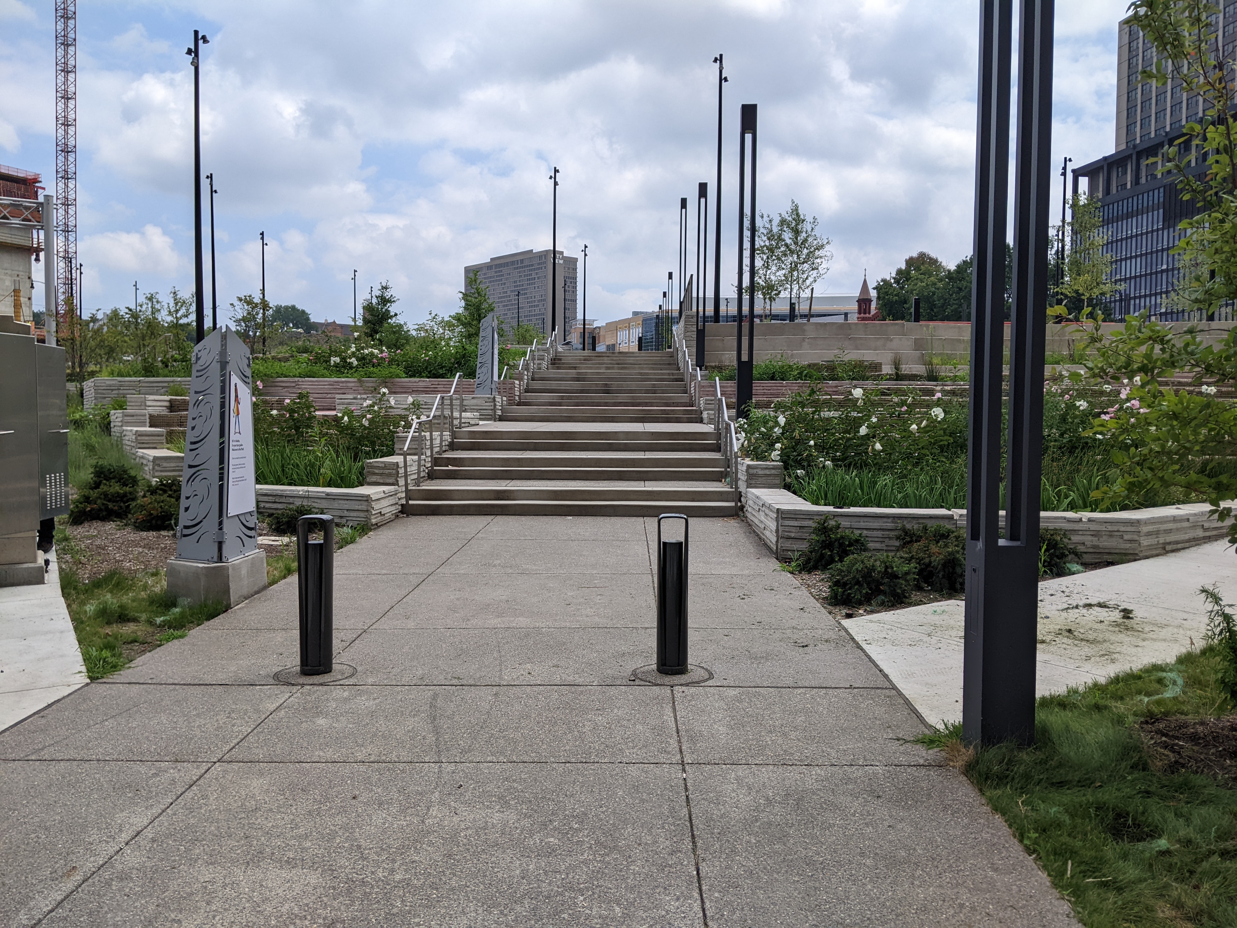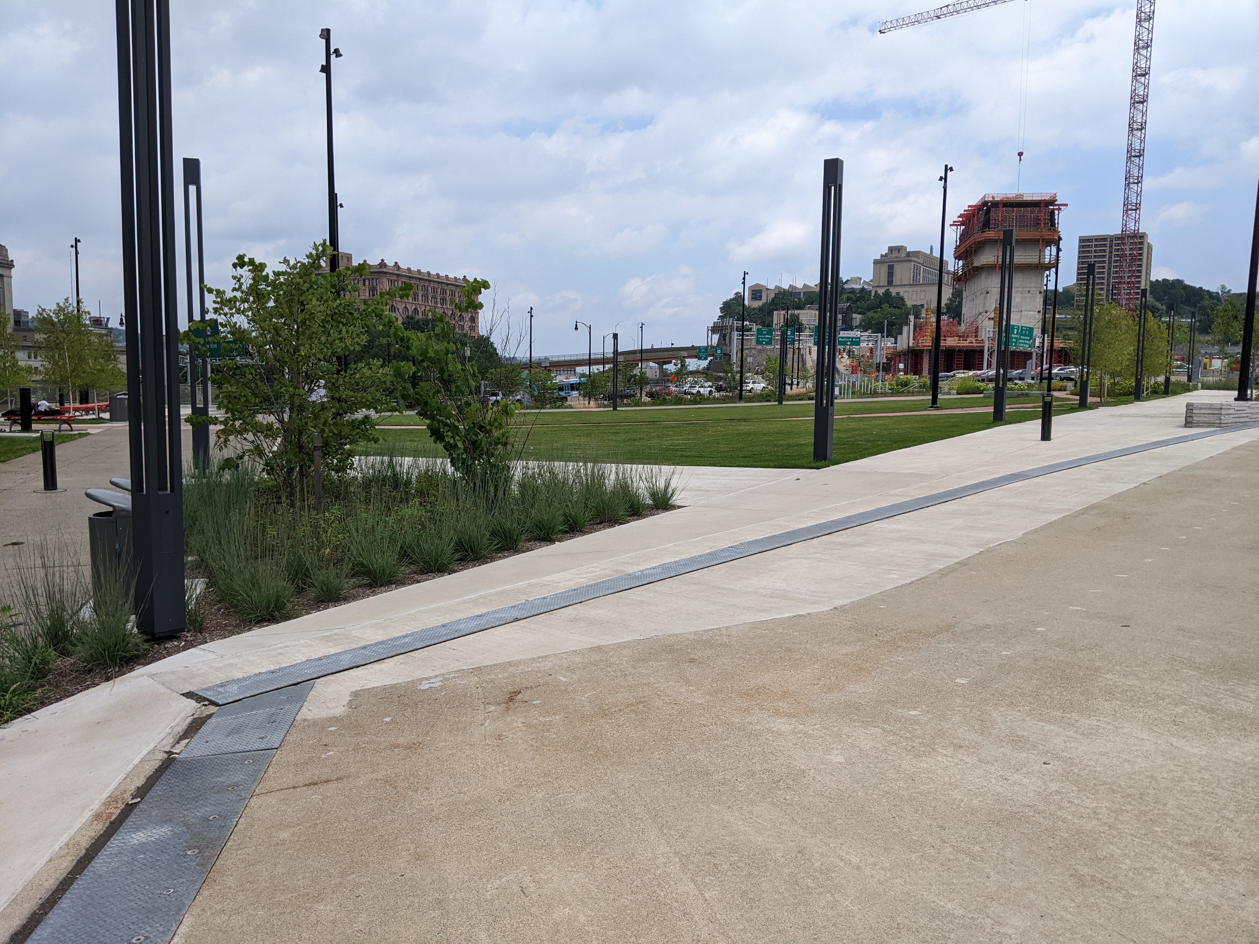 This week, I took a lunch-time walk through the new Frankie Pace Park to see what the completed CAP project looks like and how it is used. There were two men sleeping on benches in the park and a handful of other people walking the paths singly or in pairs. Prior to 2020, I would have interpreted this as a failure of the park to attract users because any green space downtown between 12 and 1 was always full of people. However, in the continuing fallout of the pandemic, a handful of people walking or using the seats is typical even of the parks that you used to need to arrive before 11:59 if you wanted to find a seat to eat your lunch.