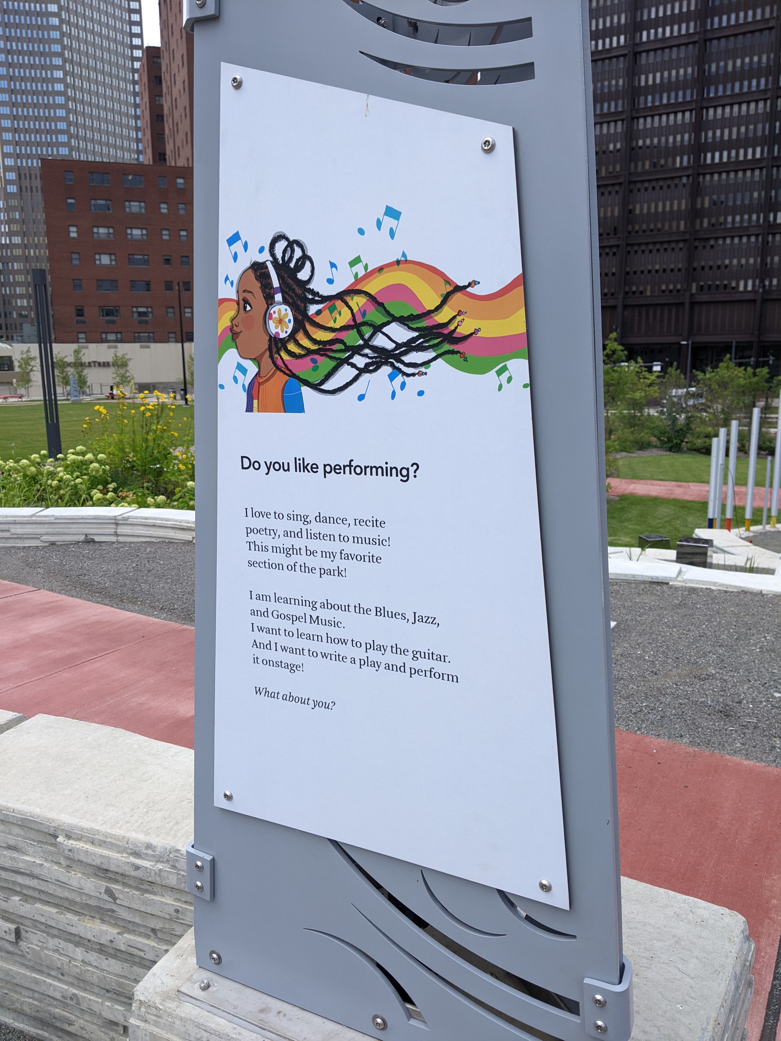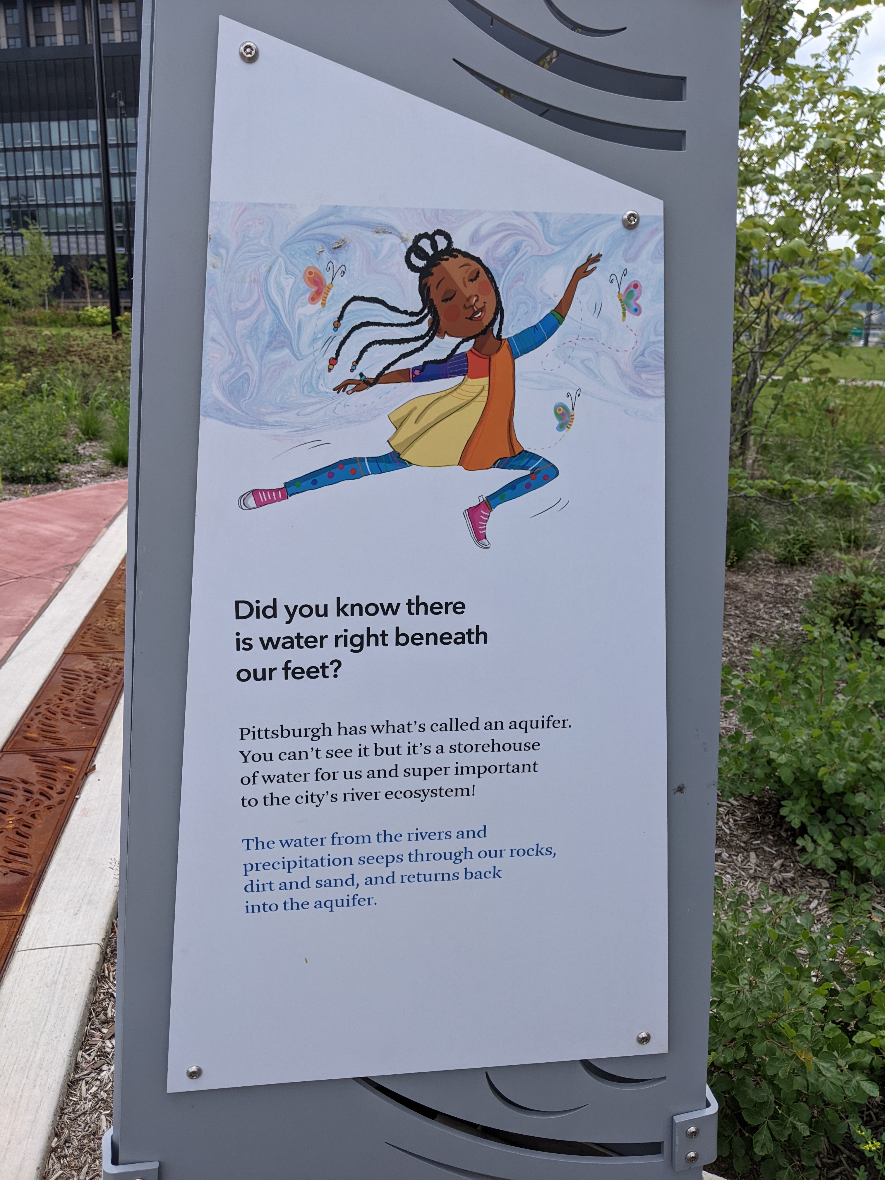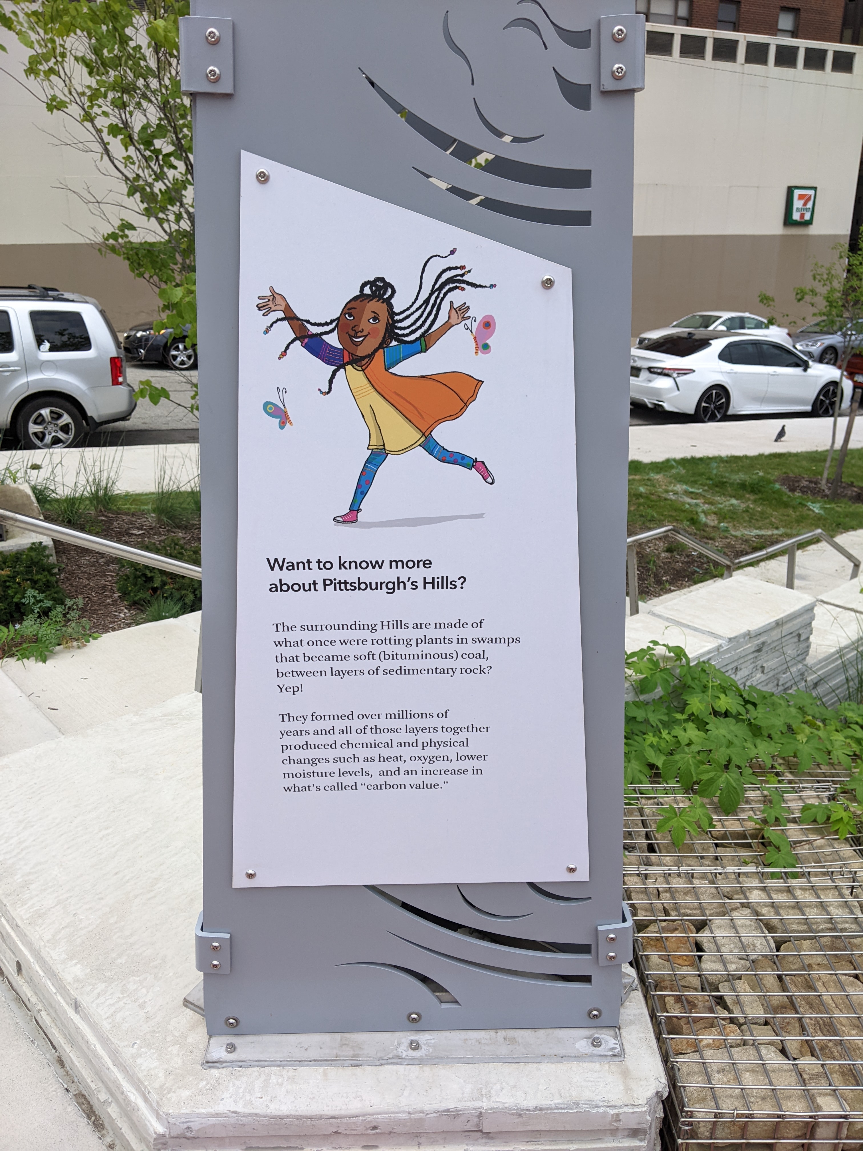When I first explored the interior of the Frankie Pace Park, I was surprised by the wayfinding approach. A series of signs are posted throughout the site describing different features of the park, such as the rain garden. The surprising part was the choice of a Black girl narrator who wants you to join her as you journey through the park. It felt like the intended audience is elementary school-aged children. Given the park’s location adjacent to the tallest office skyscrapers downtown, adjacent to the first new building to be built on the Lower Hill – another office building, and kitty-corner-ish to the Penguins hockey arena, children seem to be a very small percentage of the prospective users of the park.