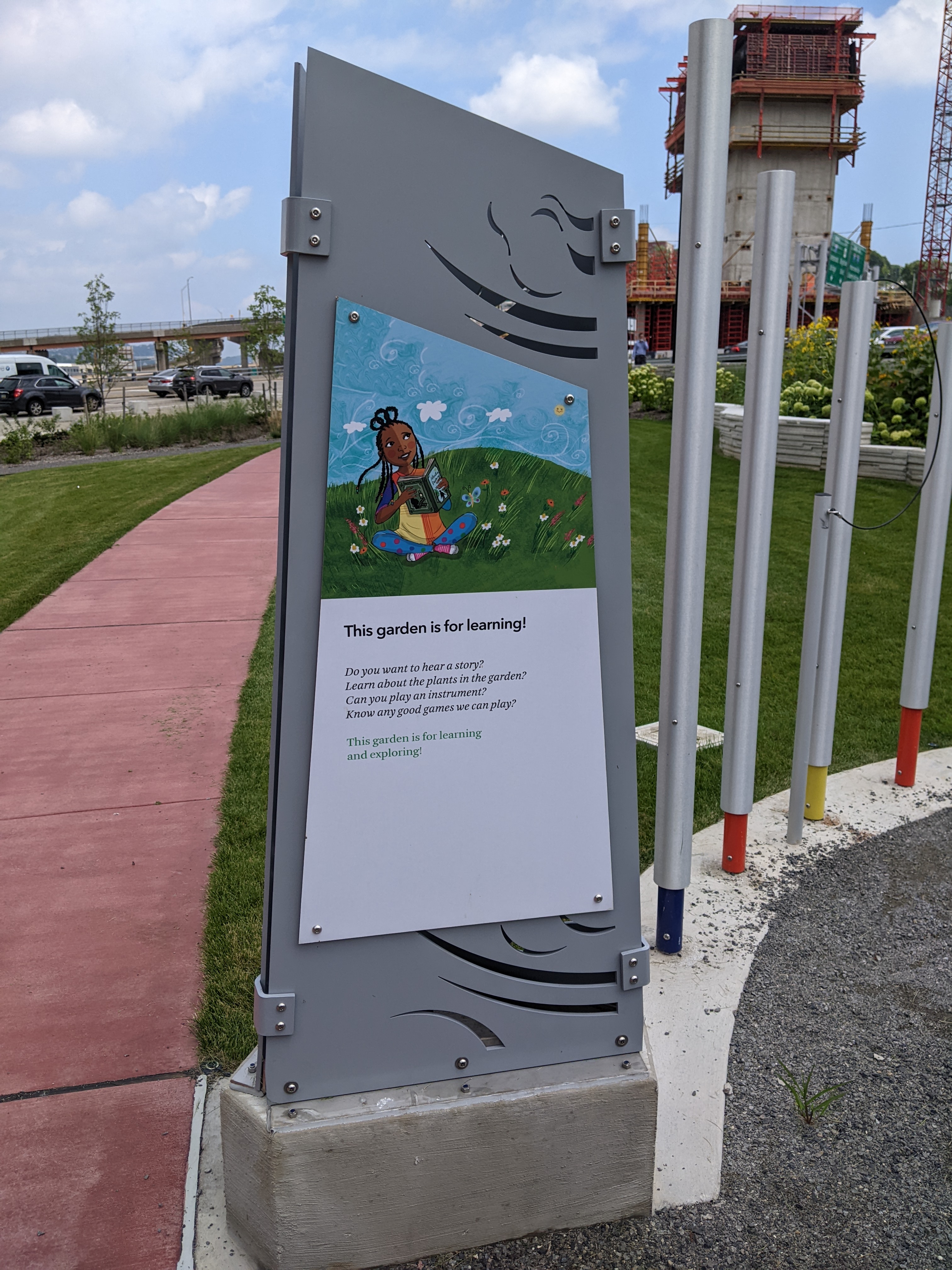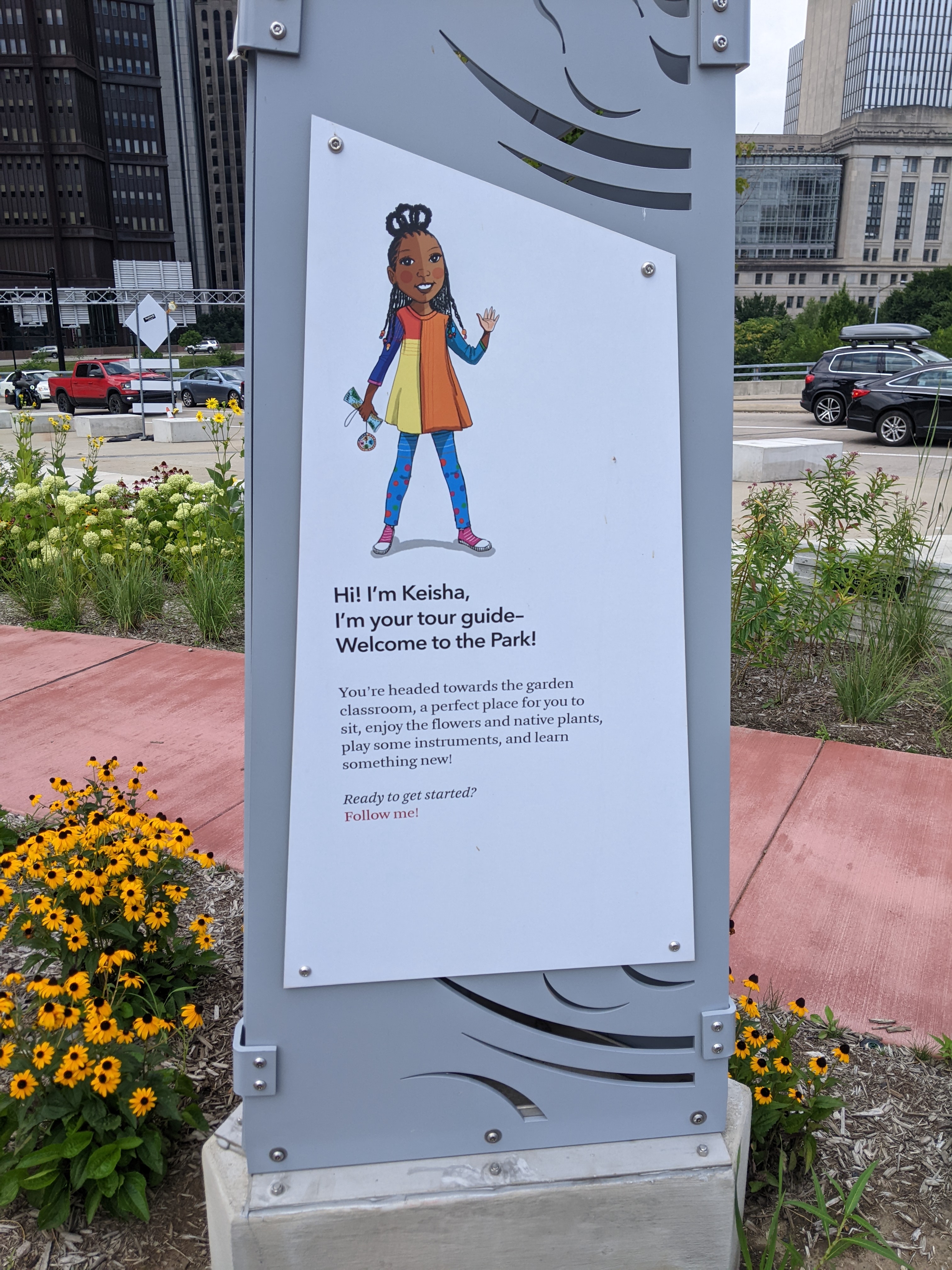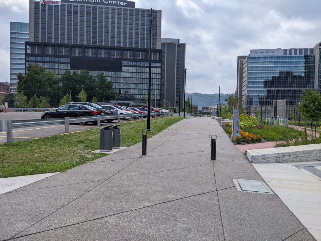 When I first explored the interior of the Frankie Pace Park, I was surprised by the wayfinding approach. A series of signs are posted throughout the site describing different features of the park, such as the rain garden. The surprising part was the choice of a Black girl narrator who wants you to join her as you journey through the park. It felt like the intended audience is elementary school-aged children. Given the park’s location adjacent to the tallest office skyscrapers downtown, adjacent to the first new building to be built on the Lower Hill – another office building, and kitty-corner-ish to the Penguins hockey arena, children seem to be a very small percentage of the prospective users of the park.