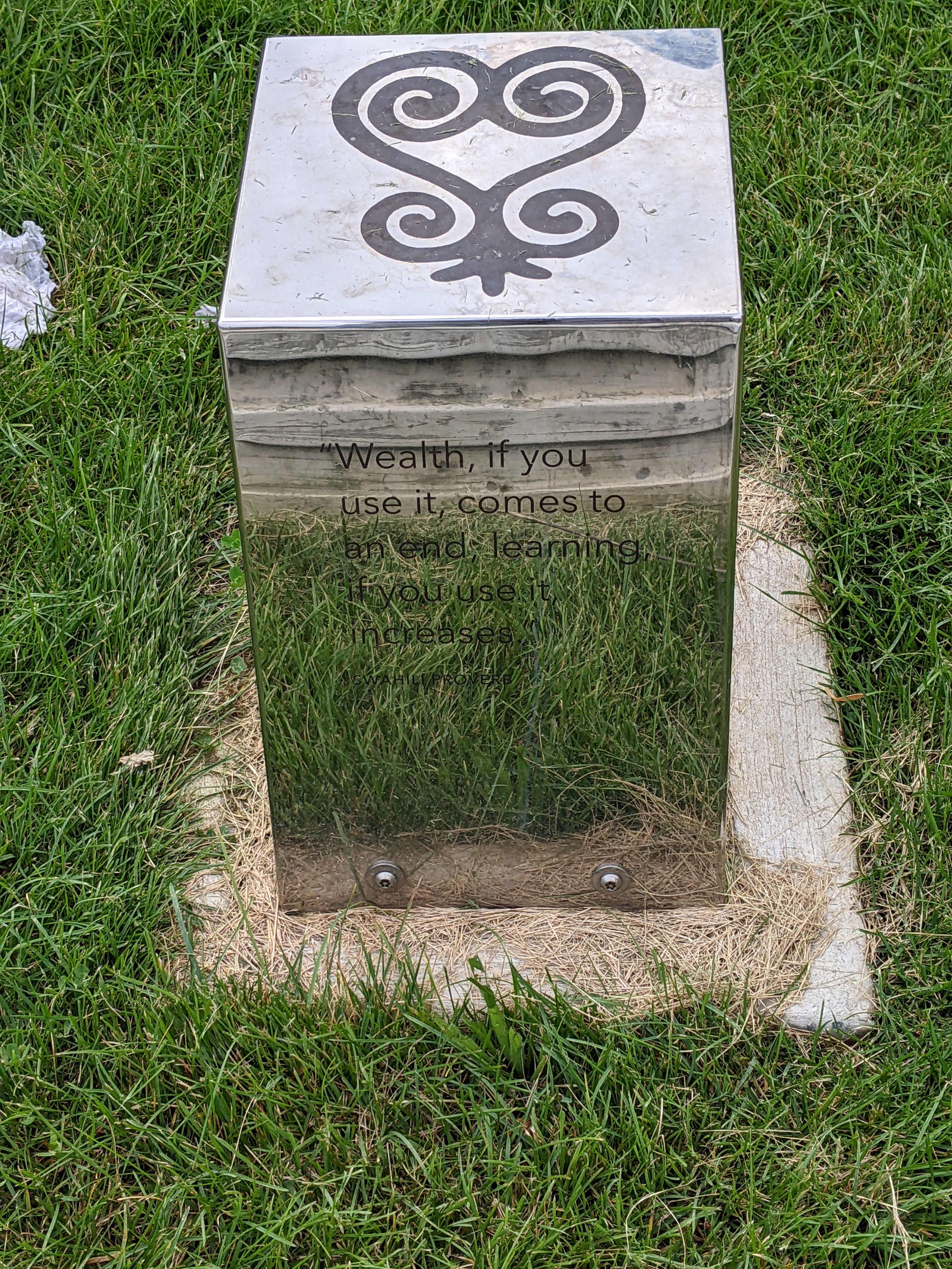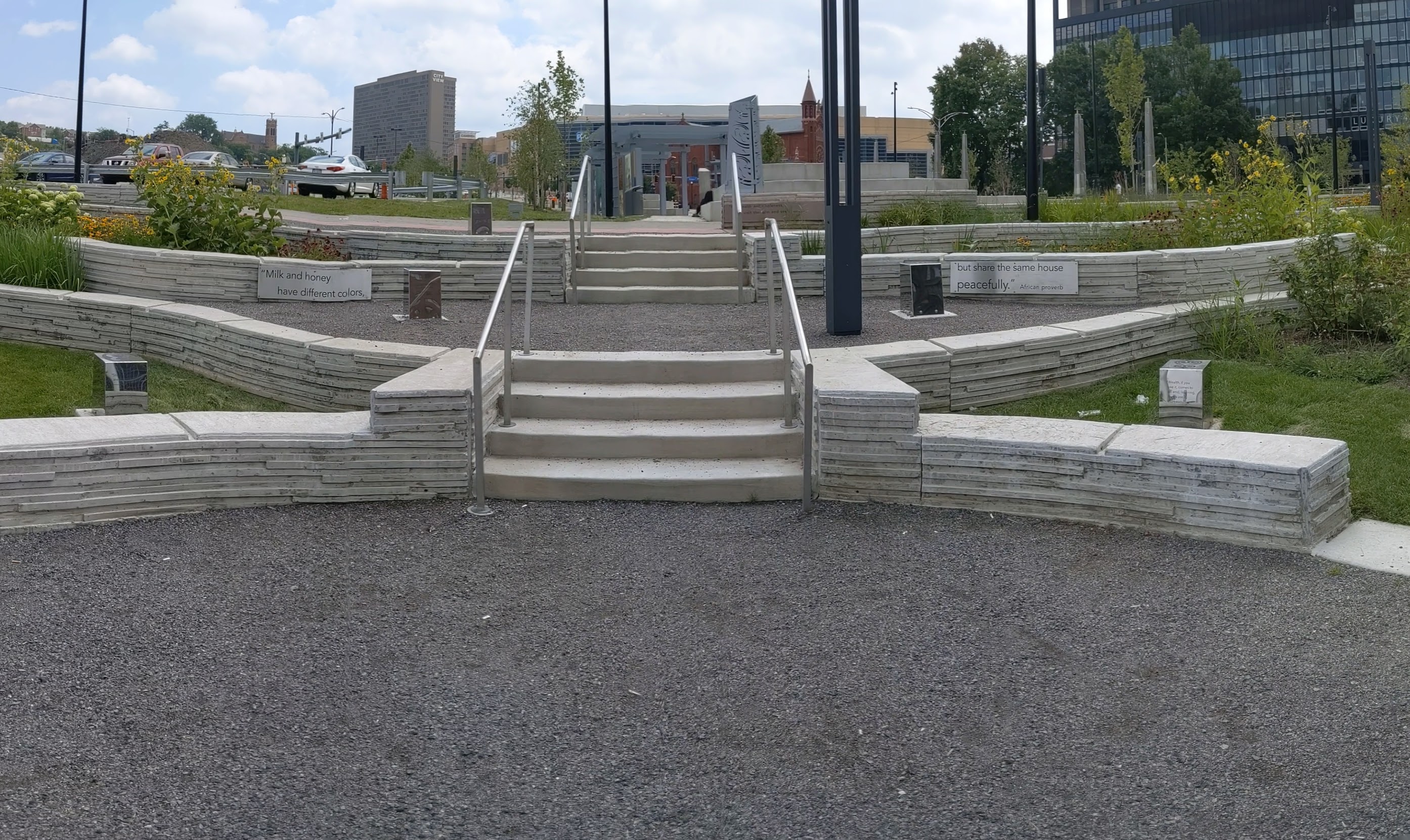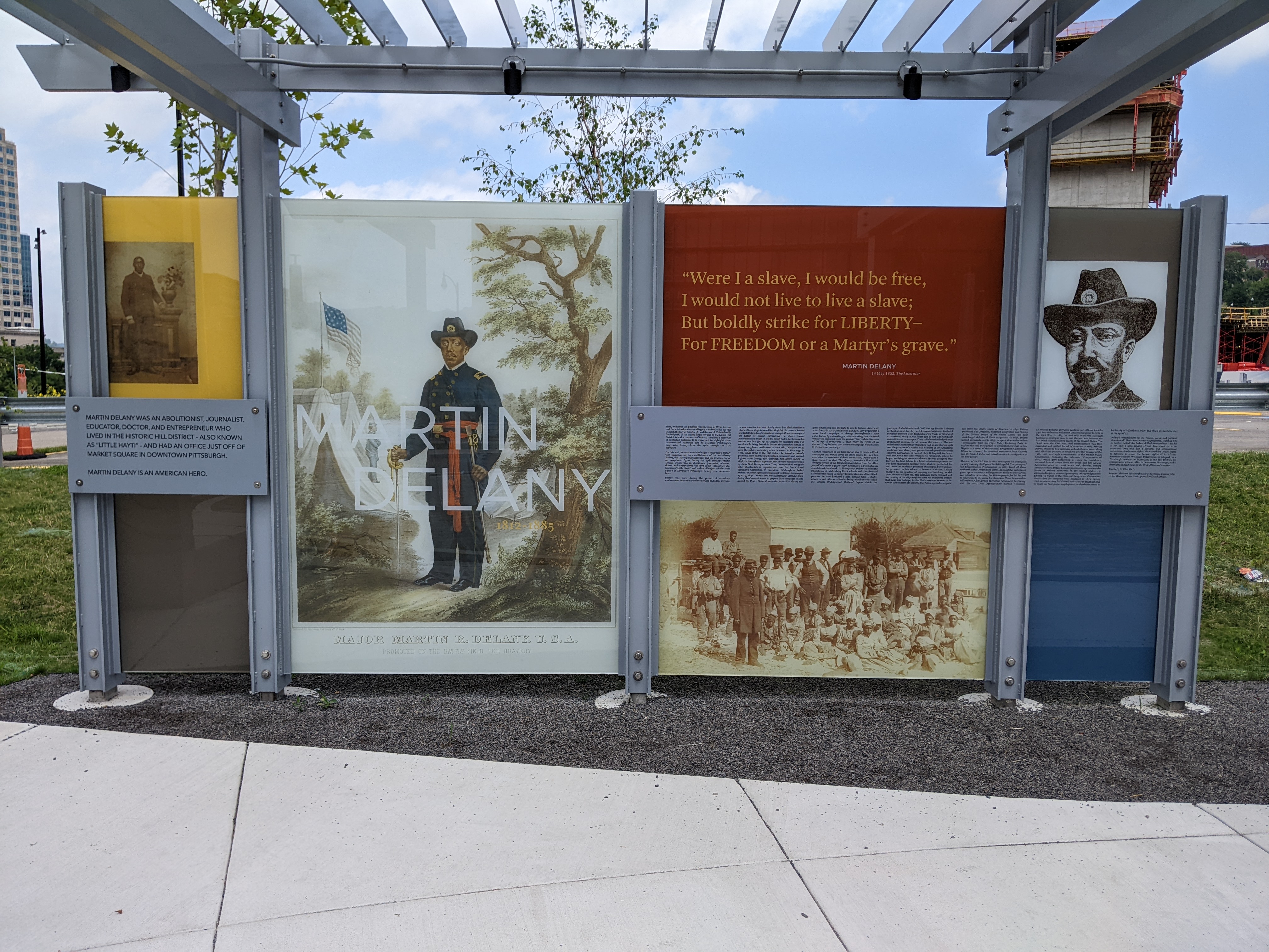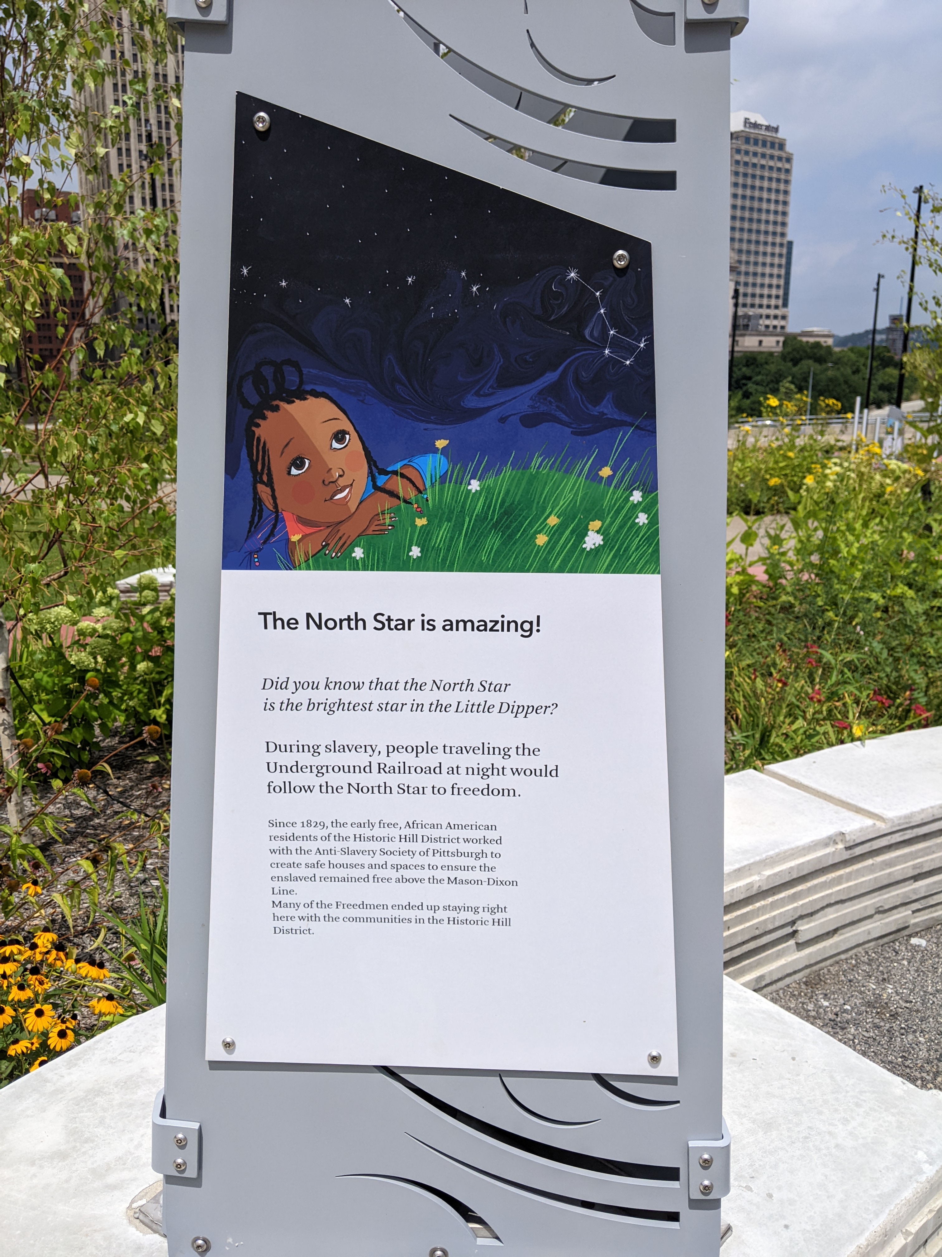 In addition to the infrastructure restitching the physical gap between downtown and the Lower Hill, the public art installed throughout the park aims to at least partially stitch the cultural gap that is one of the legacies of Urban Renewal and other segregationist policies. An educational display tells the stories of Frankie Pace, a 20th century activist for the Hill District neighborhoods of Pittsburgh, and Martin Delany, an abolitionist, journalist, and doctor in 19th century Pittsburgh. Throughout the park, proverbs of African heritage are etched on the walls and on metal blocks as reflective as Chicago’s Cloud Gate.