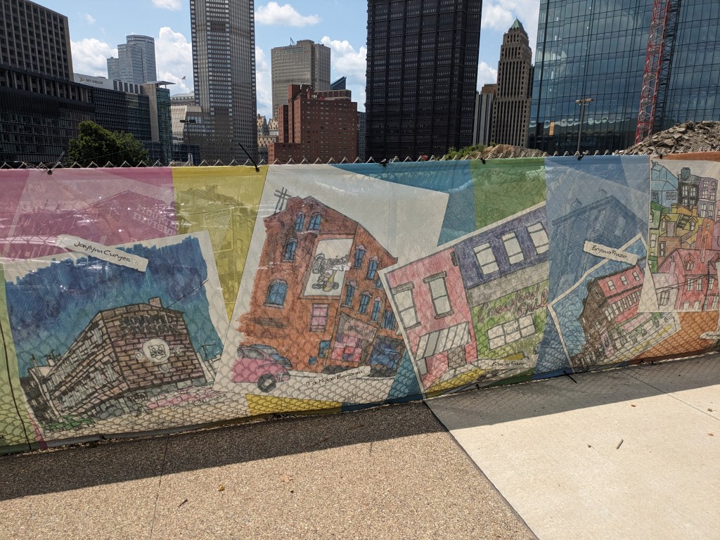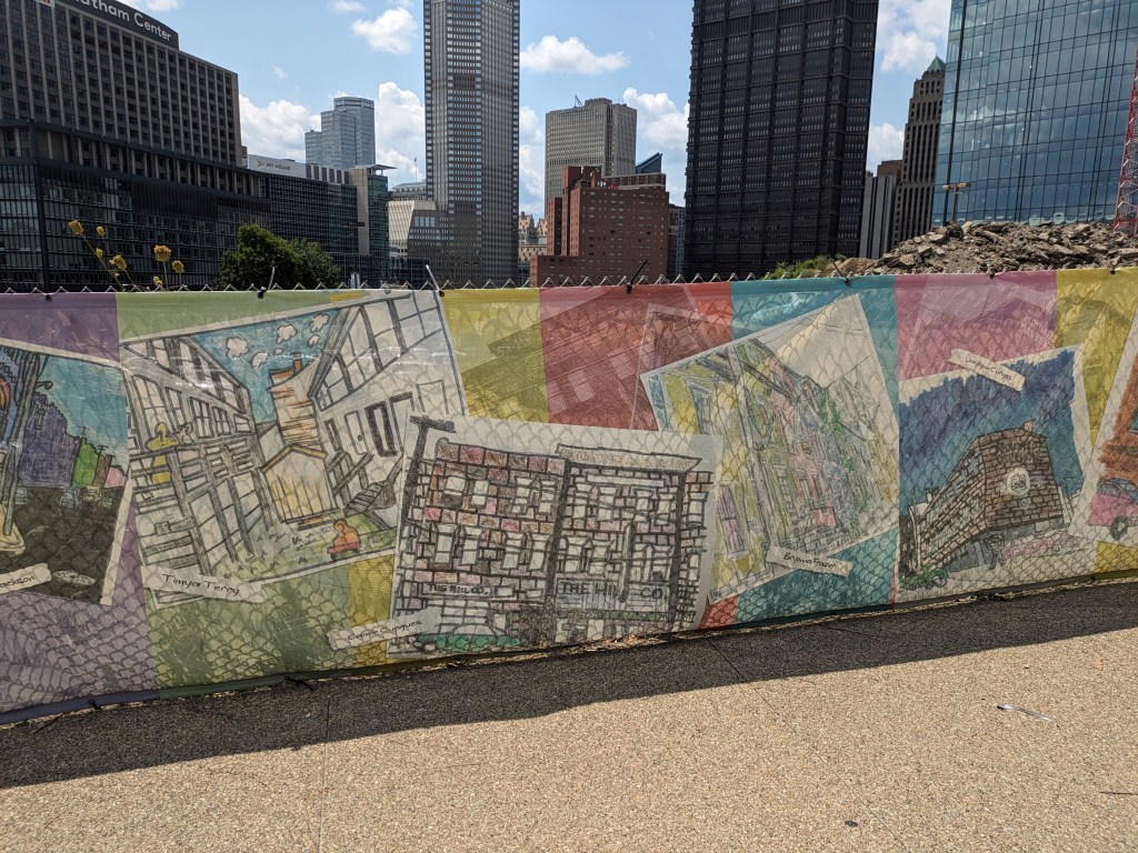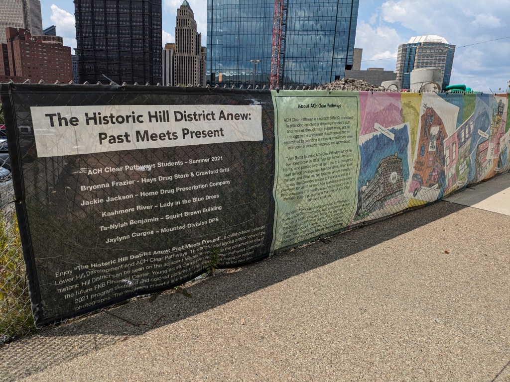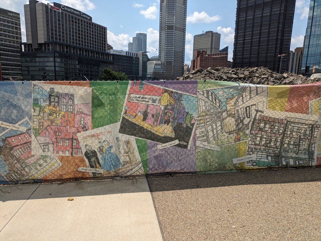 The construction fencing now has a temporary art installation by a non-profit that based in the Hill District and focused on connecting youth with arts.