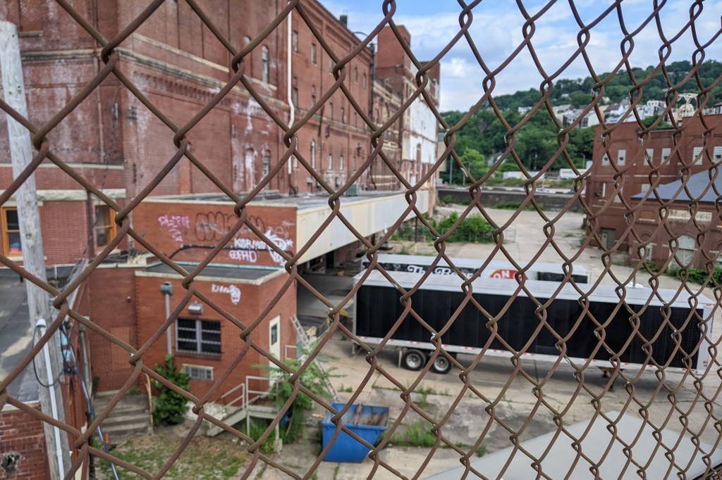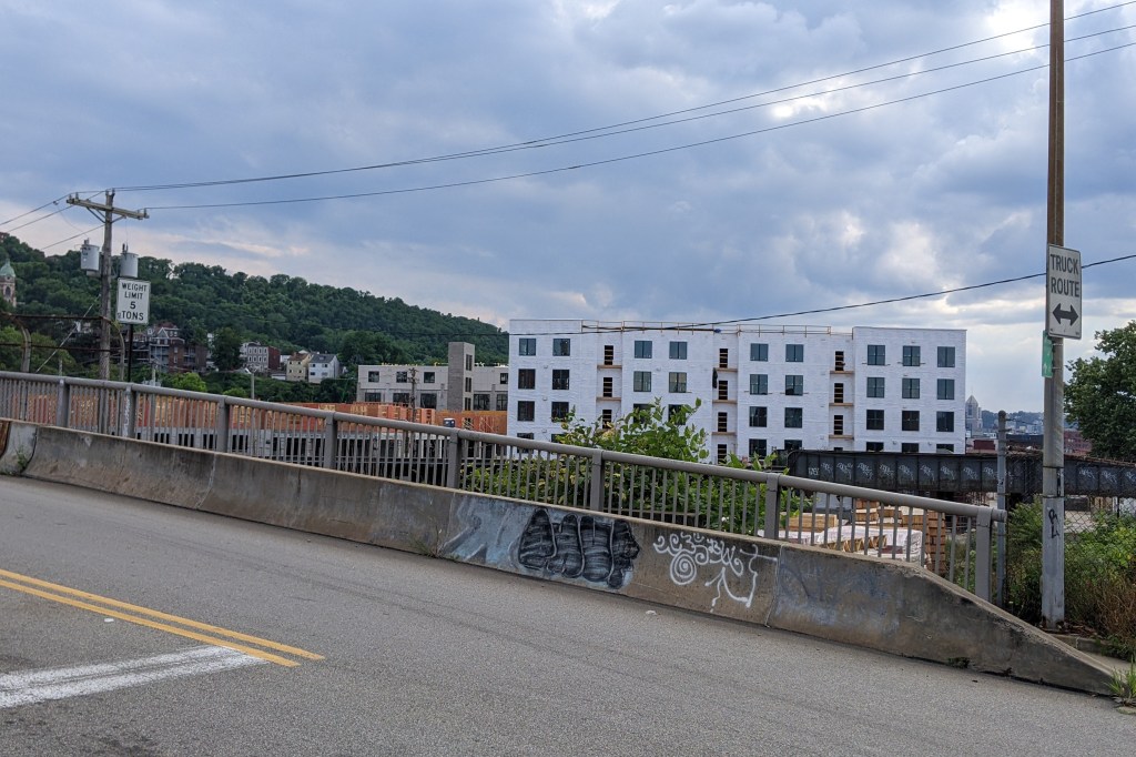 Several well-known landmarks (which I have mentioned in other posts) are visible from the 31st Street Bridge. First on the downstream side (above left) is the Immaculate Heart of Mary Church. Perhaps because of the lighting and angle, I don’t think it appears as impressive in the picture as it does in real life. I mentioned this landmark previously in my post about the Fort Duquesne Bridge. On the other side of the bridge (above right), the most famous landmark is Children’s Hospital, which came up in the 9th Street Bridge post. Before doing this project, I don’t think I realized just how big Children’s Hospital is. I thought it was big, but I’ve learned from observing it from the 9th and 31st Street bridges that it is actually huge. Closer to the bridge a little lower on the hill from the hospital is the St. Augustine Church in Lawrenceville, one of the many large, old, and beautiful churches in the city. I’d also like to point out the little church on the right-hand side of the photo towering above its surroundings. I don’t want to go into much detail about it now, but it is one of Pittsburgh’s repurposed churches and I will be coming back to it in a future post.
