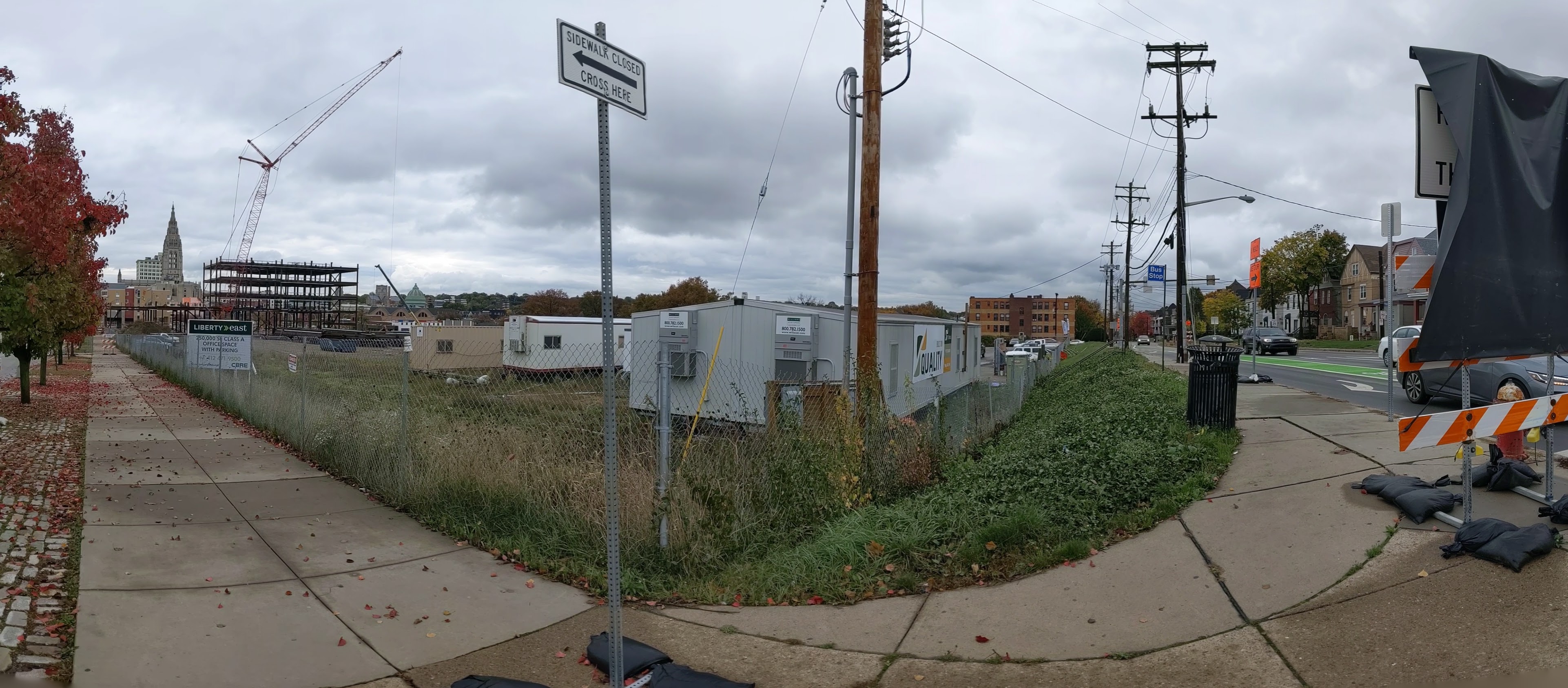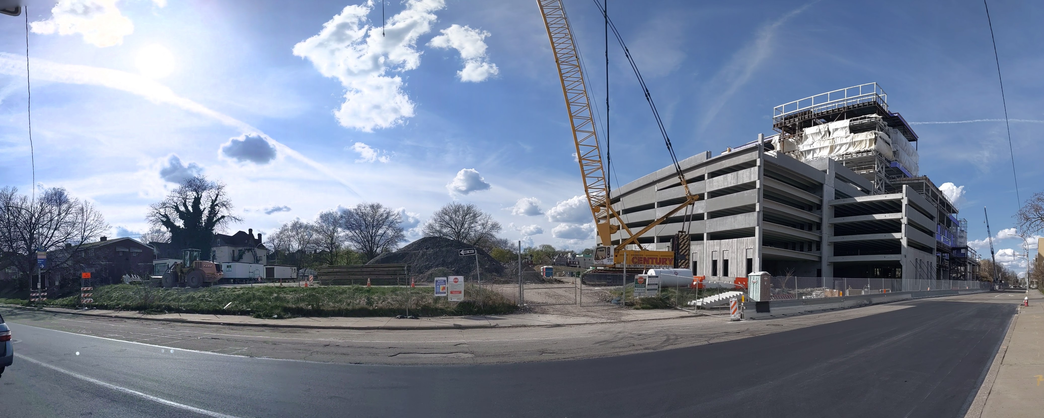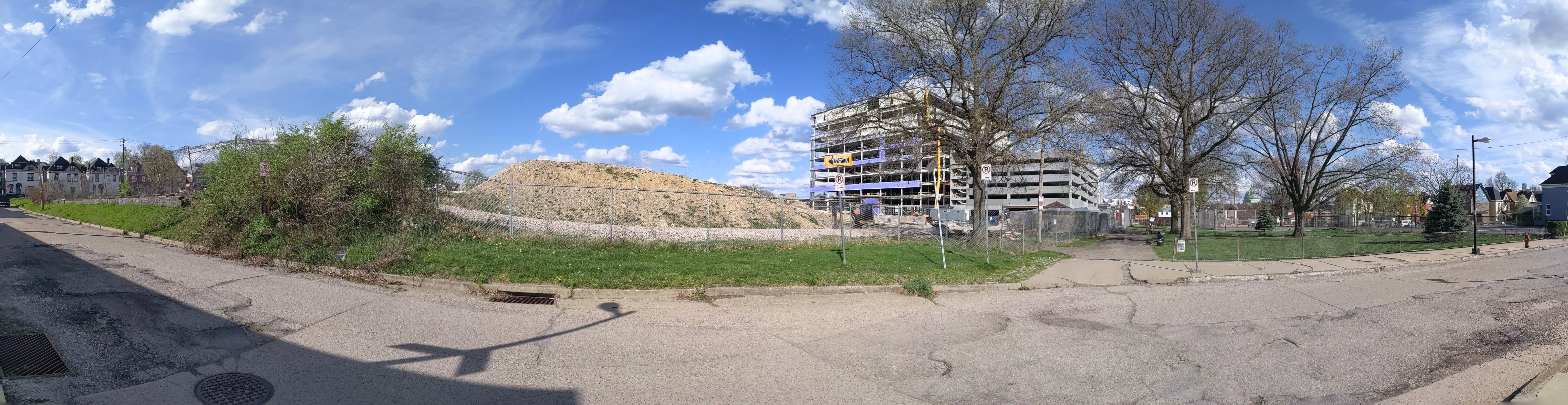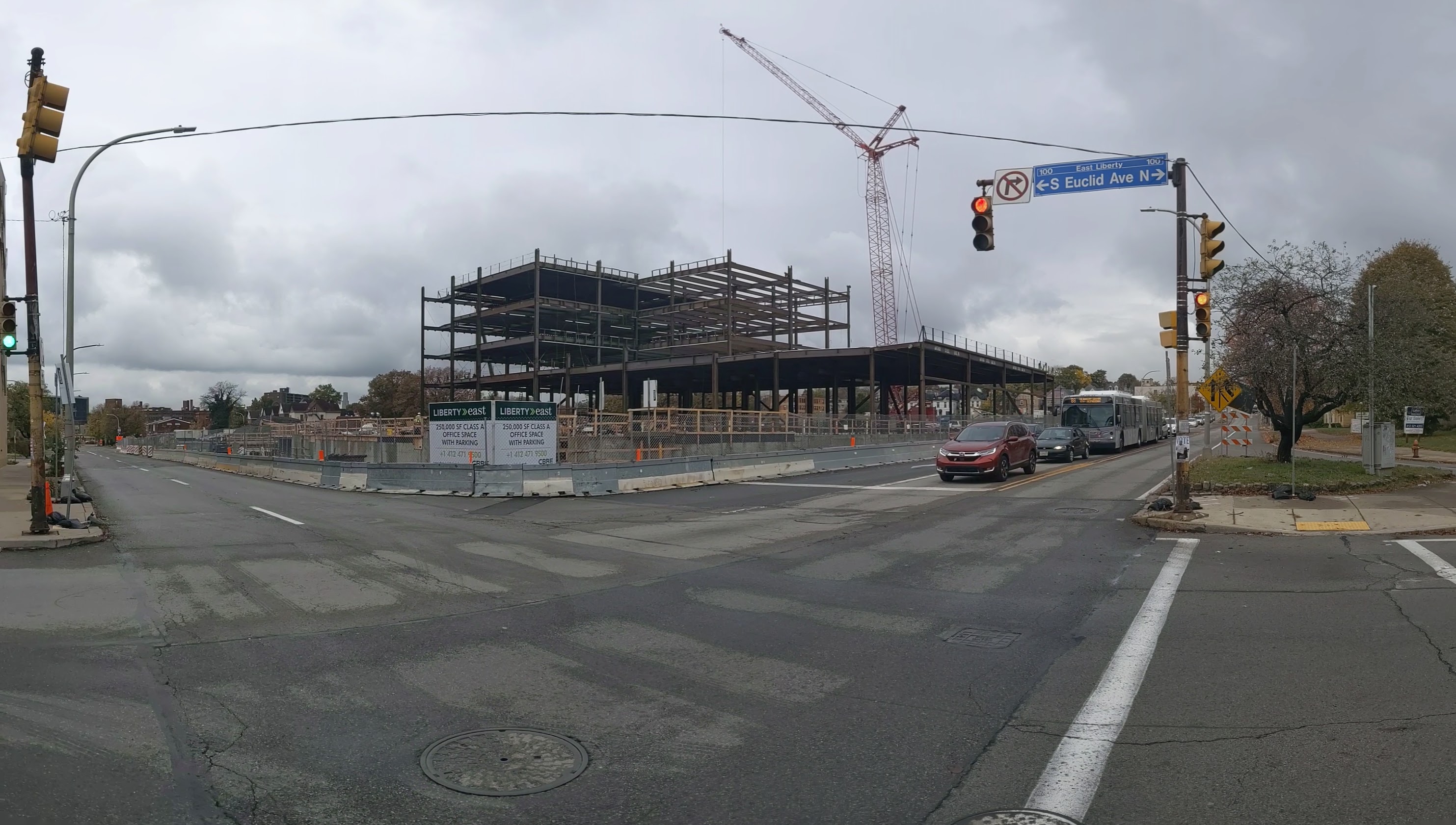 Around the site, the re-establishment of two-way traffic on Euclid Avenue continues; the renovation of the nearby apartment building also progresses, though now they look like they belong in California instead of Pittsburgh since the brick was covered up; and the former site of the East Liberty Lutheran Church remains vacant.