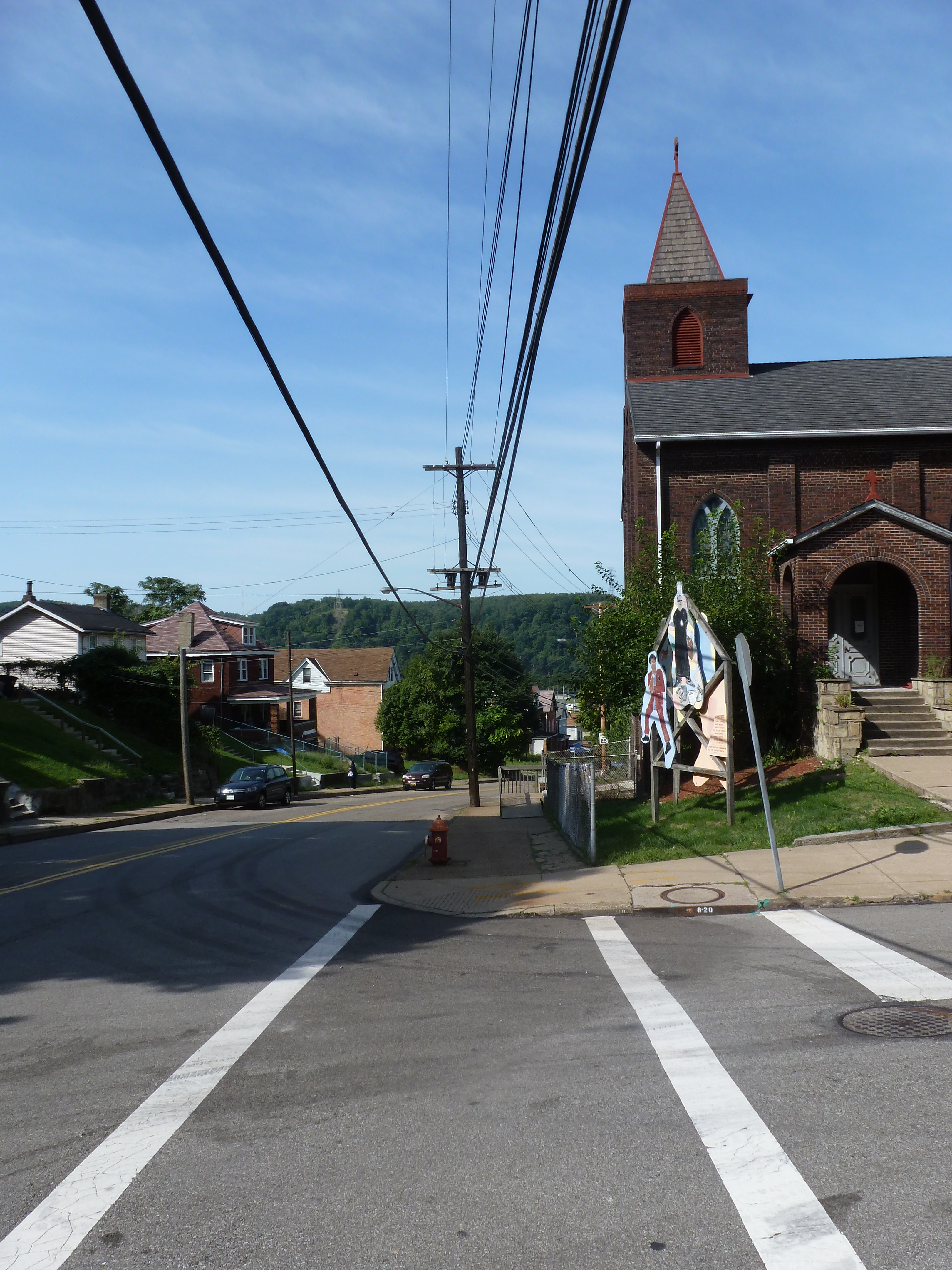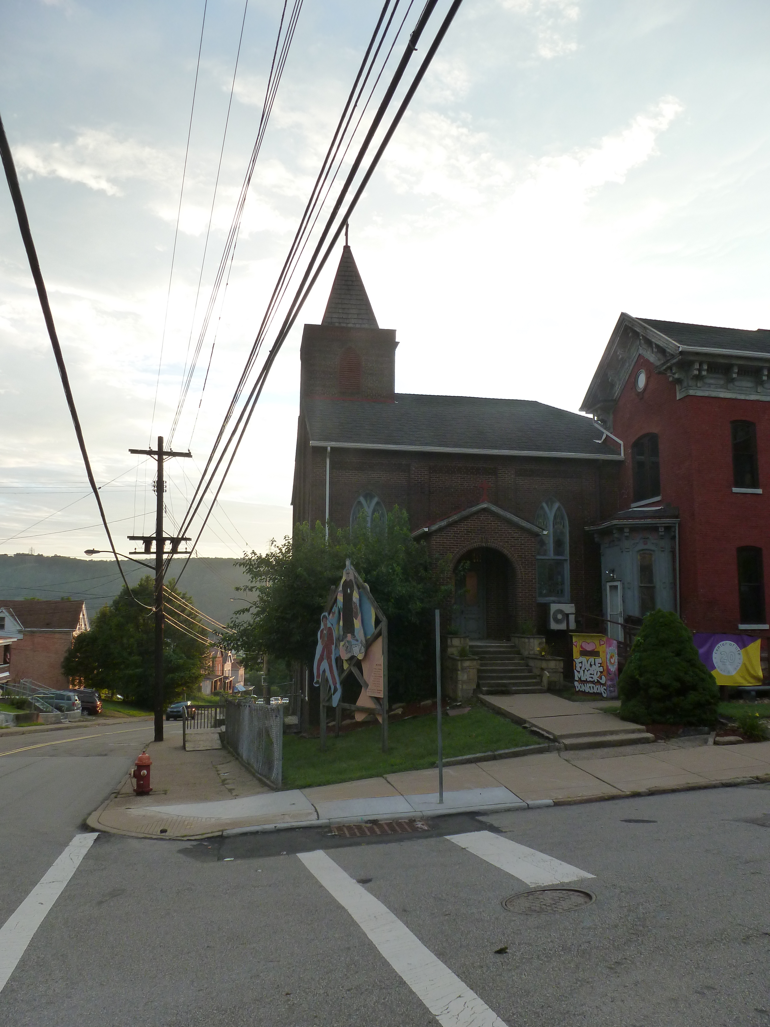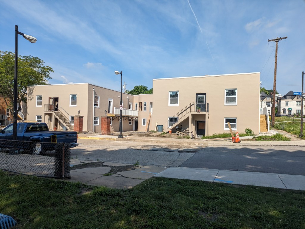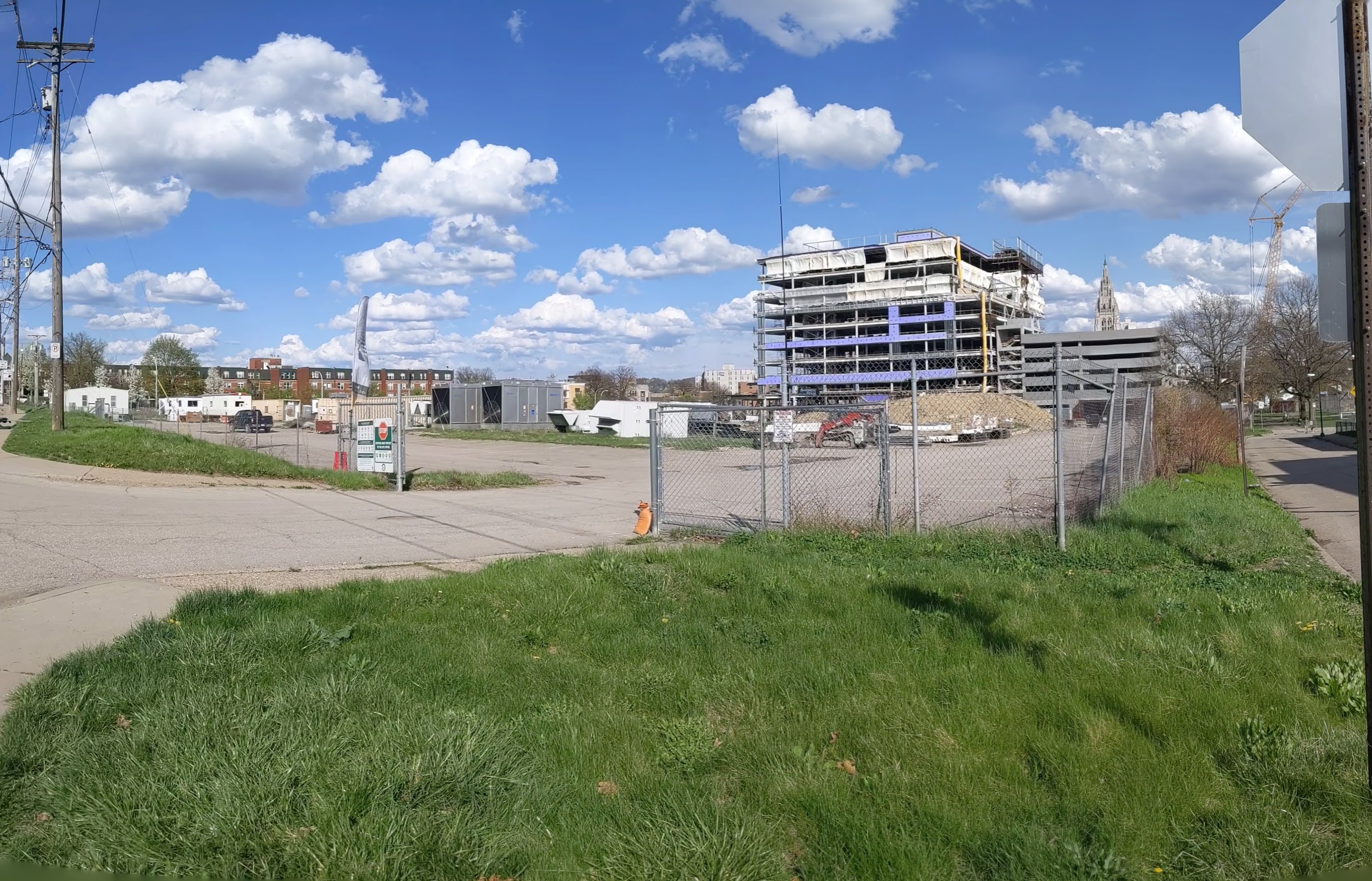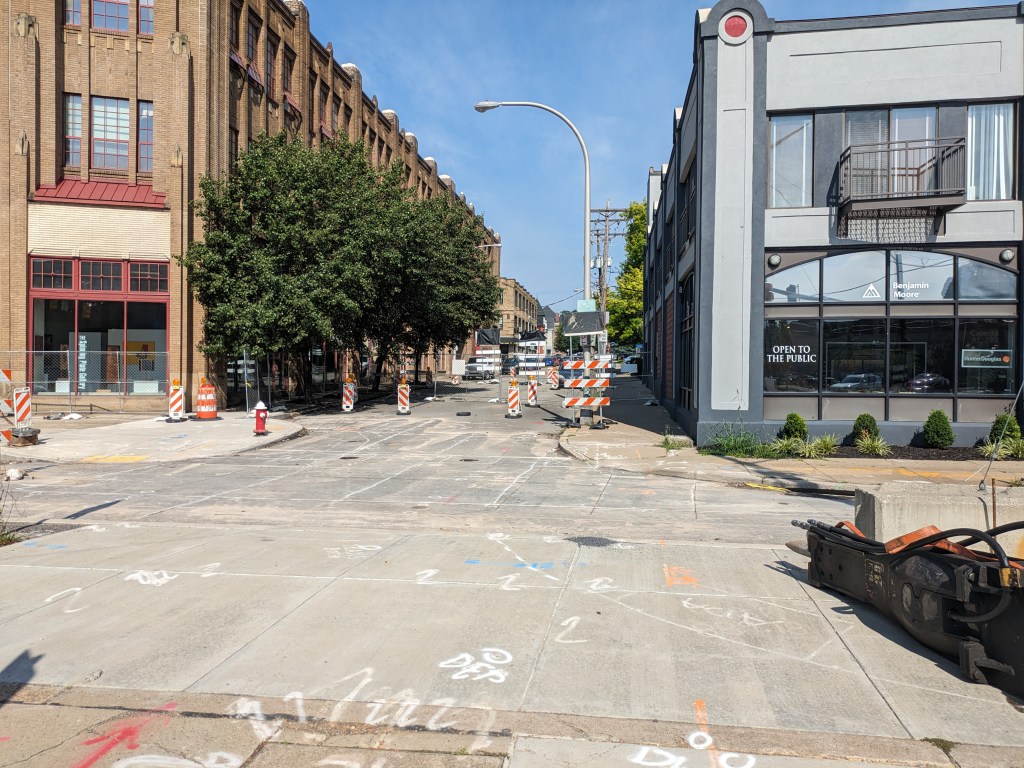 Around the site, the re-establishment of two-way traffic on Euclid Avenue continues; the renovation of the nearby apartment building also progresses, though now they look like they belong in California instead of Pittsburgh since the brick was covered up; and the former site of the East Liberty Lutheran Church remains vacant.