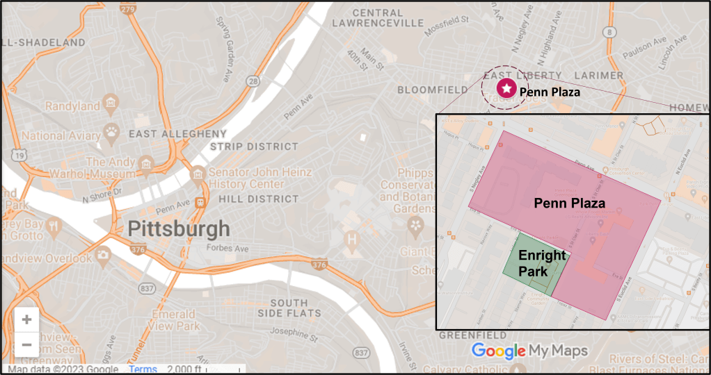 The former Penn Plaza Apartments was a group of large of apartments buildings that served a low-income population. After years of neglecting these apartments, the owner gave 200 residents notice to vacate within 90 days in the summer of 2015. By then, the surrounding neighborhood of East Liberty was a hopping place to live with low vacancy rates and the average rent much higher than what these residents could afford. There was a large outcry at the time, which only got worse as the owner’s plans for the site were understood. The owner wanted to swap some land with the City and change the zoning district to build a large scale mixed-use development: 54,600 sq ft of retail and 246,090 sq ft of office with accessory parking (see the application materials starting on page 54 from the final Planning Commission review and approval). After months of negotiation with the City and the community, the land and the zone change were given to the development while the affordable housing crisis in Pittsburgh only got worse and the former residents were forced to uproot their lives.
