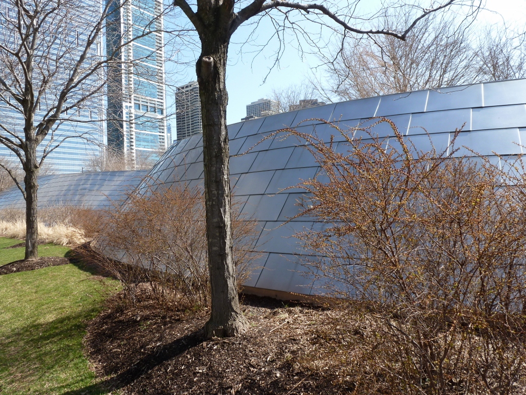 The Nichols Bridgeway connects Millennium Park with the Art Institute of Chicago. Both ends had space-age-like toughs, which I assumed were supposed to be a fancy drainage system. If their purpose is a drainage system, the upper end by the Institute has failed and been turned into a wishing well.
