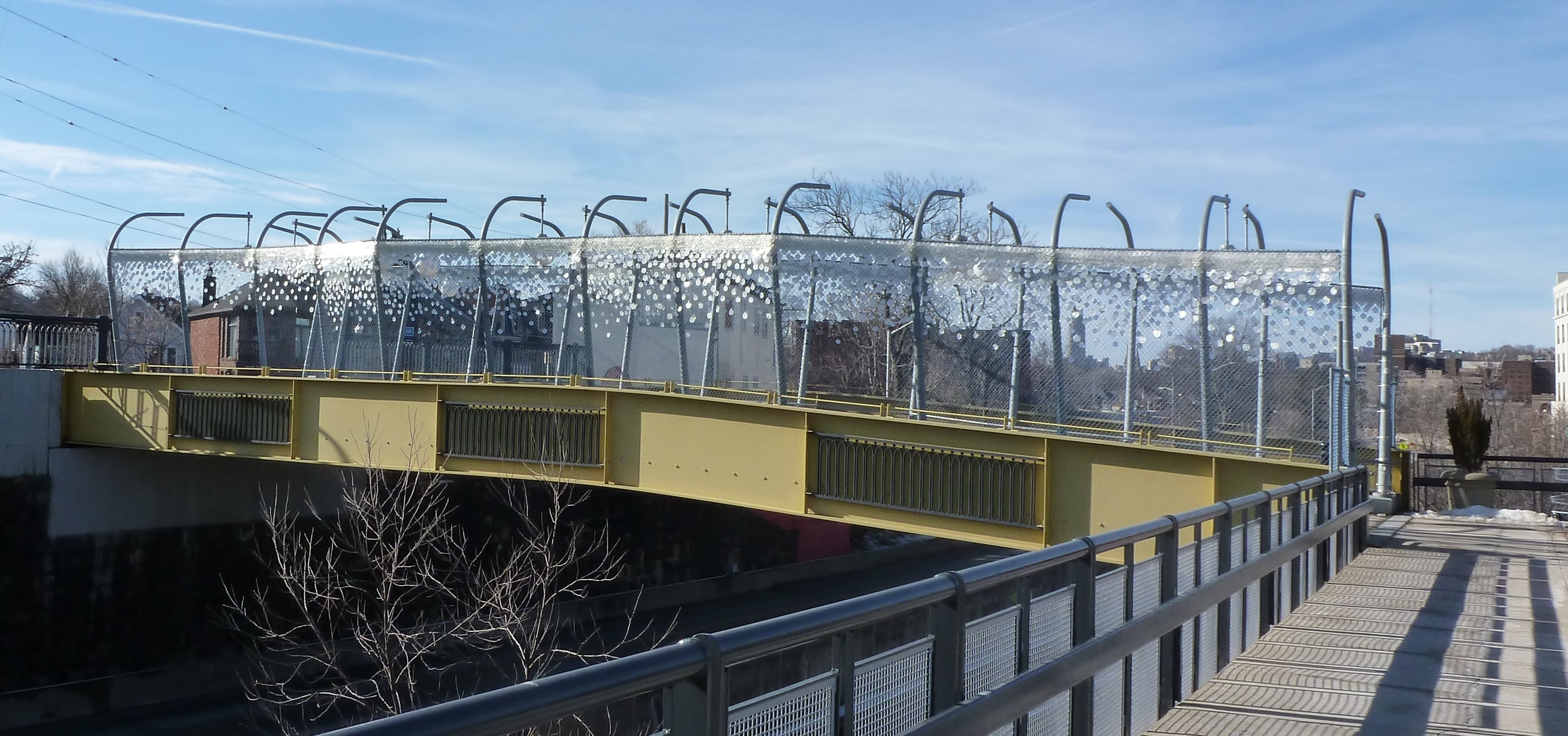 In Bethlehem, PA, I found just such an option on the Fahy Bridge. It is a fairly plain concrete bridge saved from the ugliness and gloom of many concrete bridges by using a functional, yet decorative, railing instead of the more common functional, yet ugly, chain link fence. This railing was installed during the 2016-18 renovation of the Fahy Bridge. Recent bridge renovations and replacements in Pittsburgh also feature more decorative railings. While the first of these new bridges in Pittsburgh tried to dress-up a chain link fence cage, the later ones are successful cage-free bridges even when they incorporate chain link fencing.* These examples give me hope that the days of caged bridges may be a thing of the past.