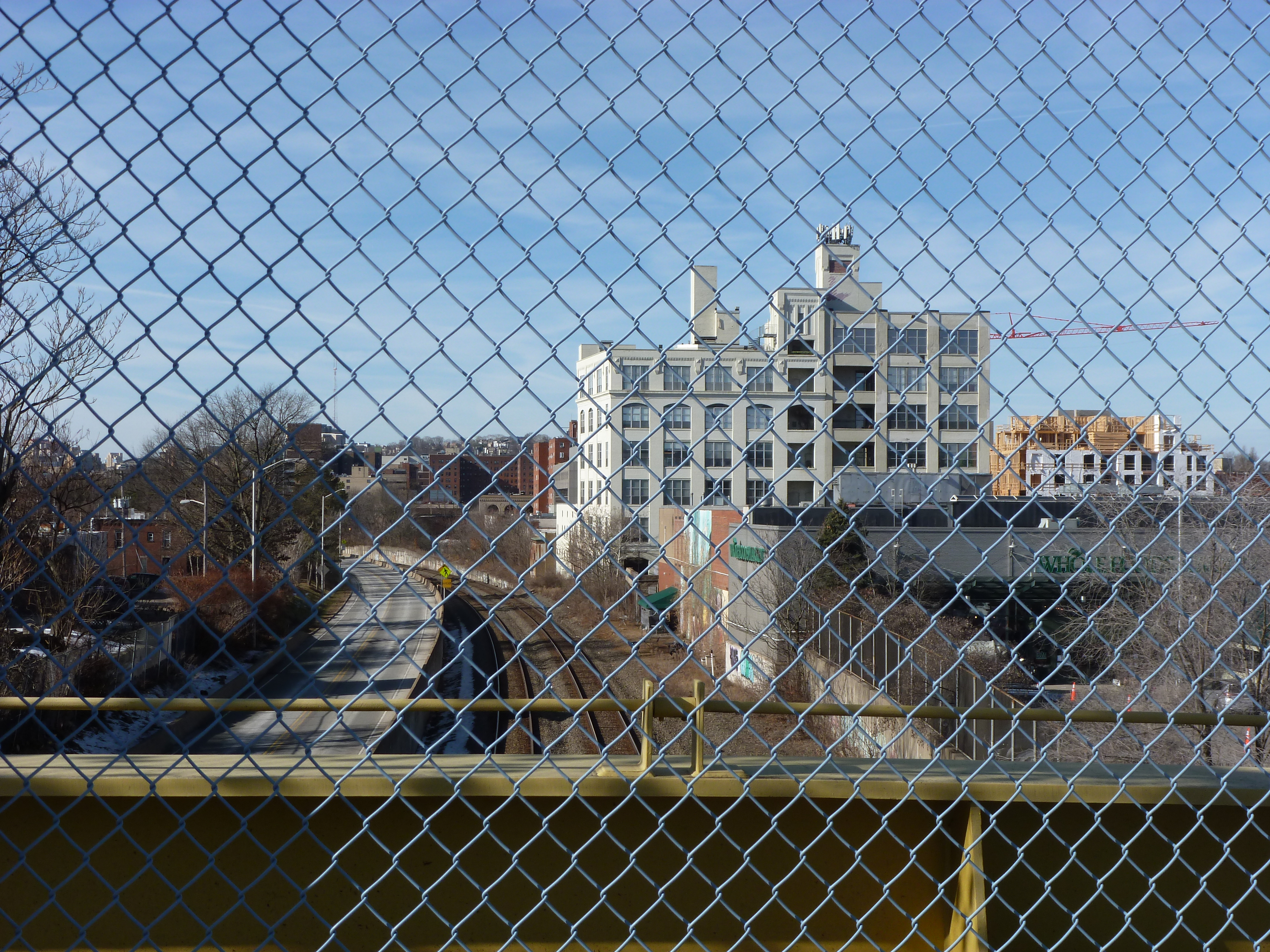 I was surprised to find that the highly controversial and massive redevelopment of the former Penn Plaza affordable housing complex was not visible from this bridge. Despite being only a quarter mile apart, the first phase of redevelopment is blocked from the bridge’s view by the iconic Motor Square Gardens building. One of the controversies of this new development is that affordable housing units were demolished without replacement for a series of commercial buildings which include the feature anchor of the pricey Whole Foods grocery store.