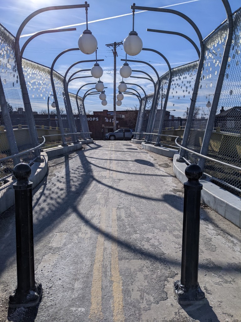 One of the bridges presumably supported by the Obama infrastructure funding was the brand-new pedestrian bridge across the East Busway connecting the Shadyside and East Liberty neighborhoods. This bridge is 10-years old this month. The “road” surface of the bridge hasn’t held up very well: the paint was faded and the top surface was patchy when I returned this month. On the other hand, the over-the-top lamps and giant glitter looked like they have held up well. Though it’s hard to say in wintertime, the landscaping between the cage and the bridge walls also appeared to be well maintained.