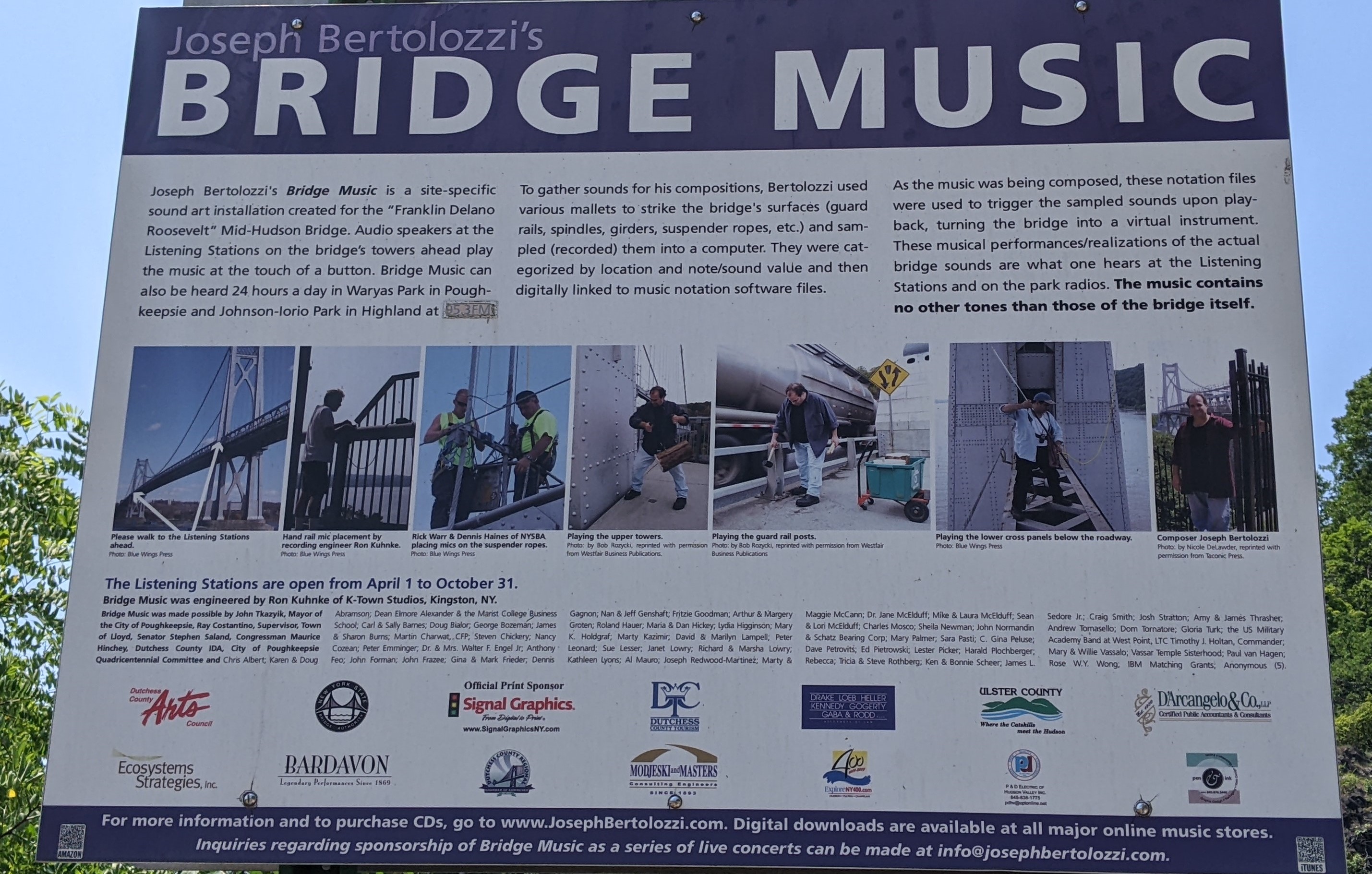The Mid-Hudson Bridge has a unique additional feature. In 2009, Joseph Bertolozzi used the bridge as the sole instrument in his sound-art installation Bridge Music (see Bertolozzi’s official website for more information). There are two listening stations on the bridge, one at each pier, and those driving across the bridge can also access the music on their car radio. The full Bridge Music is available on CD and Bertolozzi has several YouTube videos of the music. Below is a sample of the music I captured in a video with views of the Hudson River and the two bridges (the Walkway Over the Hudson is the second bridge).