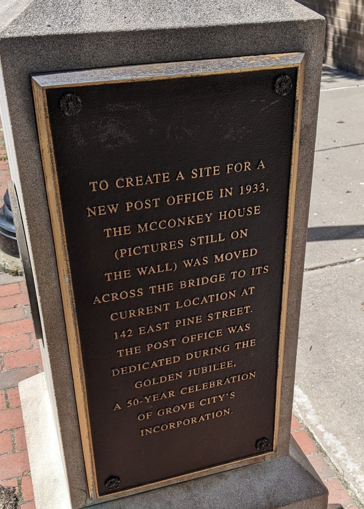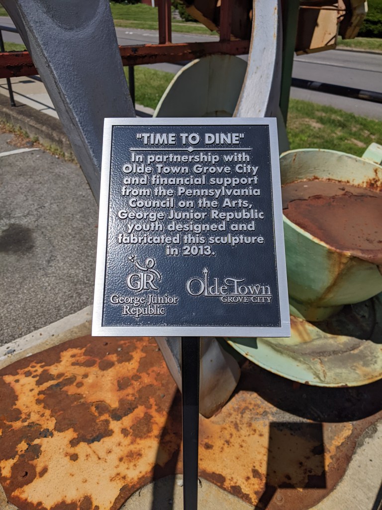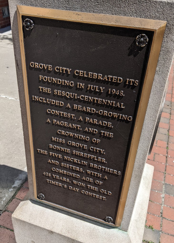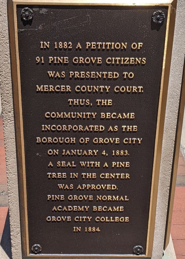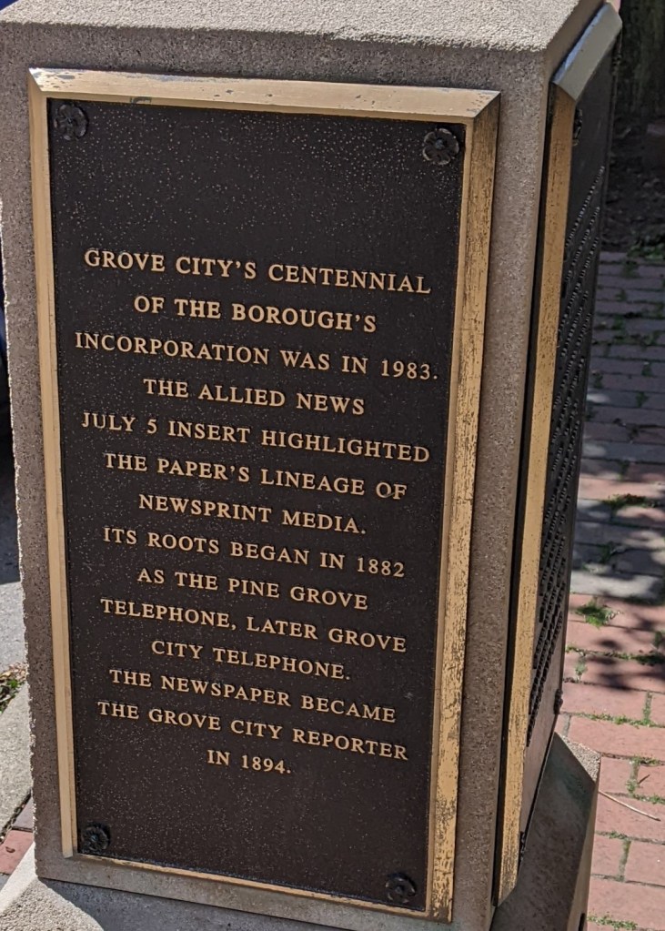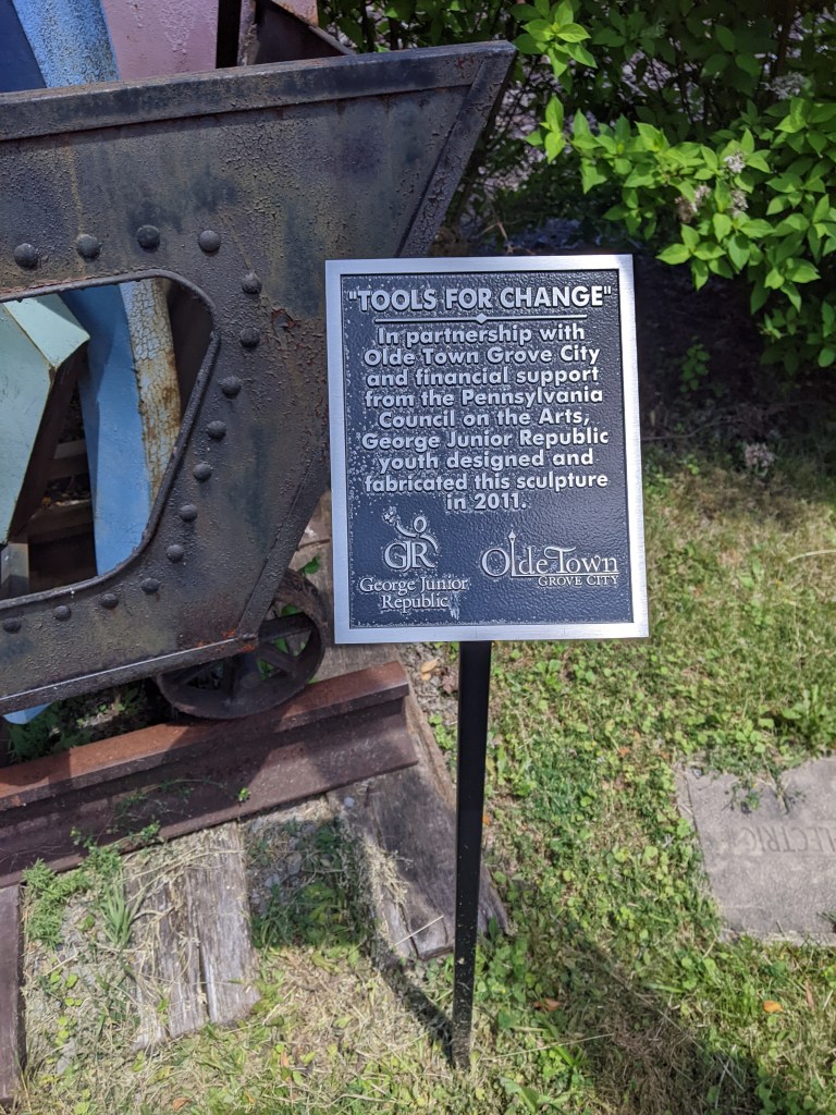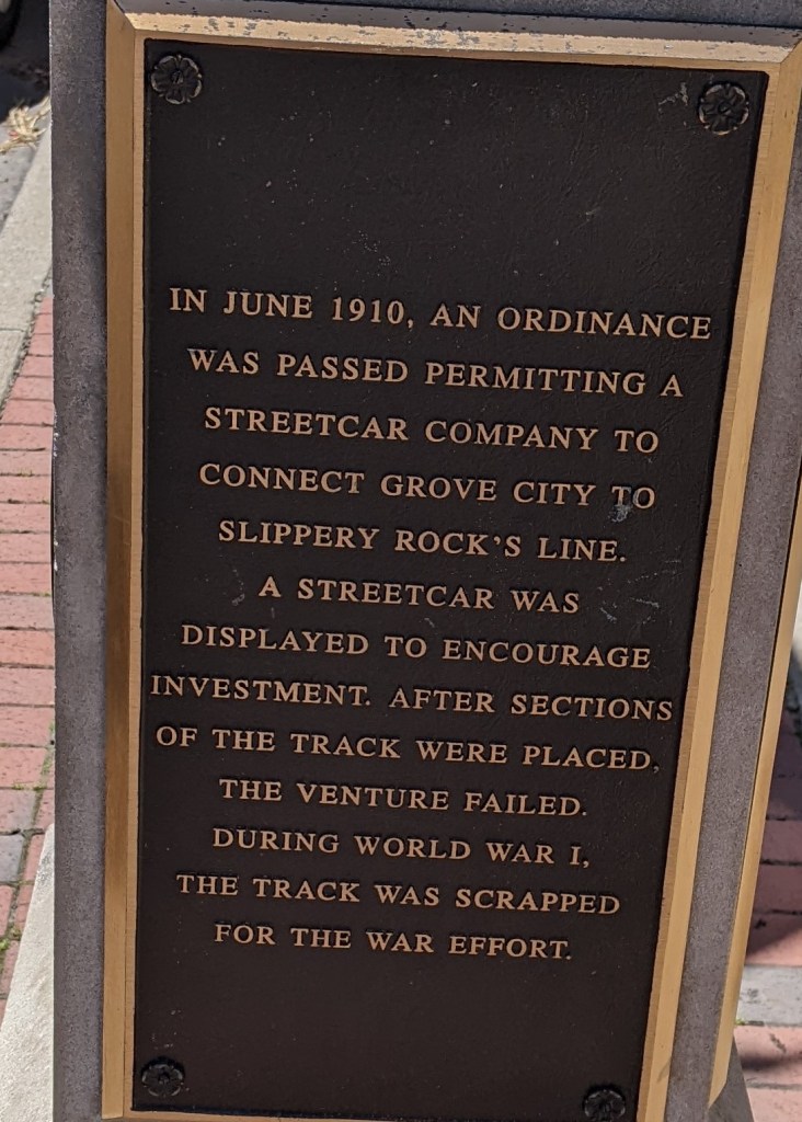 I didn’t have to go far to learn more about Grove City to flesh out the observations I made while walking the bridges. The Borough helpfully installed history markers along the historic business core of South Broad Street. I photographed 33 of the plaques, which I think is all, for anyone interested in virtually visiting these history markers. Of course, these could also be used in the debate over art vs. sign as they also fall into the nuanced mess of the grey area.