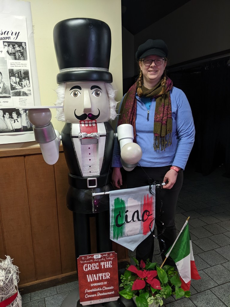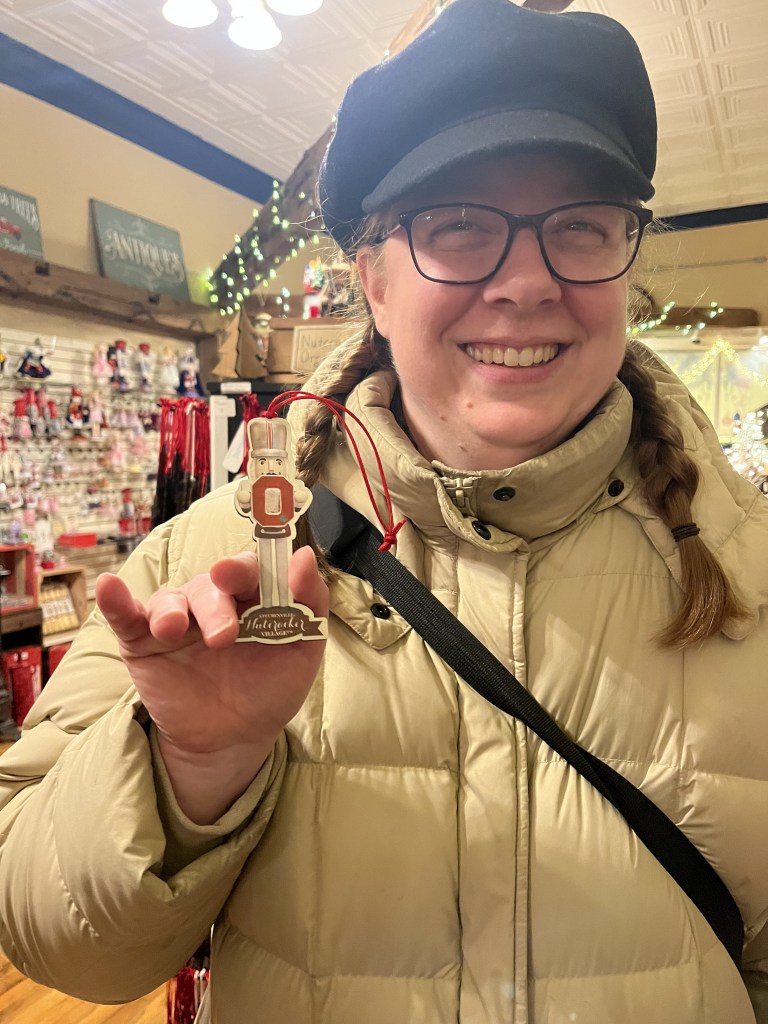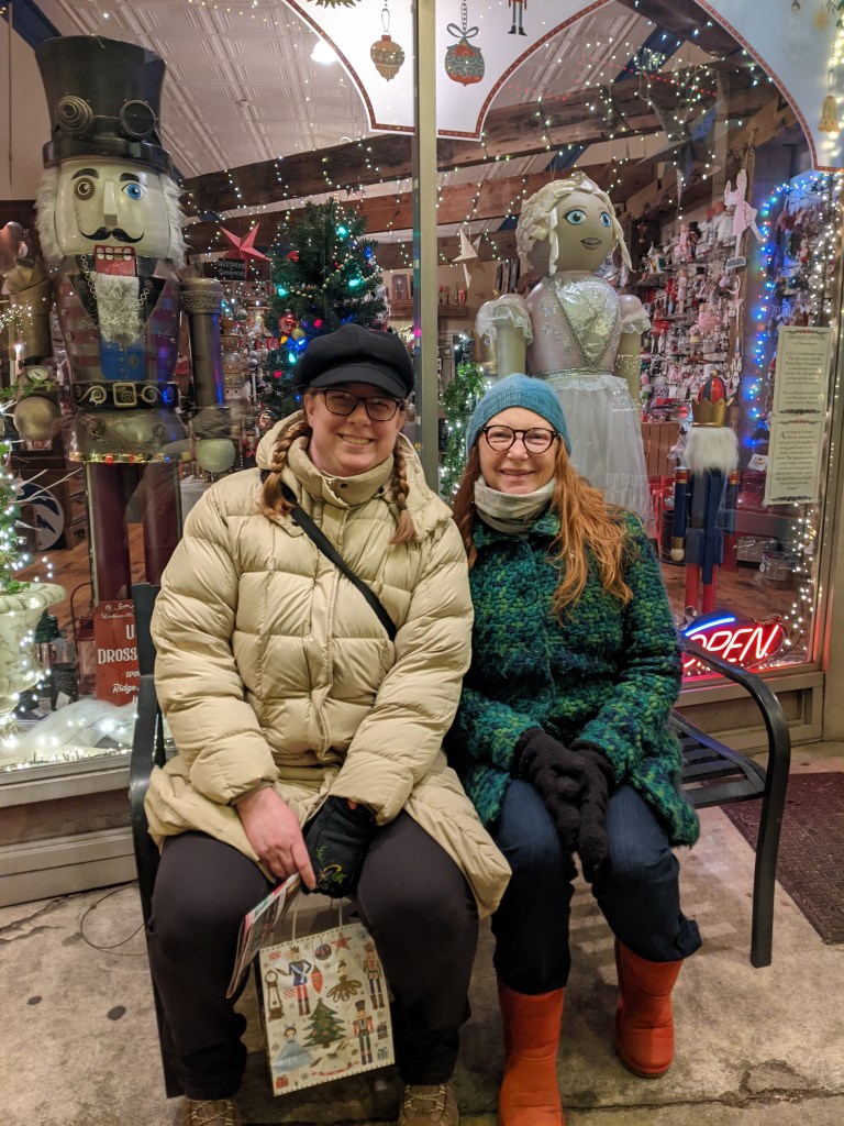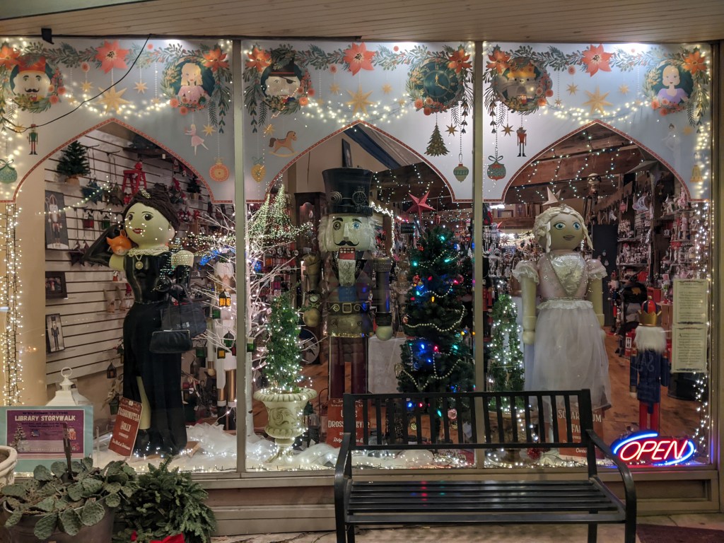 Between the two of us, Shelly and I photographed 145 of the nutcrackers and saw at least 40 more (we were cold and tired toward the end of our walk and passed by many without stopping to photograph them). Below I share a sampling of our favorite nutcrackers. There is quite a range of nutcrackers from the standard looking “Junior” to the punny “Dr. Cara Lot” and “Fashionutsa Holly,” the far left nutcracker in the window display, to the ornate “By Way of Budapest.” A wind storm that passed through the region a couple weeks ago damaged the Ohio State nutcracker, our waitress’s favorite, so we stopped at Drosselmeyer’s Nutcracker Shoppe where I posed with the ornament version of it.
