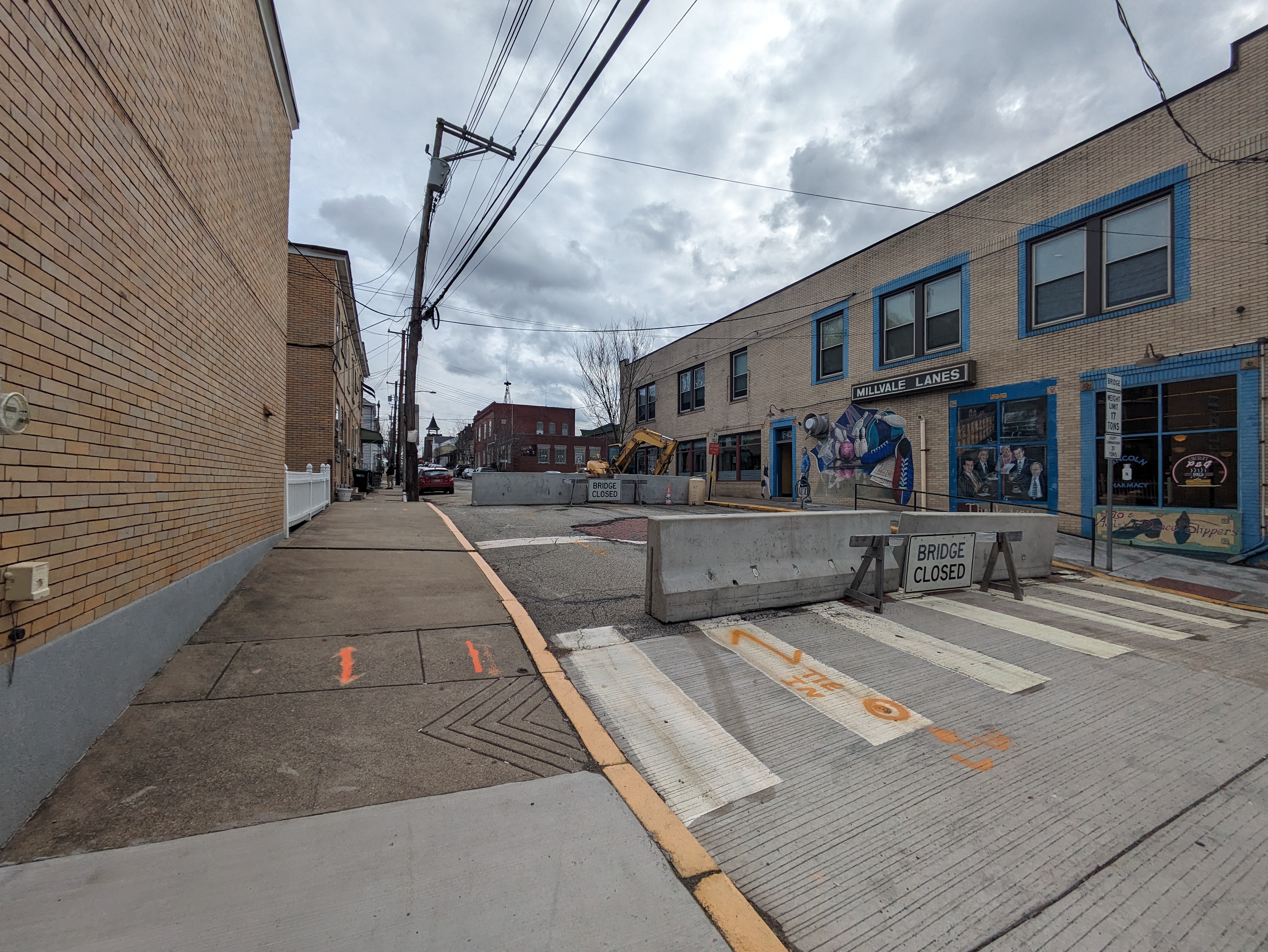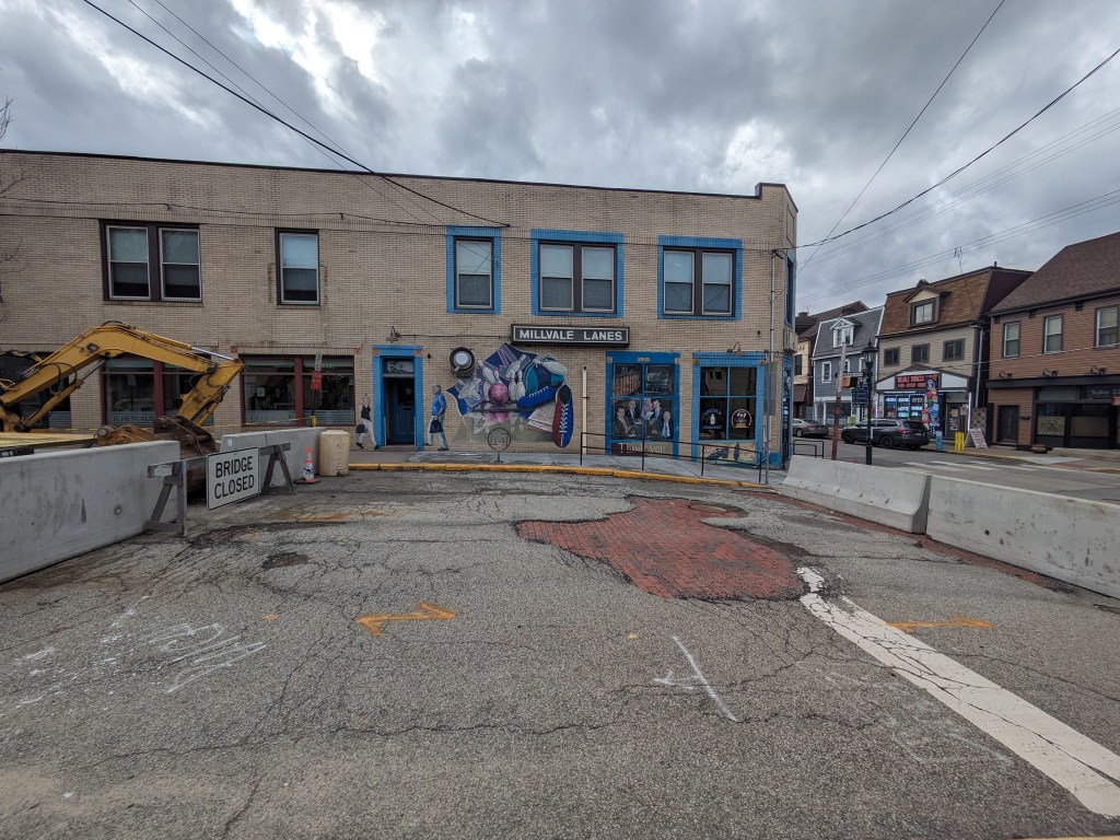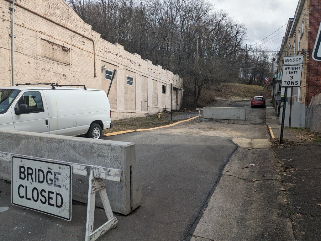 Then, in 2024, while I was primarily home-bound due to Long COVID and my mom sometimes took me along on her errands to help me get out of the house, she wanted to stop at a shop in Millvale. I thought I would sit in the car and wait for her, but as she was looking for a parking space, I noticed a barrier across one of the roads we passed with a sign that appeared to say “Bridge Closed.”
