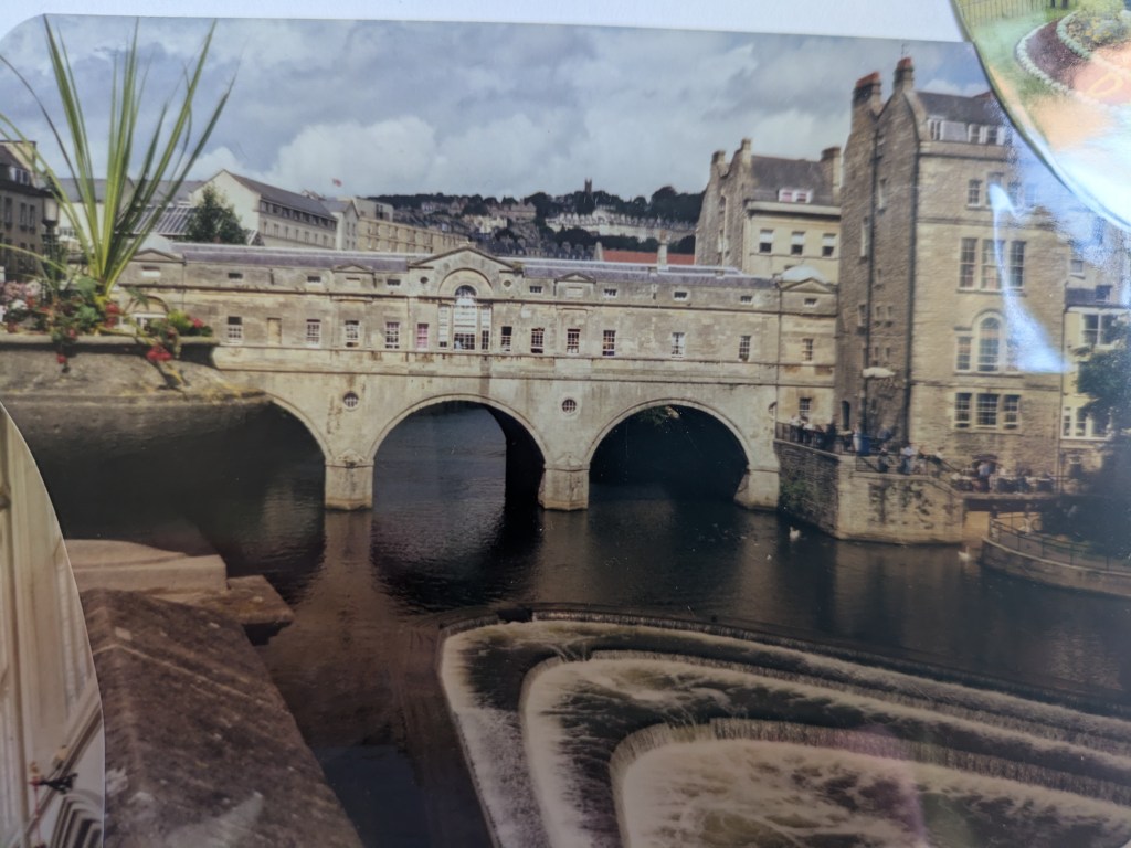 My first encounter with buildings on bridges was Pulteney Bridge in Bath, UK (photo of photo below). I was 13. It would be over a decade before I would start intentionally walking bridges. At that time, I declared, “That is one of the coolest bridges I’ve ever been on. There are shops on both sides of the road. You can’t tell you’re on a bridge.” (Notice the echoes of my later musings on the “bridges” of Chicago.)