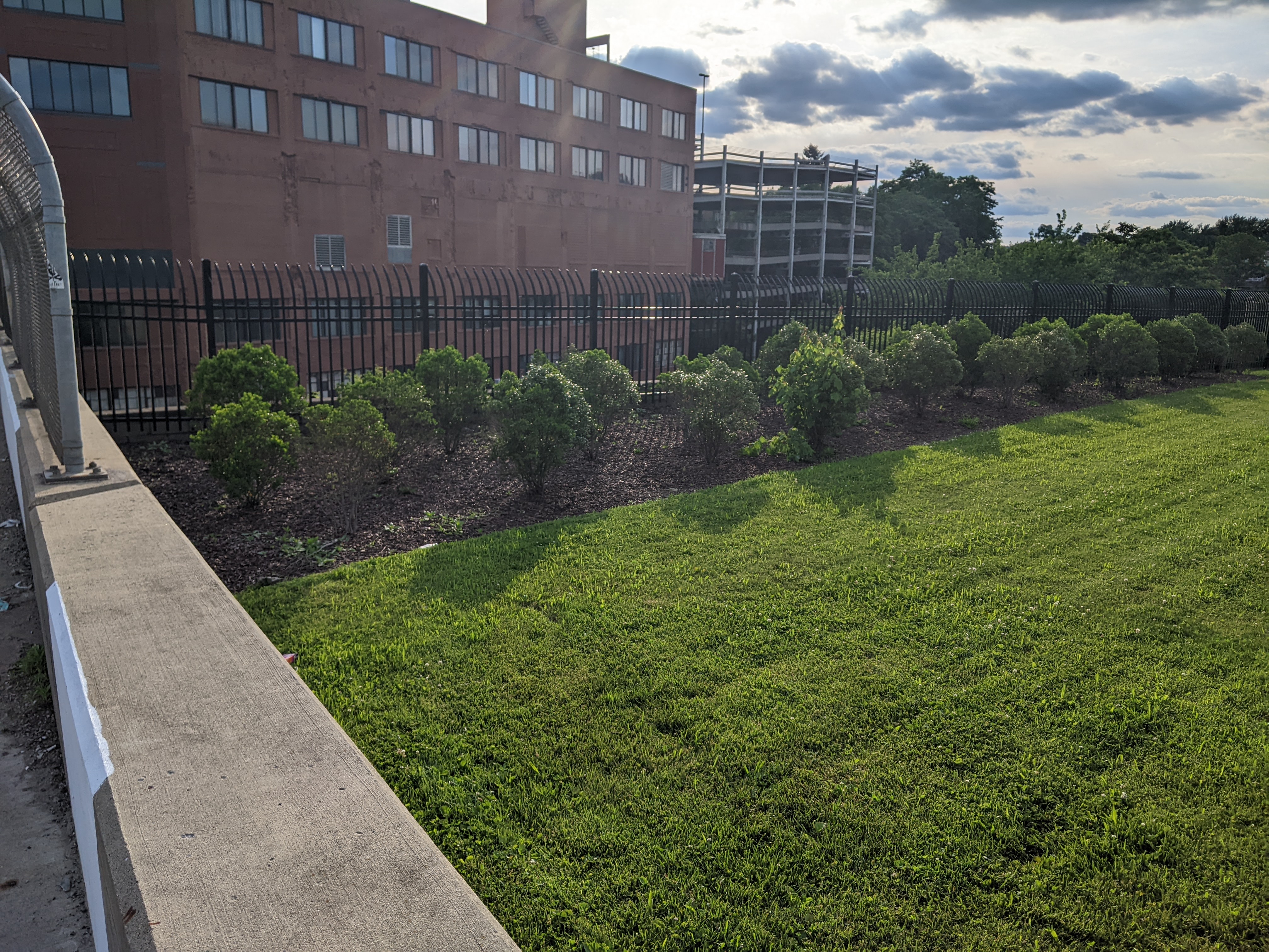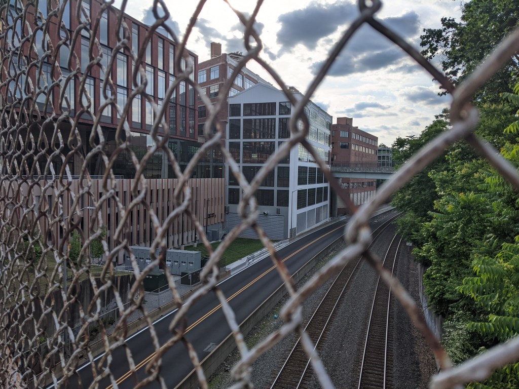 Between the Baum Boulevard and Centre Avenue Bridges is a site that has had a much longer life. Originally a Ford plant and showroom, this building and site were redeveloped by the University of Pittsburgh (Pitt) into a research and development space with laboratories, offices, an auditorium, and parking (Pittsburgh Business Times, May 5, 2022). Prior to the redevelopment, this site had caught my eye as I rode the bus by every day on my way to Pitt. The floating doorways and loading docks captured my imagination. My imagination now speculates that these openings were used to create connections with the new addition seen in the fourth photo pair. The pedestrian experience walking by the sloped parking lot in the early 2010s wasn’t pleasant. While the sidewalks felt larger now, the experience was still unpleasant as I felt like I was walking through a pedestrian unfriendly loading and service area while the cantilevered building towering over me felt oppressive. The final photo pair shows the sidewalk experience on both sides of the new addition.